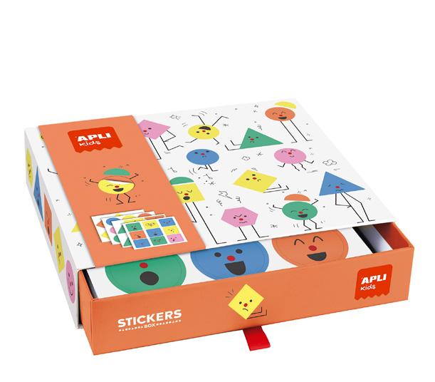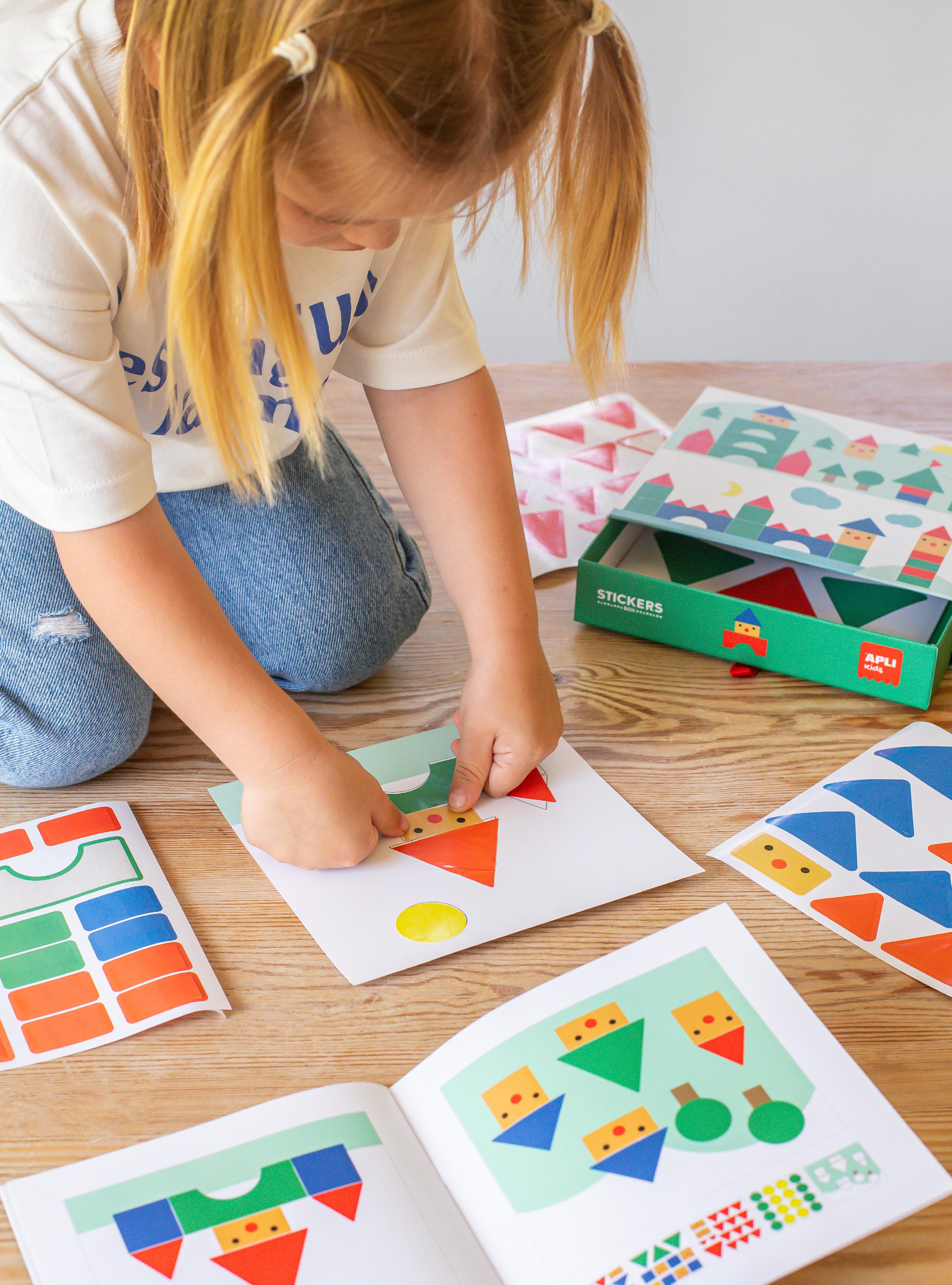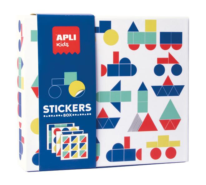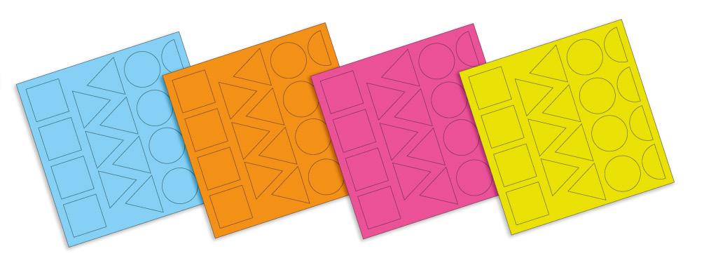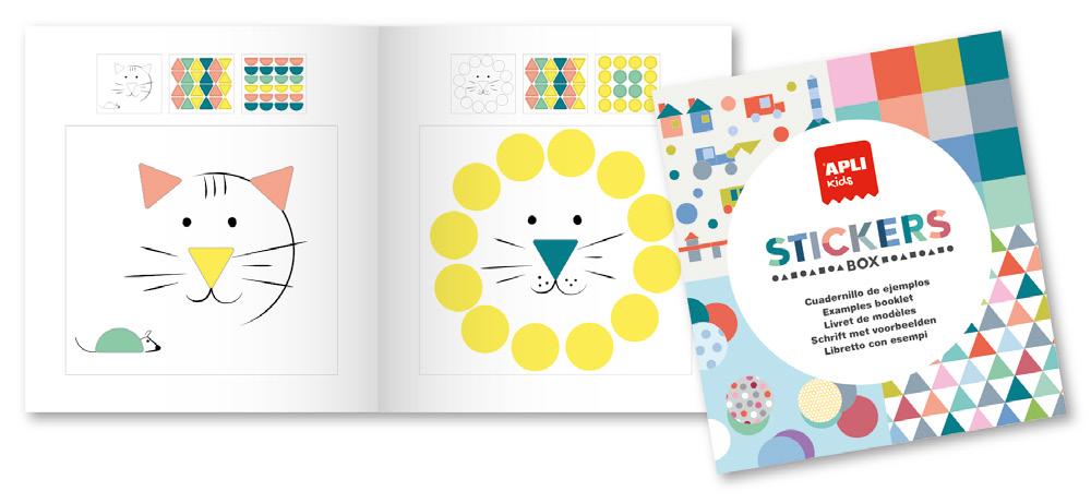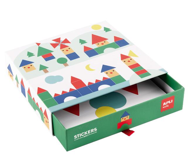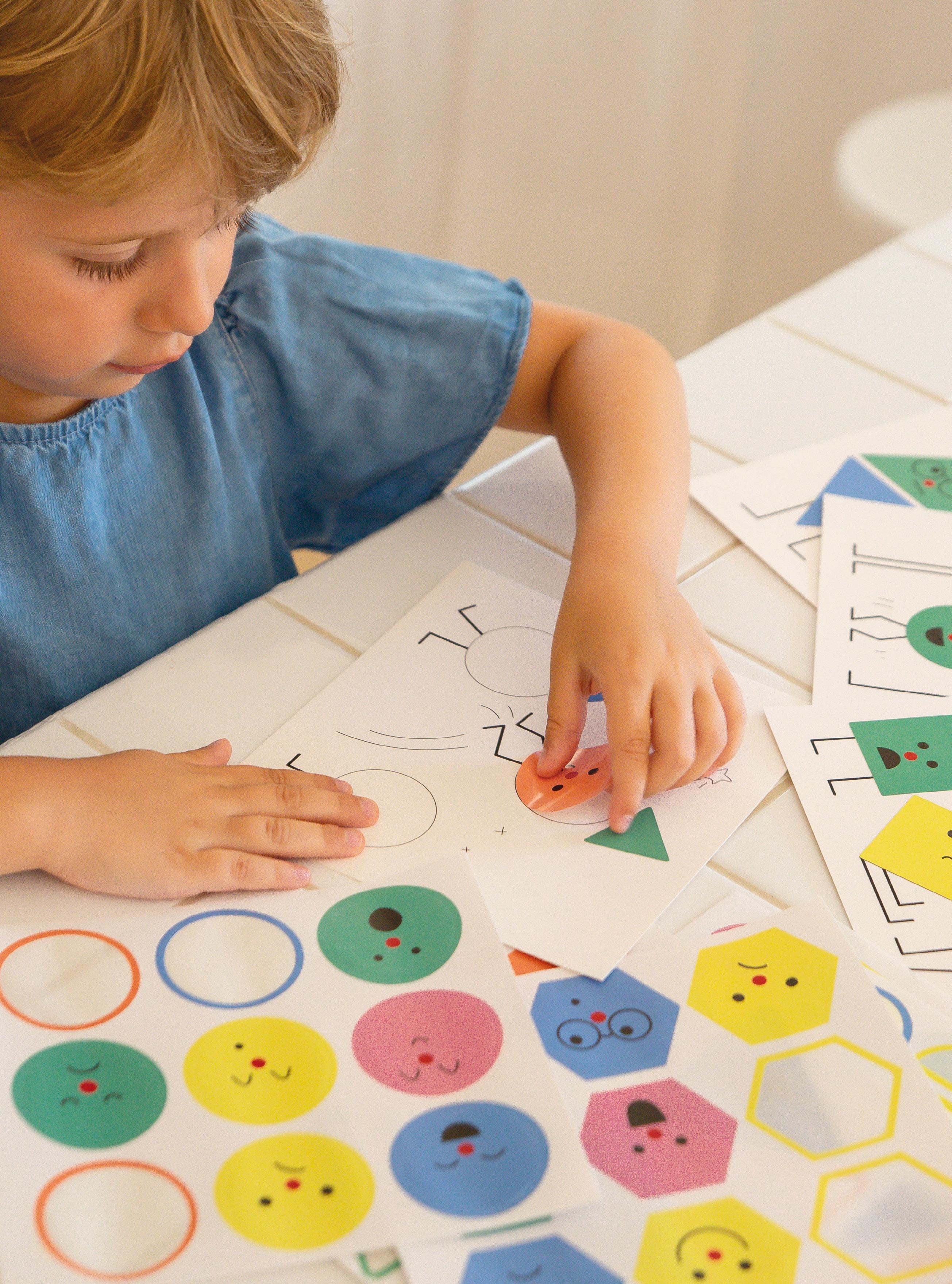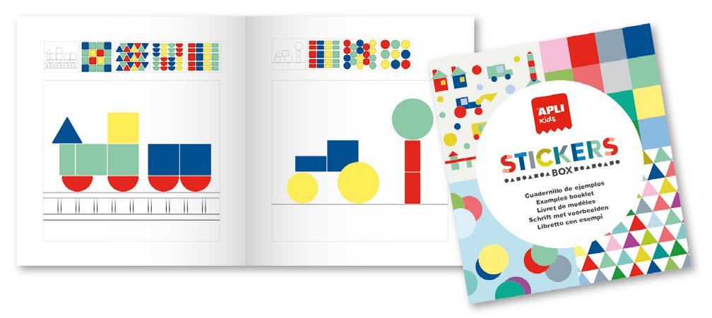 Content: 16 illustrated cards (8 drawings x 2) | 10 sheets of removable educational stickers of geometrical shapes | 1 full-color example guide