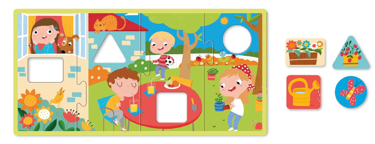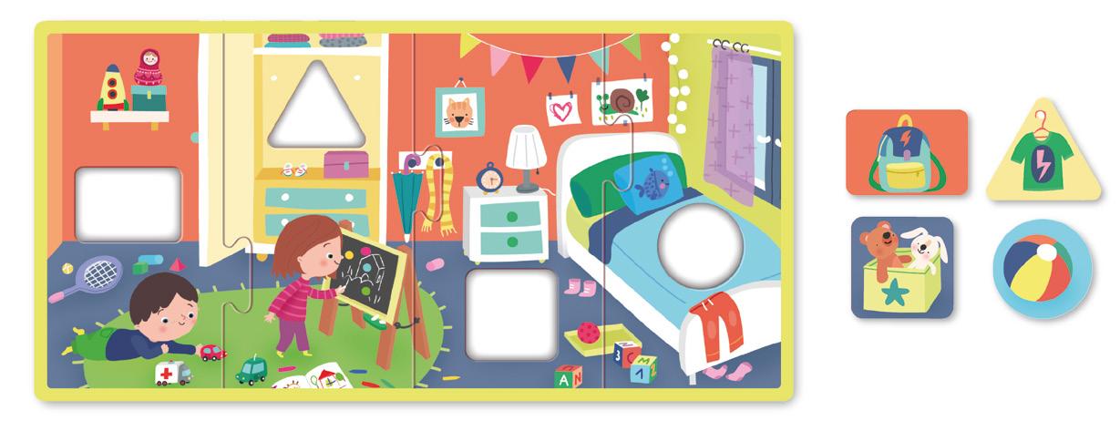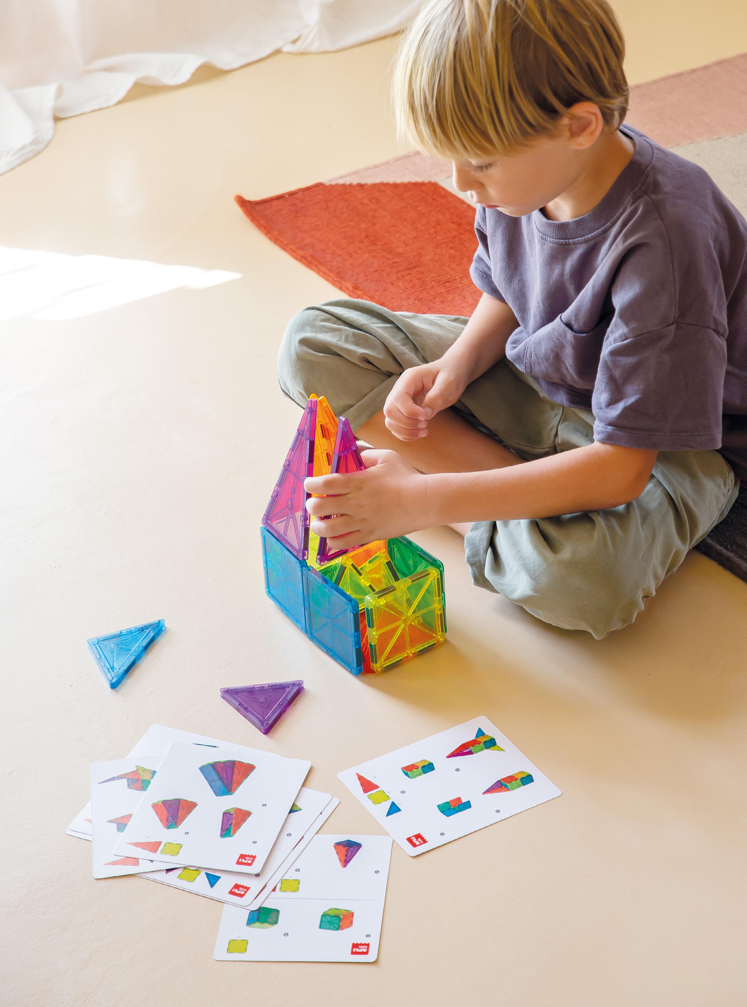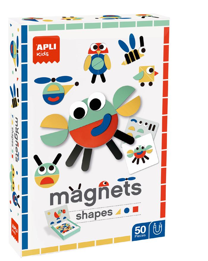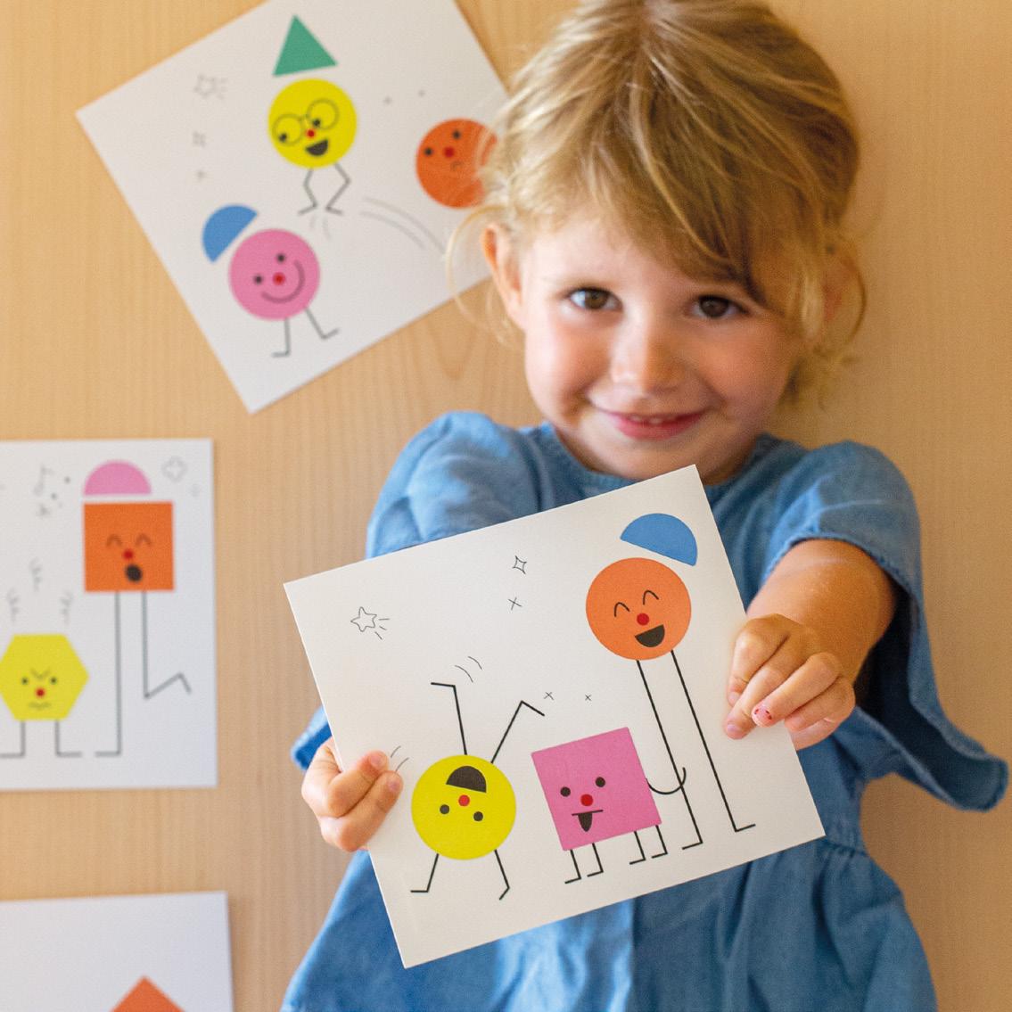 Content: 16 illustrated cards (8 drawings x 2) | 10 sheets of removable educational stickers of geometrical shapes | 1 full-color example guide
