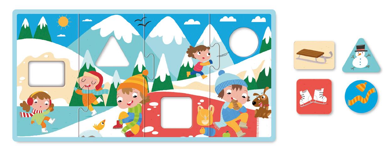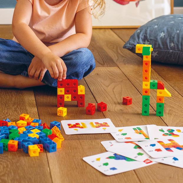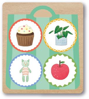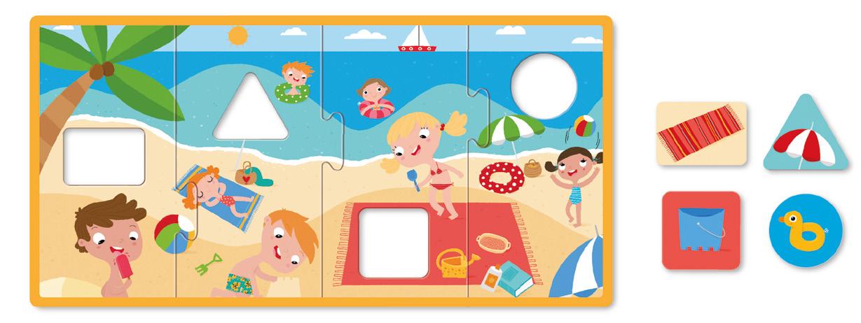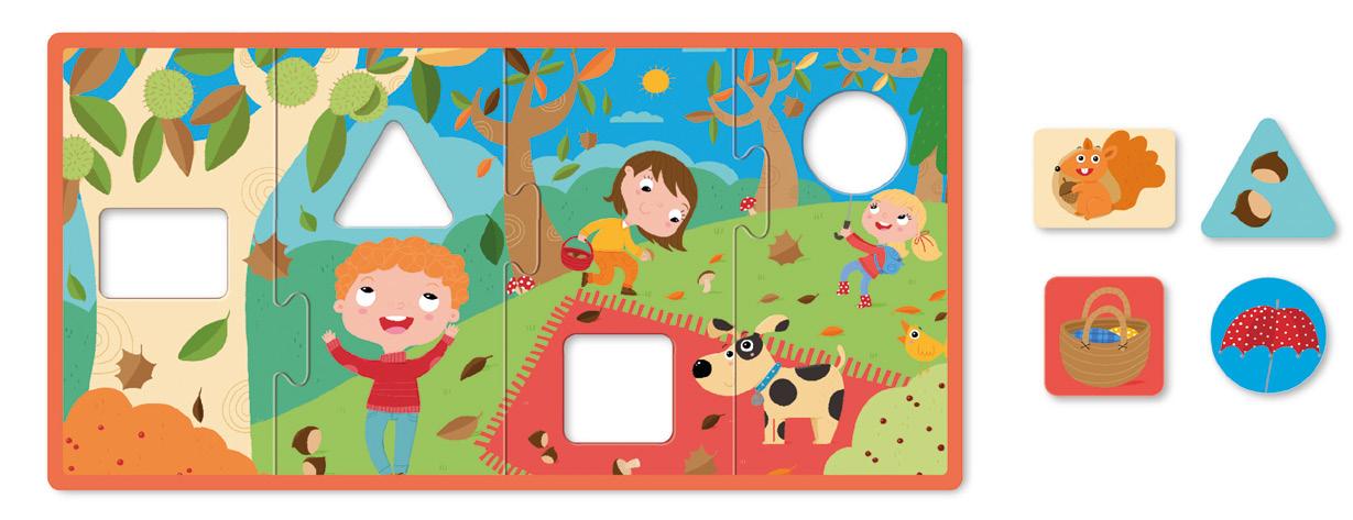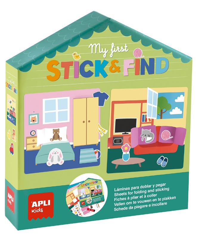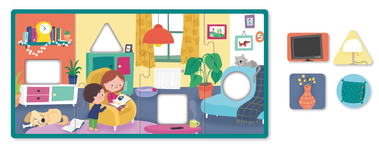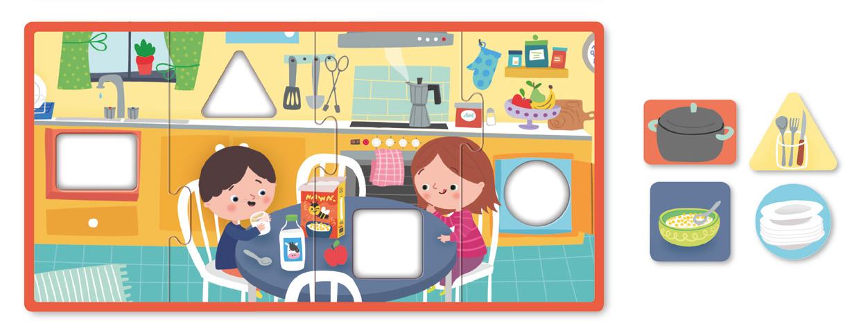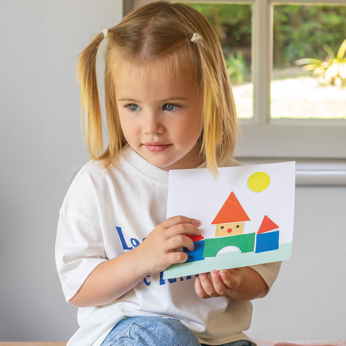 Content: 16 illustrated cards (8 drawings x 2) | 10 sheets of removable educational stickers of geometrical shapes | 1 full-color example guide