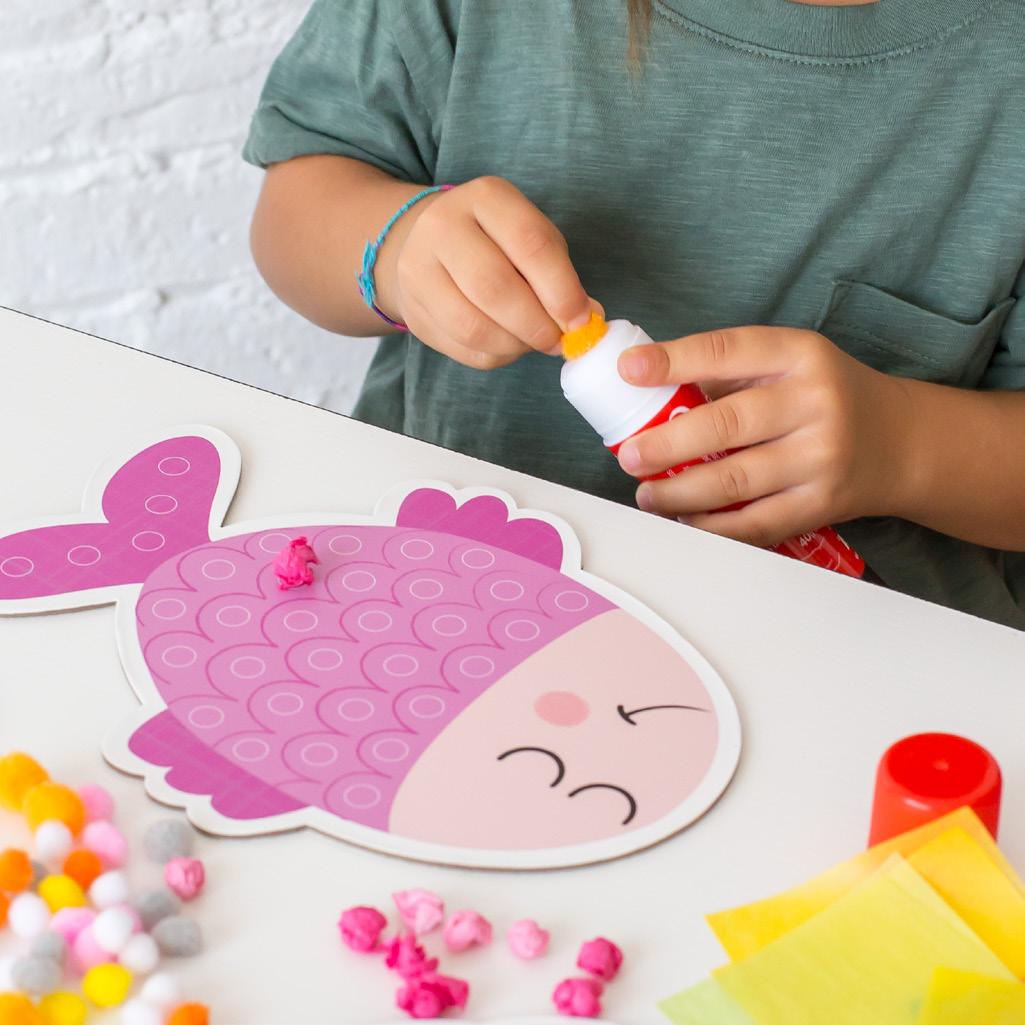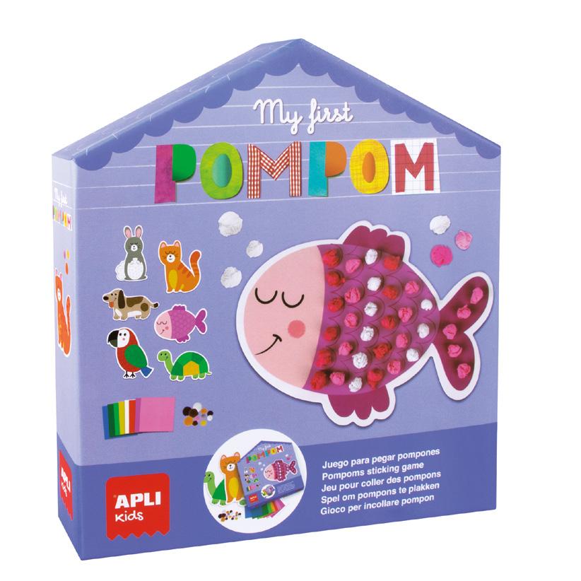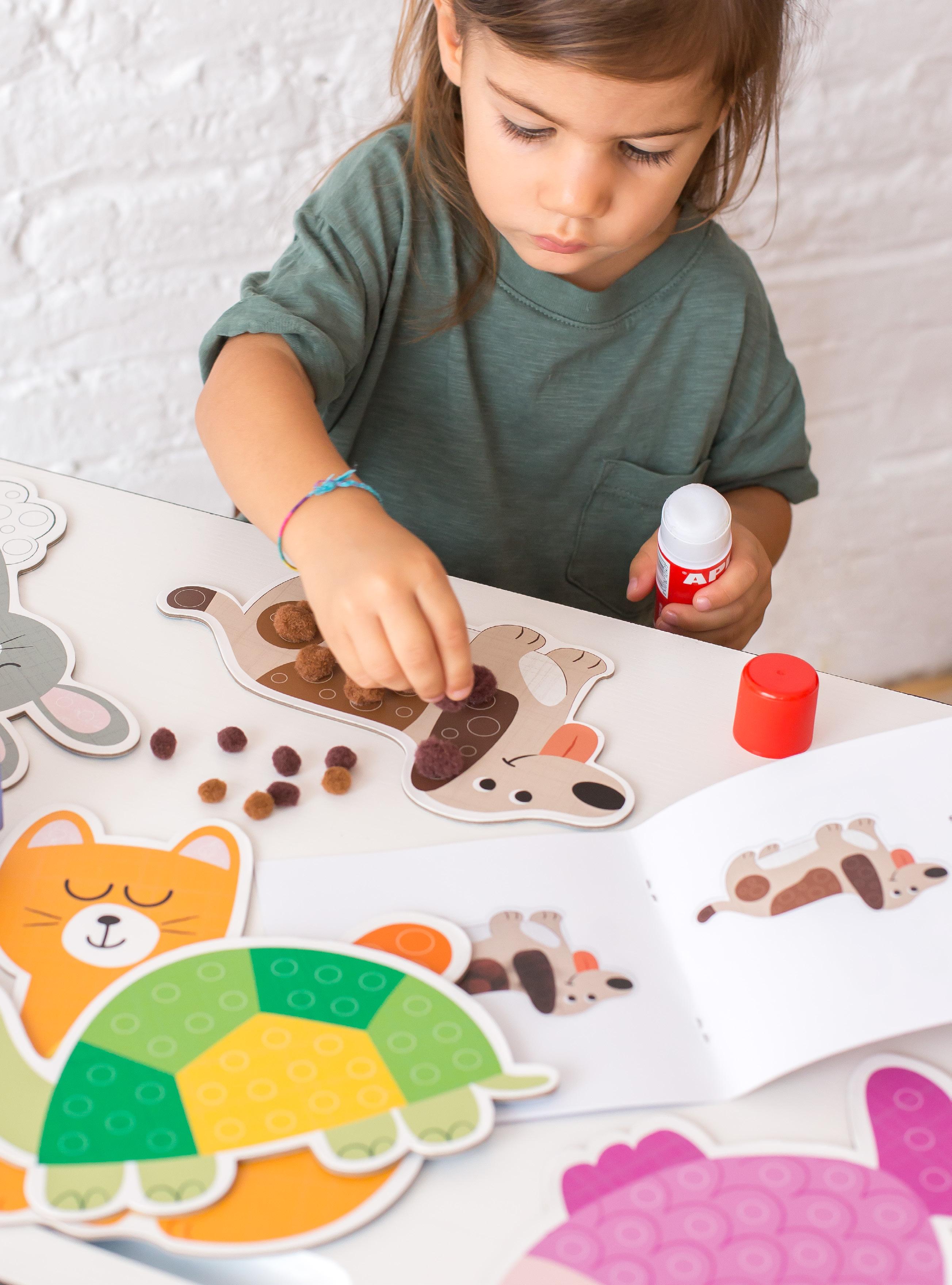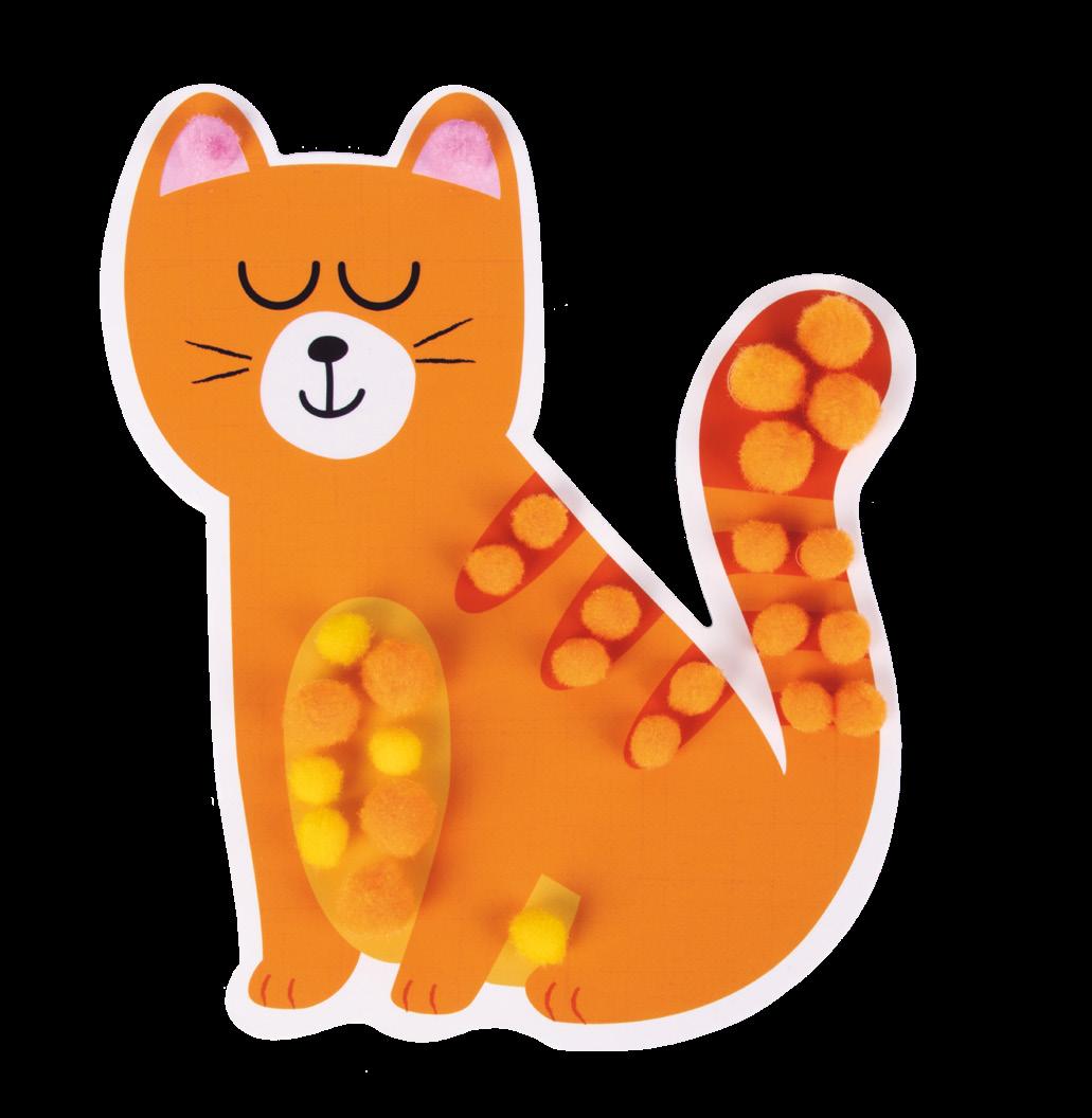 Content: 6 pre-cut cards with the shape of different pets | 102 sheets of tissue paper 74 pompoms of different colors and sizes | 1 glue stick of 20 g | 1 book with instructions and examples