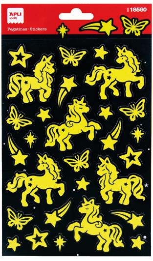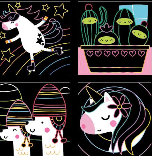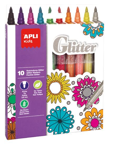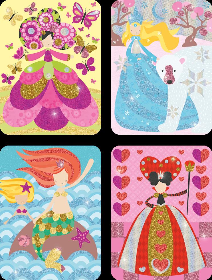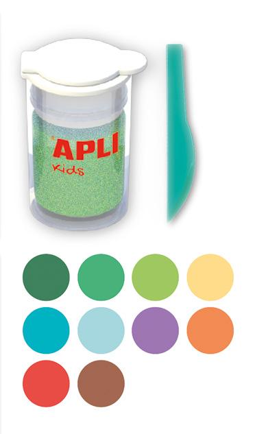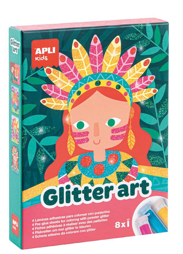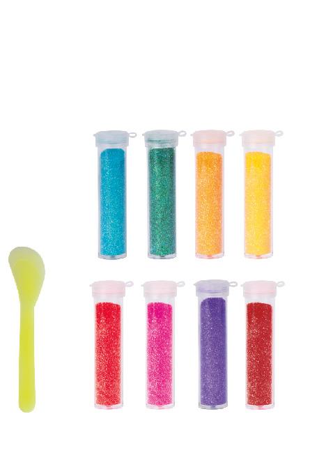 Content: 4 full color printed adhesive and pre-cut cards to color with glitter | 8 jars of colored glitter | 1 plastic tool | 1 sheet of instructions | 4 guide cards with examples