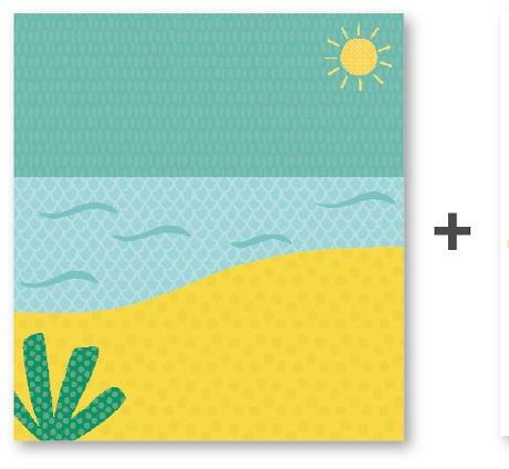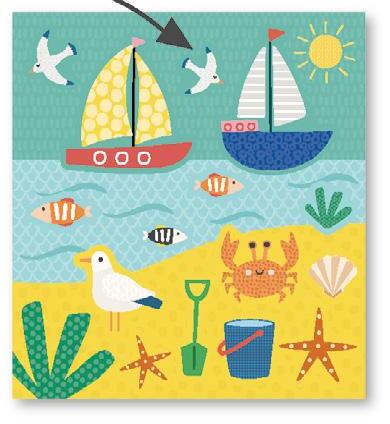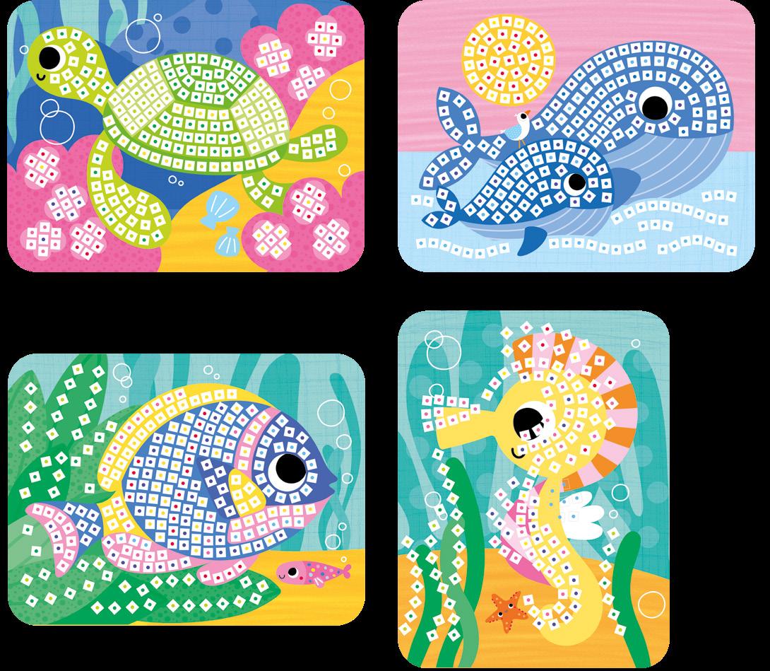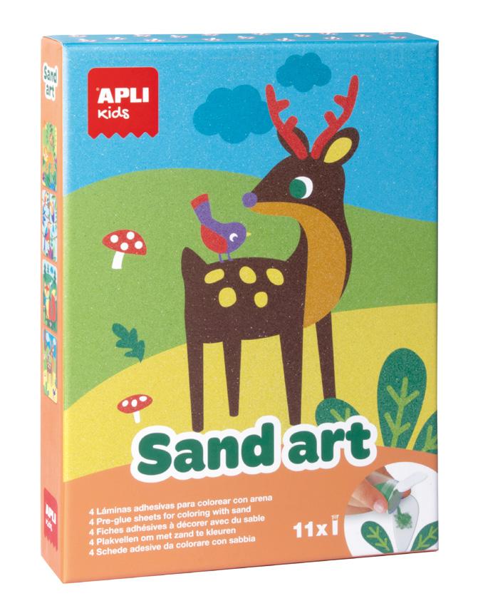 Content: 4 full color printed adhesive and pre-cut cards to color with sand | 10 jars of colored sand | 1 bag of white sand | 1 plastic tool | 1 sheet of instructions | 4 guide cards with examples