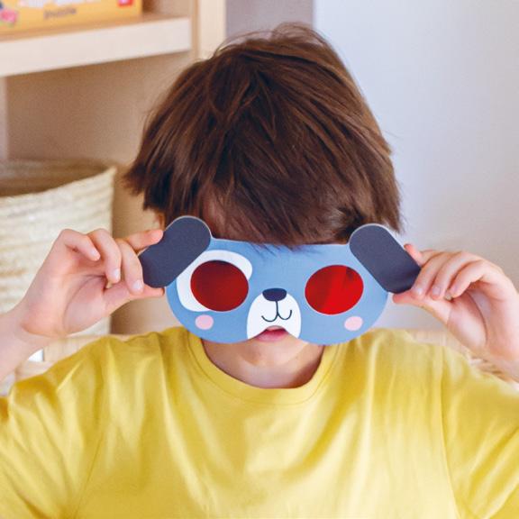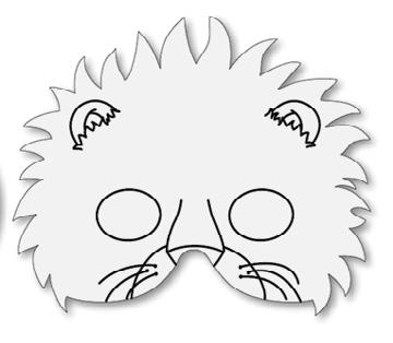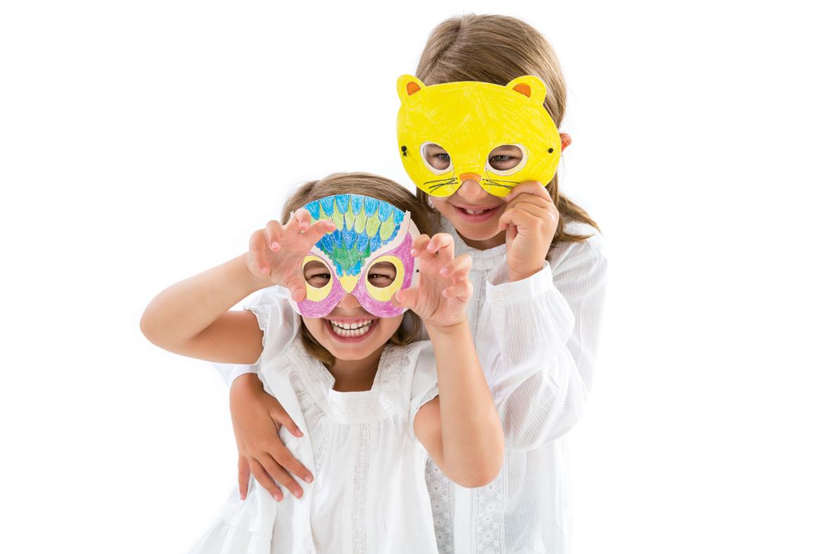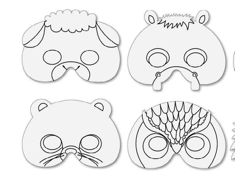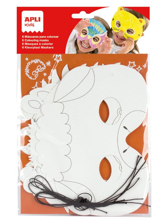 Content: 6 cardboard masks to color in: Sheep, Hippo, Giraffe, Cat, Owl and Lion | 6 elastic bands
