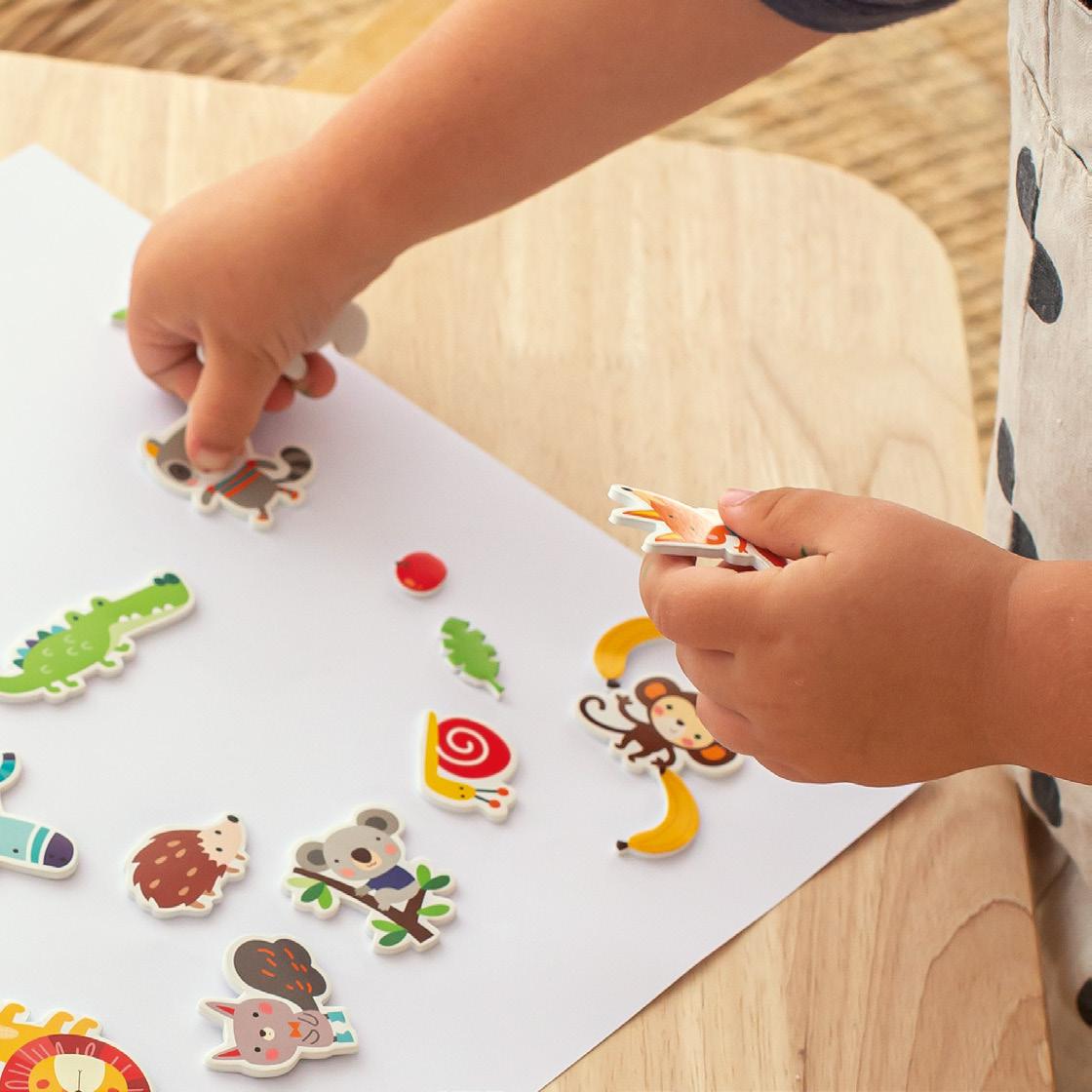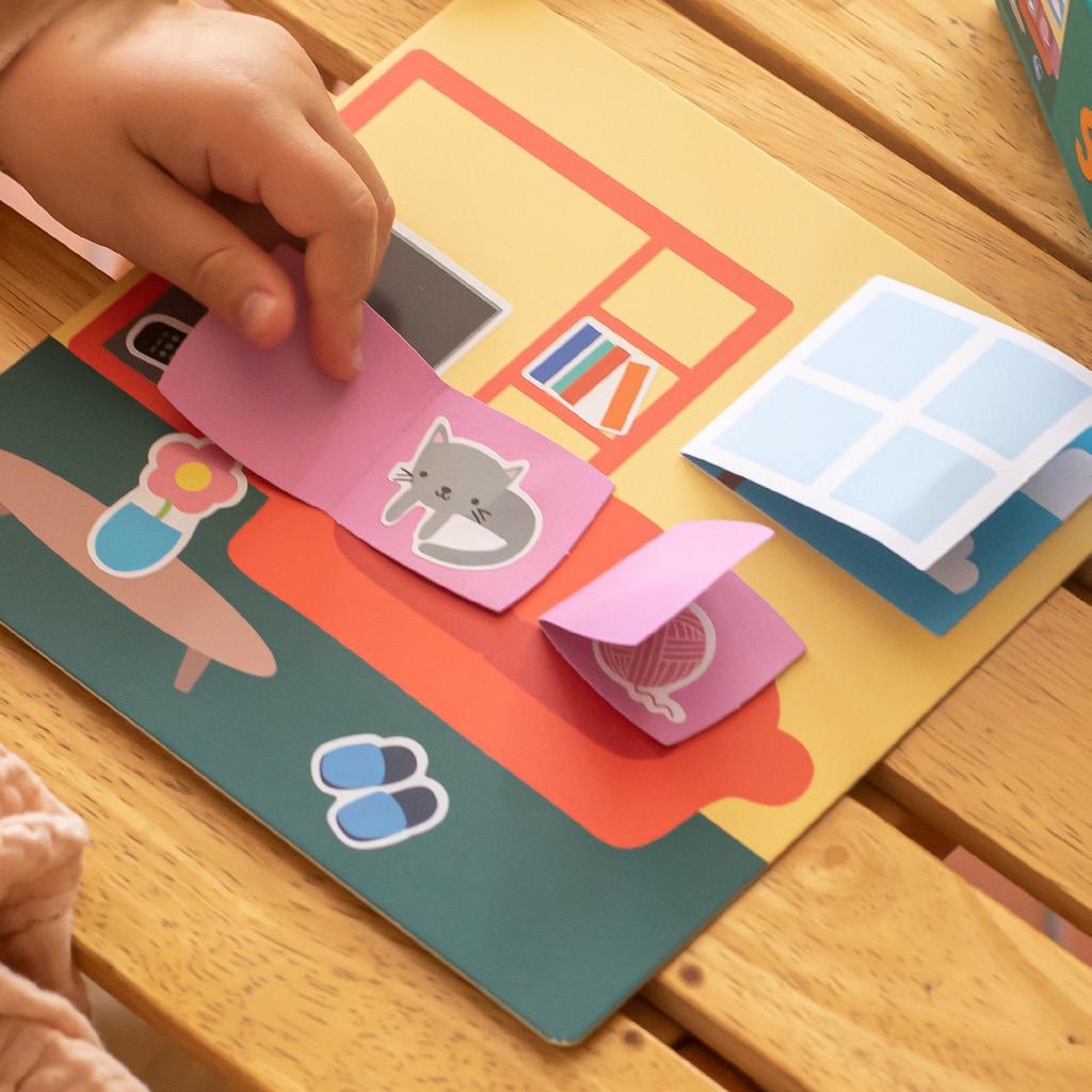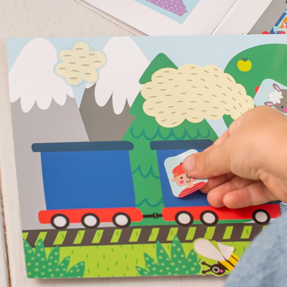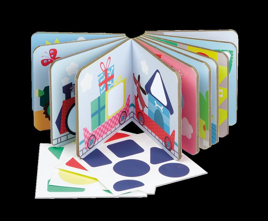 Educational book with 10 rigid cardboard pages 3 mm thick | 4 sheets of removable educational stickers to complete the drawings | Book