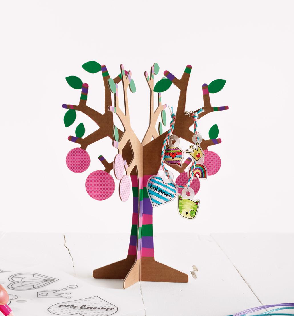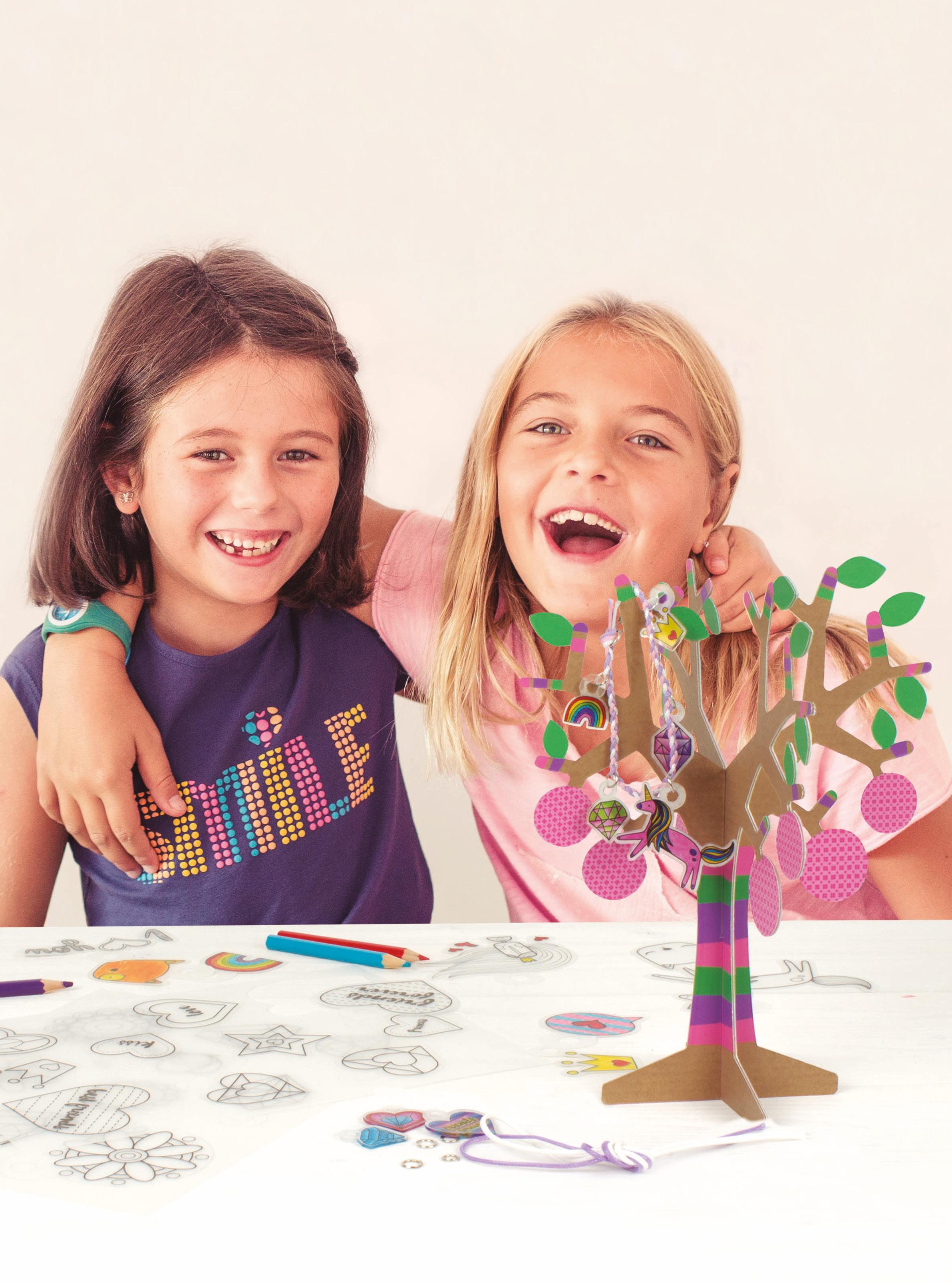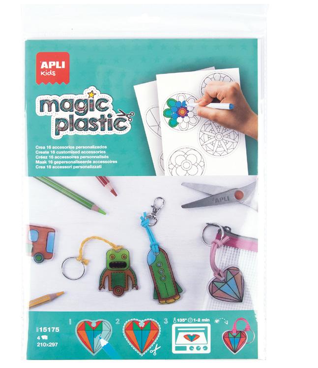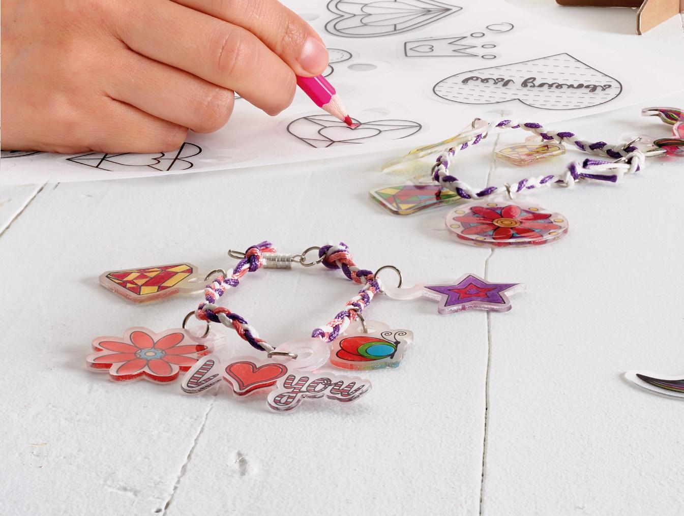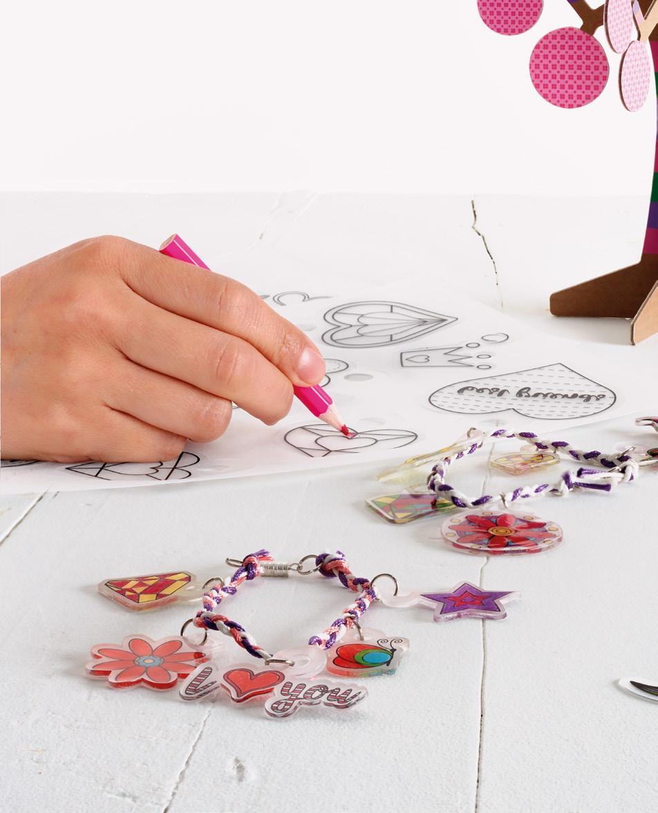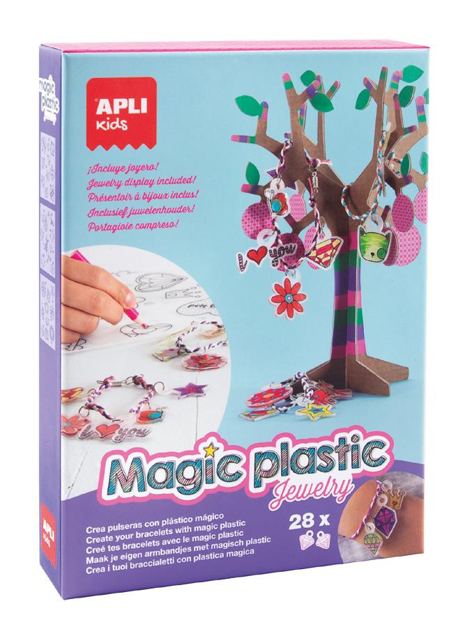 Content: 3 Magic Plastic sheets with printed and pre-cut designs | 6 colored pencils | Colored threads | Accessories to create the bracelets 1 tree Jewellery display | Languages: ESP, EN, FR