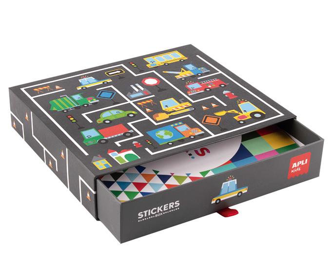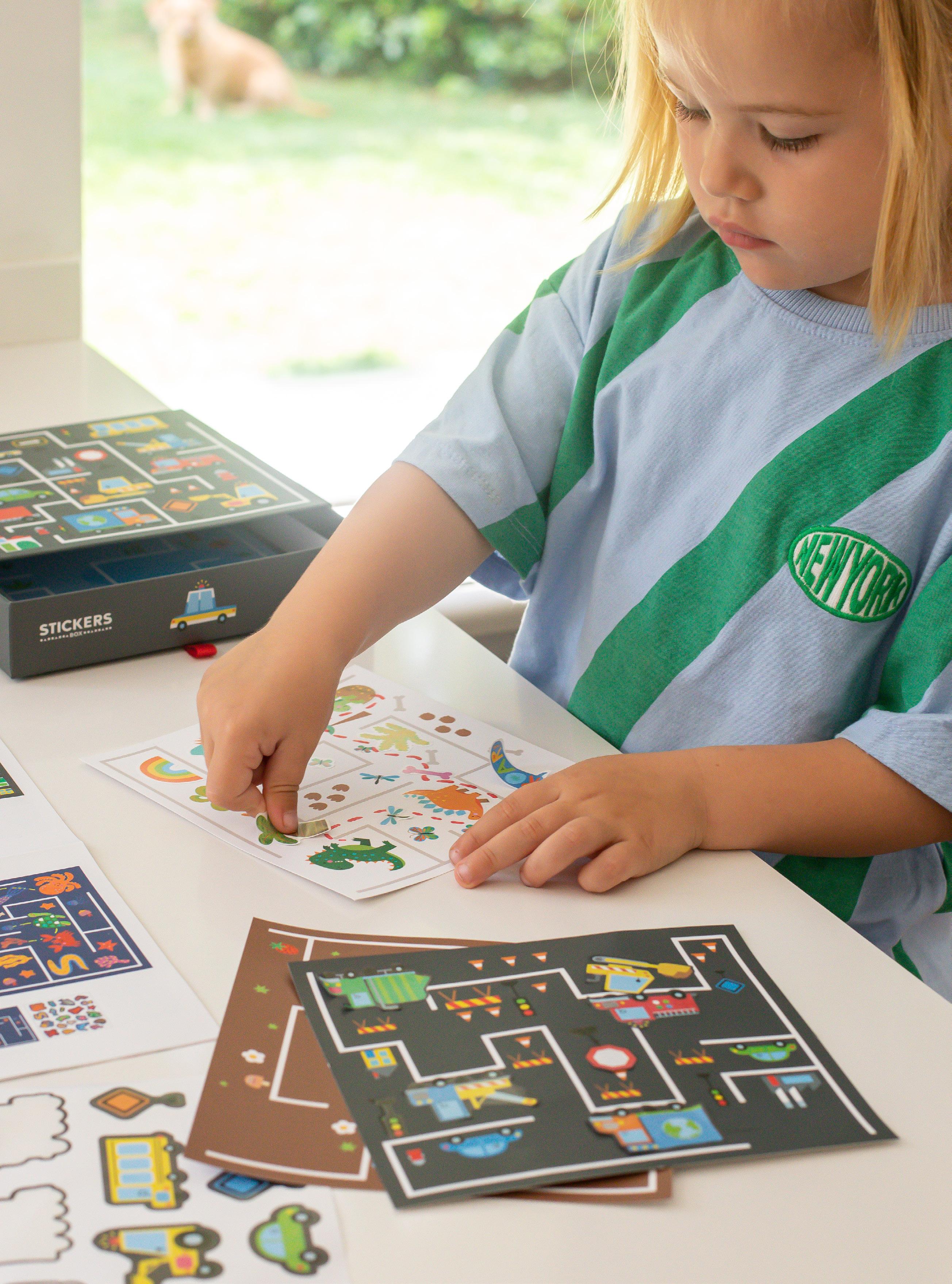 Fill the transport drawings with stickers of different sizes, colors and prints