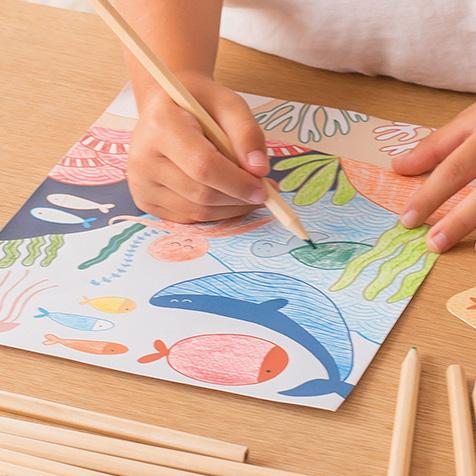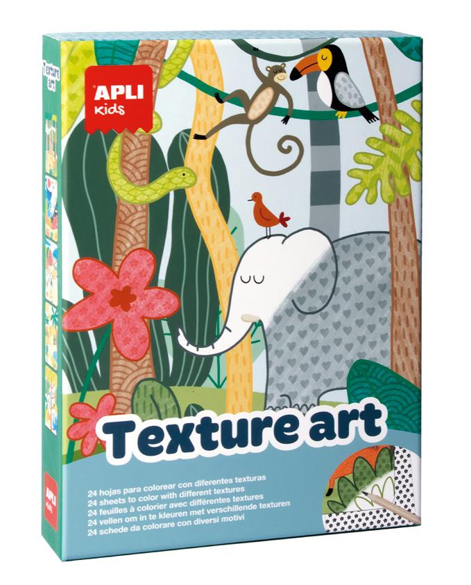 Content: 24 sheets with 6 different designs 12 cards with different textures | 11 color pencils | 6 guide cards with examples