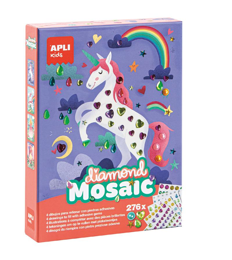 Content: 4 illustrated cards | 276 diamonds of different colors and shapes | 4 guide cards with examples