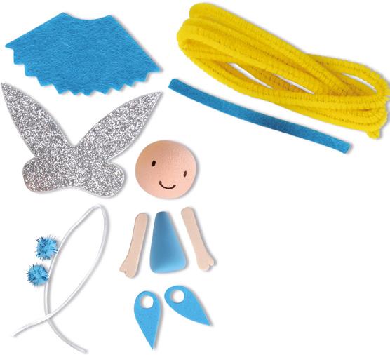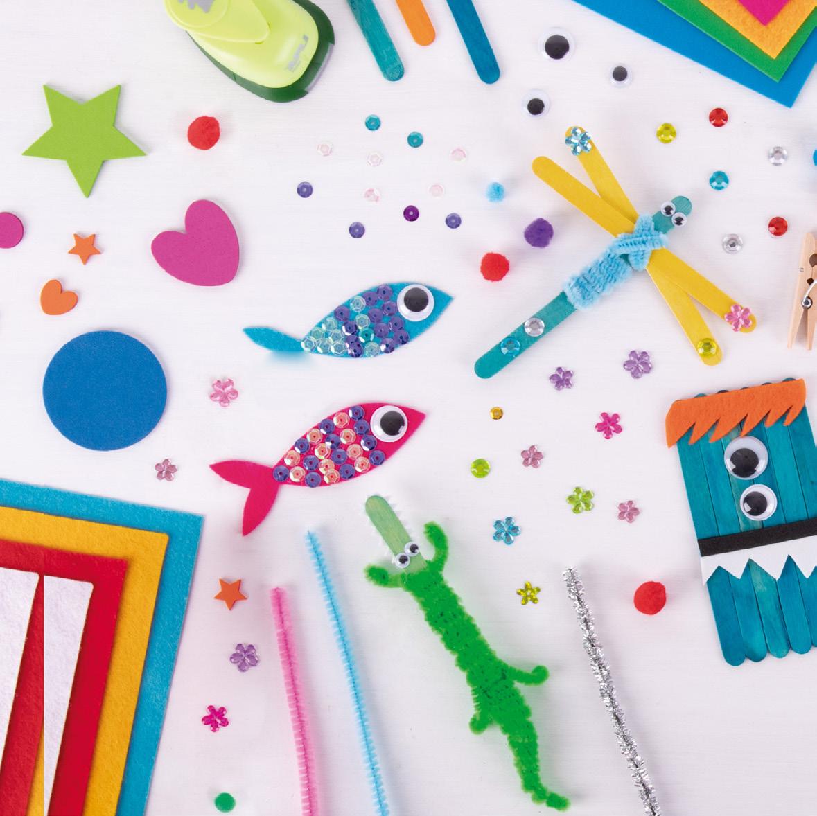 Content: 100 pom-poms | 75 adhesive EVA foam shapes | 100 adhesive fantasy stones | 300 sequins | 50 wooden sticks | 80 moving eyes | 15 feathers | 26 pipe cleaners | 10 wooden clips | 4 A5 sheets of EVA foam | 4 A5 sheets of felt 1 booklet with examples