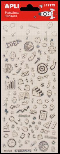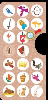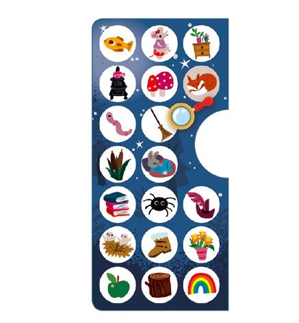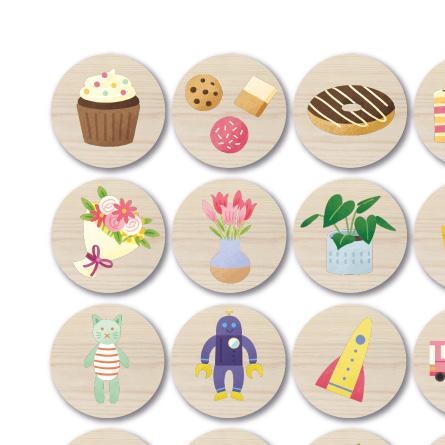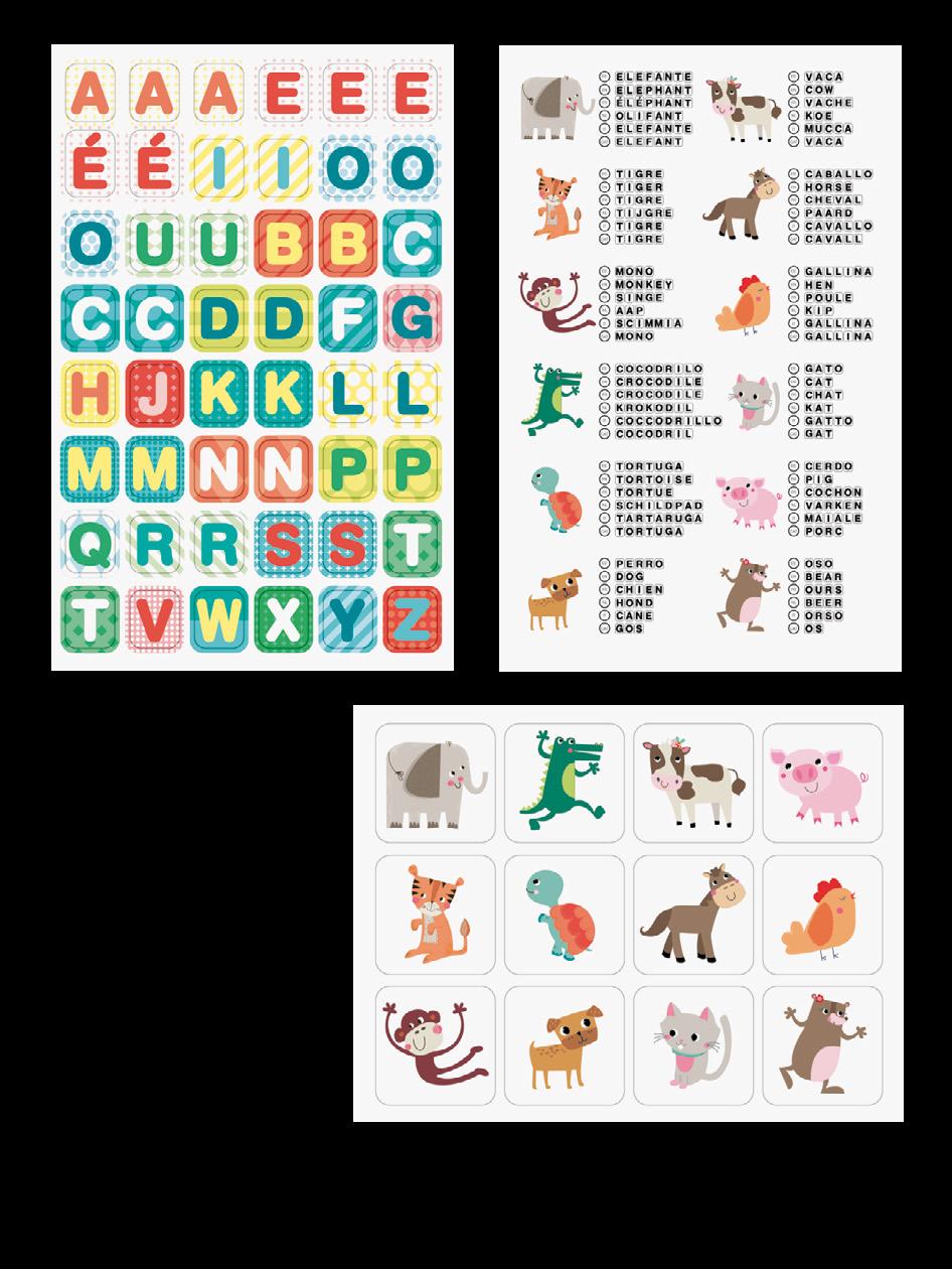 Content: 16 illustrated cards (8 drawings x 2) | 12 sheets of removable round educational stickers | 1 full-color example guide Presentation: Metallic