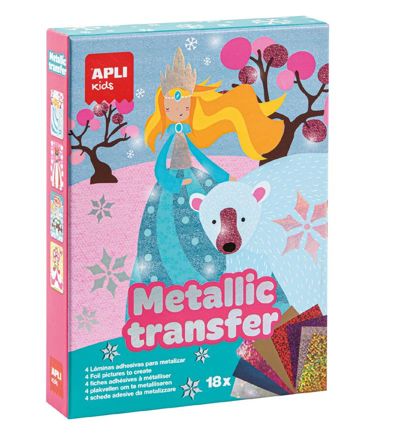 Content: 4 adhesive and pre-cut illustrated cards | 20 metallic transfer papers | 1 plastic tool 1 sheet of instructions | 4 guide cards with examples | Languages: ESP, EN, FR