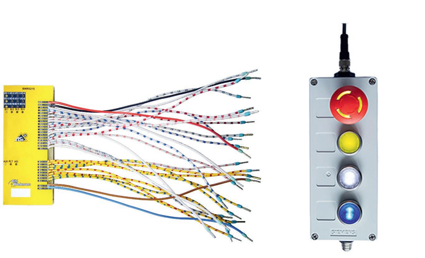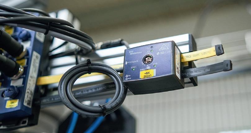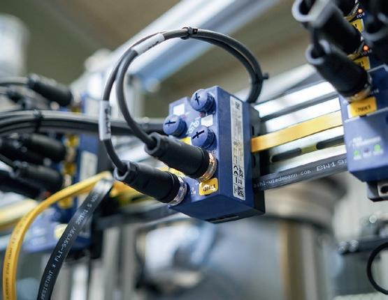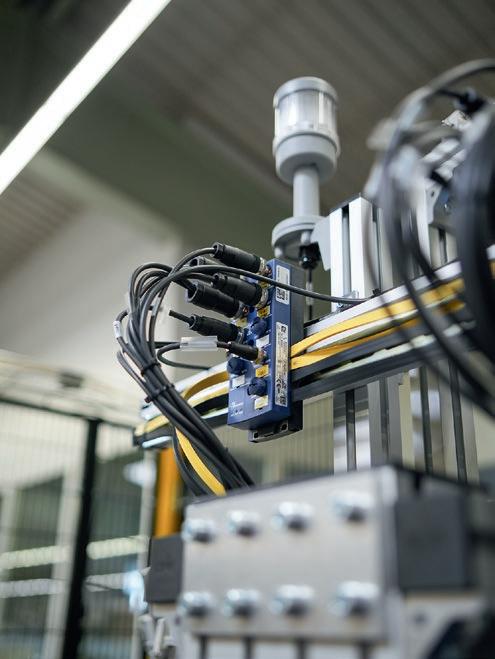 für Daten und zwei parallel dazu geführte schwarze Profilkabel für zusätzliche Energie –angebunden ist, konnte auf die ganzen Kabelbündel und Klemmleisten und damit auf fünf von sechs Schaltschränke verzichtet werden. „Wir sparen uns mit der neuen AS-InterfaceLösung damit nahezu den kompletten Schaltschrankbau und natürlich einen ganz großen Teil vom Verdrahtungsaufwand“, so Johannes Mück. „Und zukünftig können wir diesen noch weiter reduzieren, wenn wir dort, wo wir Kabel benötigen – etwa bei der Anbindung der Pneumatik an die Ventile oder der IOLink Komponenten an die ASi Module – diese nicht mehr selbst konfektionieren müssen, sondern passgenau bestellen können.“