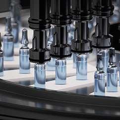 Transport eines Beutelstapels vom Ablageort über das Anbringen von Pappe und Stopfen sowie das Verschuppen des Bügels bis zur Ablage in den Karton.