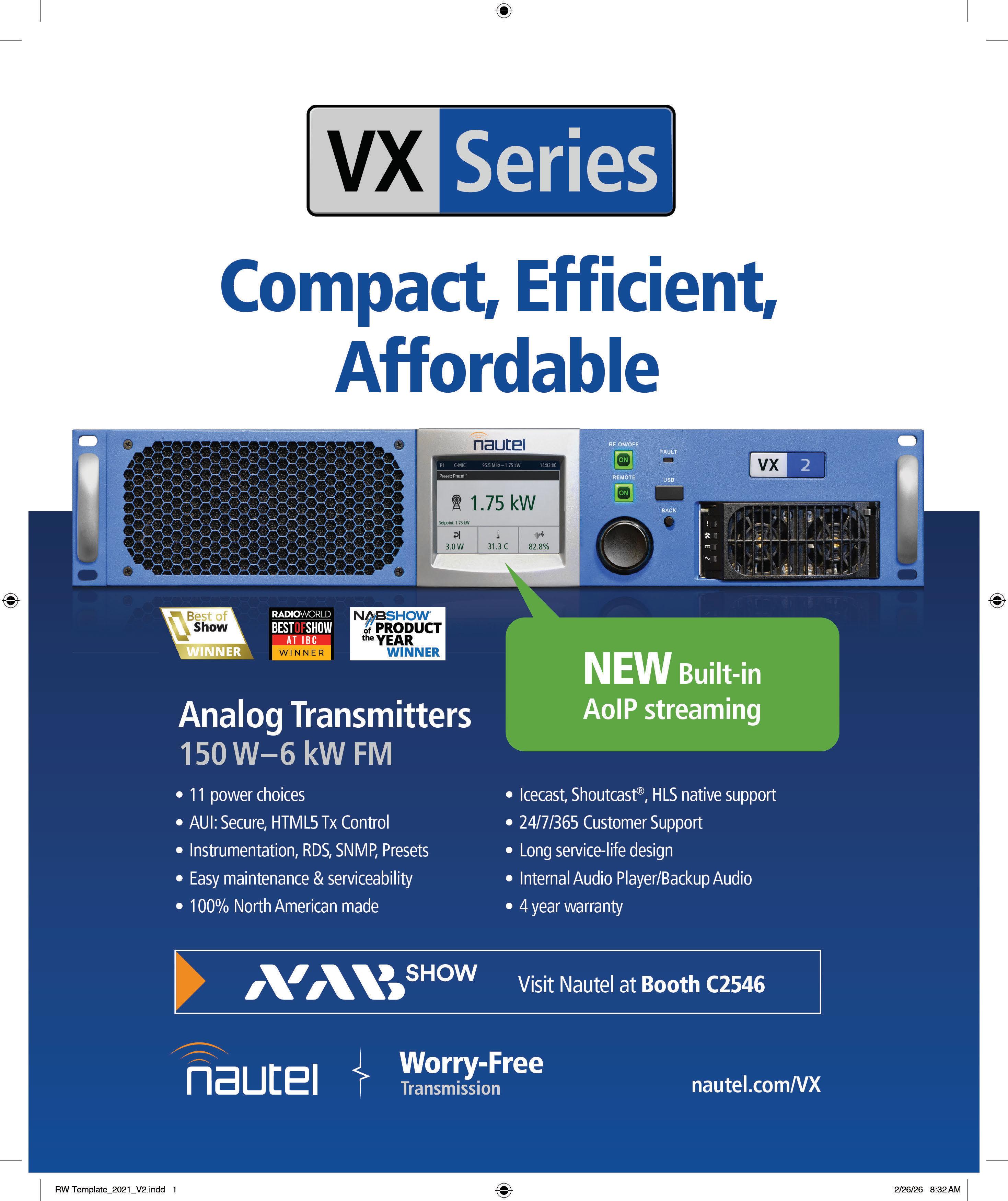 Nautel said that Hutton Broadcasting purchased an NV20LT transmitter for FM station KQBA in Los Alamos, N.M.