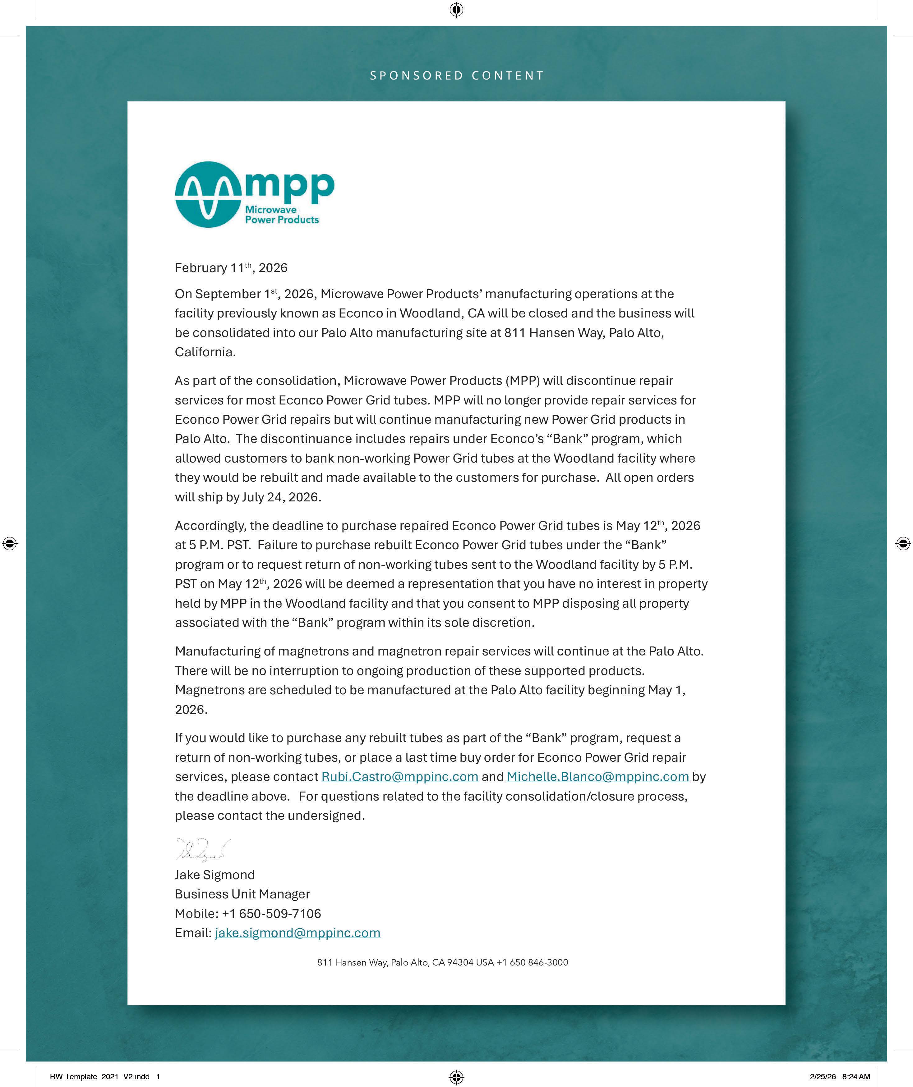 MPP said operations at the Woodland manufacturing site will cease on Sept. 1 as it consolidates operations to Palo Alto. As part of the transition, the company will discontinue repair services for Econco Power Grid tubes, though it will continue to manufacture new tubes. (You can read the company’s announcement in its ad on page 25 of this issue.)