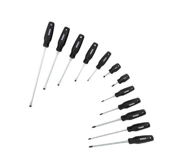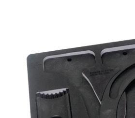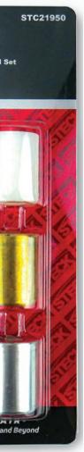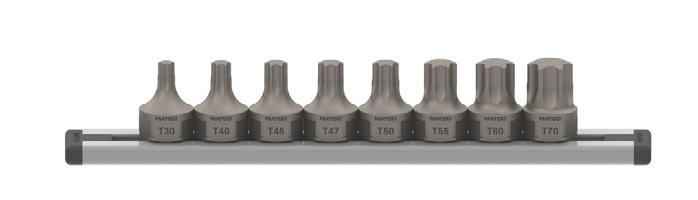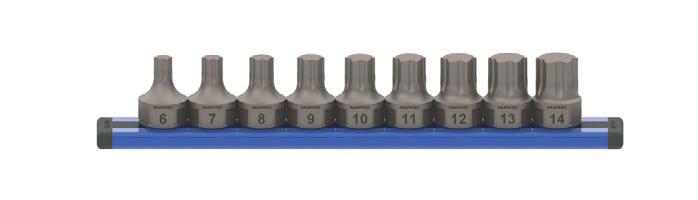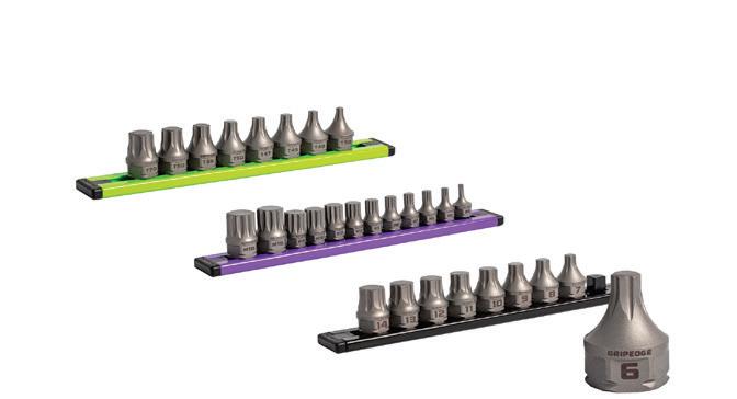 The GripEdge Tools 3/8” Drive RPT Low Profile Dual Action Driver Sets , Nos. DDHBM9S, DDHBS6S, and DDSB8S, come as Metric, SAE, or Star. Each set’s bits measure just 1-1/16” or 27mm in length, allowing for greater access in recessed or tight spaces. The drivers can be driven using standard 3/8” drive square tools or the external 11/16” (17mm) hex. These sets maintain a full-length geometry across most sizes, ensuring a secure fit within the fastener. Each driver features GripEdge’s patented Rounding Prevention Technology (RPT). RPT geometry is engineered to replace conventional tools by preventing the rounding of good fasteners and removing damaged ones. Each set features laseretched size markings, a one-piece S2 steel construction, and is packaged in a secondgeneration aluminum rail. n