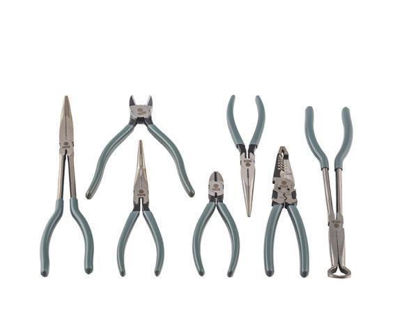The Matco Tools 7-pc Pliers Set in Shadow Gray, No. SP7SG, is designed to give technicians a compact kit of the most commonly used pliers for everyday shop and field jobs. Manufactured with precision-machined jaws and CRV construction, each tool delivers a secure grip, durable performance, and a rust-resistant finish that helps keep the set looking new longer. Non-slip dipped handles provide control while the heavy duty zipper pouch keeps everything organized and portable. The set includes long nose, straight, bent, and extended-reach pliers, plus precision cutters, long-reach hose-grip pliers, and an 8” electrical plier that strips 10-20 AWG wire, cuts 6-32 and 8-32 screws and crimps terminals.