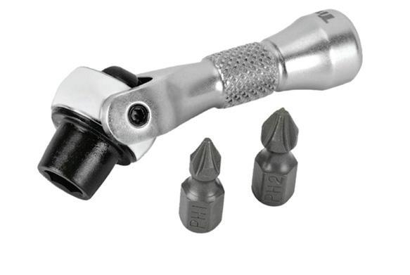 The 1/4” Drive Nano Bit Driver w/ HexHandle Ratchet , No. 11340, from Titan Professional Tools features a 250-degree swivel head, magnetic bit retention, and a minimal 4-degree sweep. The handle end functions as a magnetic bit driver, while the 90-tooth reversible ratchet allows for smooth operation. This tool is ideal for use in confined areas and on tasks that need more leverage than a finger ratchet has to offer. The knurled handle is designed for greater control. The tool is 2-1/4” long. n