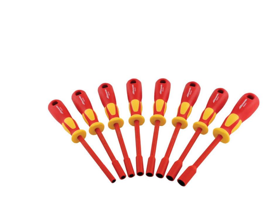 The 8-pc Metric Insulated Nut Driver Set, No. D062723, from Dynamic Tools, is an insulated tool set with sizes 5mm, 5.5mm, 6mm, 7mm, 8mm, 9mm, 10mm, and 11mm. Each nut driver is made from chrome vanadium steel for strength and durability, with precisely machined openings for an exact fit on fasteners. The ergonomic non-slip handle is designed for maximum precision and control, while its flat areas prevent roll-off. Each tool is insulated via injection moulding, and VDE certified in compliance with the IEC60900 standard. The set offers protection up to 1,000V.