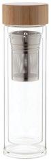 Divsienu, borsilikāta stikla pudele ar sietiņu un bambusa vāku.