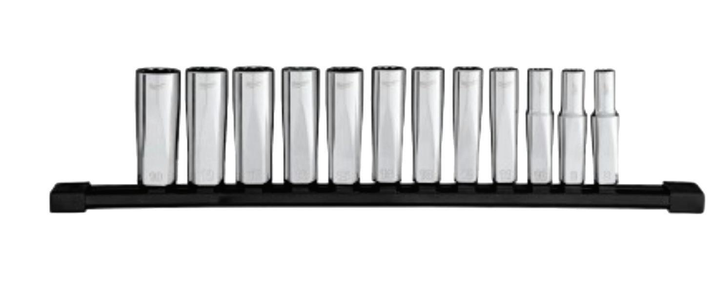 The Milwaukee Tool 12-pc 3/8” Drive 12-point Deep Well Metric Socket Set is designed with four parallel flat sides, which deter rolling and are wrench compatible. The laser-engraved size markings provide easy identification, and chrome plating offers rust and corrosion protection. This set includes a storage rail for better organization. All Milwaukee sockets are backed by a lifetime guarantee.