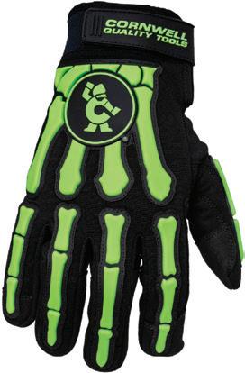 The Vibe Glow Bones Mechanic Gloves from Cornwell Tools are available in medium, large, XL, and 2XL. The breathable mesh top helps to ventilate and keep air flowing through the top of the glove. These gloves glow in the dark and feature four-way fourchettes, an EVA-padded palm to mitigate vibrations and impacts to the palm, touch screen fingertips, a neoprene cuff for unrestricted movement, and a TPR closure to keep the gloves secure.