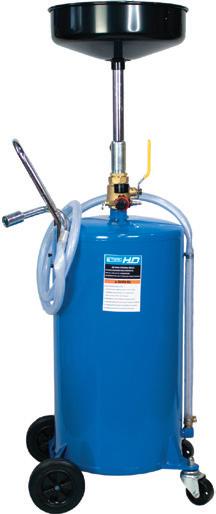 The K-Tool International 18-Gallon Metal Oil Drain , No. KTI74552HD, is a mobile waste container and drain tank that’s air-pressurized. The drain comes with an 8” discharge hose with a shut-off valve, as well as a fluid level gauge and air pressure valve. It has an adjustable working height ranging between 45” and 70”, and the drain has two 6” fixed axle wheels and two swivel casters for easy maneuvering.