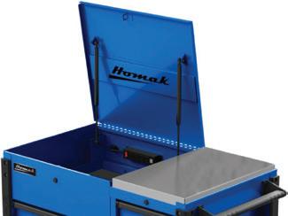 The 44” RS Pro 9-Drawer Flip Top Power Service Cart w/ Workstation , No. HOMBL06044090, from Homak Manufacturing , is a heavy duty tool storage unit designed for maximum efficiency, security, and durability. The power tool drawer includes a built-in power strip with four outlets and two USB ports, keeping tools organized and charged. A lockable top till with gas struts offers additional storage and charging for devices like laptops and phones. Built for strength, it features 520-lb capacity casters, a stainless steel work surface, and a high-security locking system. Nine spacious drawers with 100-lb ball-bearing slides ensure smooth operation, while a UV-protected powder coat finish enhances durability. Backed by a 5-year warranty for peace of mind.
