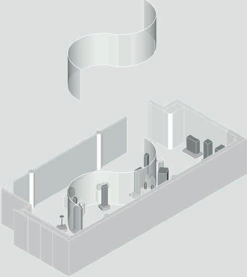 El corazón del proyecto es una estructura curva hecha con tela translúcida, que recorre el espacio de forma ligera y casi flotante. Esta curva no es solo un gesto formal: está inspirada en los movimientos del hierro al ser forjado a mano, en esas líneas suaves que aparecen cuando el material se deja llevar por la técnica y el tiempo. De alguna manera, esta forma recoge esa memoria del oficio y la traduce en el espacio.