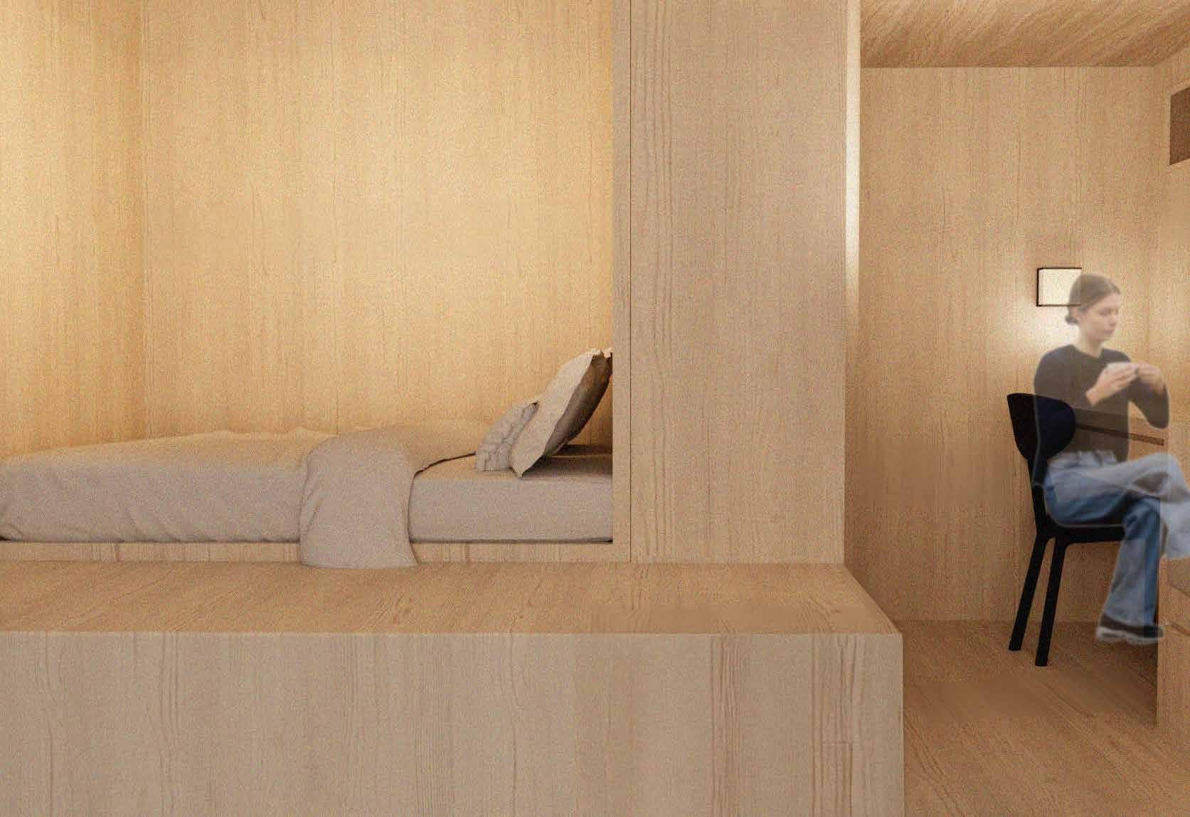 La zona de día, situada en el nivel inferior, se abre hacia la entrada de luz natural, que entra desde una ventana superior. Es un espacio pensado para estar activo: concentrarse, leer, escribir o tocar música. En cambio, la zona de noche, más elevada, ofrece una sensación de intimidad y protección, ideal para descansar o desconectar.