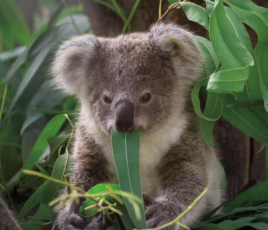 A koala lives in eucalyptus trees. A koala eats eucalyptus leaves. A koala licks rain from tree trunks to get water.