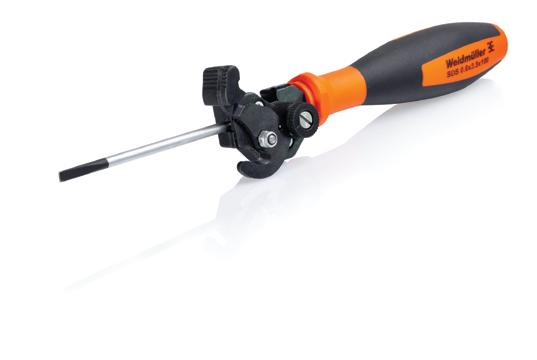 swifty CS (cut and strip) has an attachment that slides onto any uninsulated screwdriver with a 3.5 mm blade diameter. Users cut the wire on one side, strip the wire on the other side, and use the screwdriver for adjustments. It can strip PVC-insulated fine-stranded and solid conductors up to 14 AWG, cuts single-stranded copper conductors up to 16 AWG and finestranded up to 14 AWG, and has an adjustment wheel for precise stripping support and an ergonomic grip.