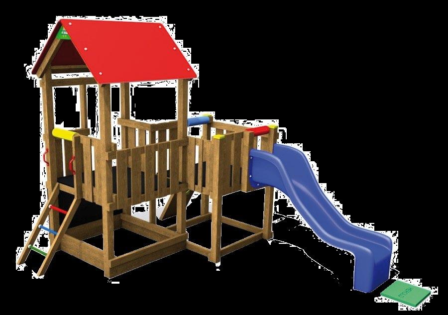 FLEXI SESTAVA 1 - 100 PREMIUM včetně skluzavky (modrá, zelená, červená, žlutá) opatřeno středně hnědou impregnací Sestava obsahuje – 1× věž se střechou, 1× věž bez střechy, 1× lezeckou stěnu, 1× žebřík, 1× šplhací tyč, 3× bezpečnostní polštářek a 2× madlo pro přidržení u výlezu červeném provedení