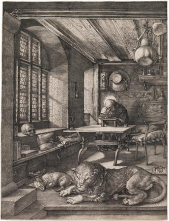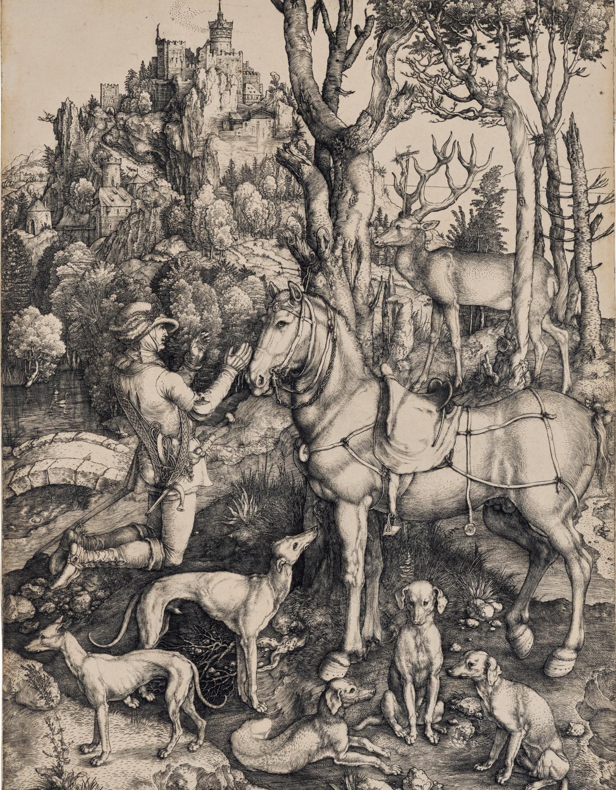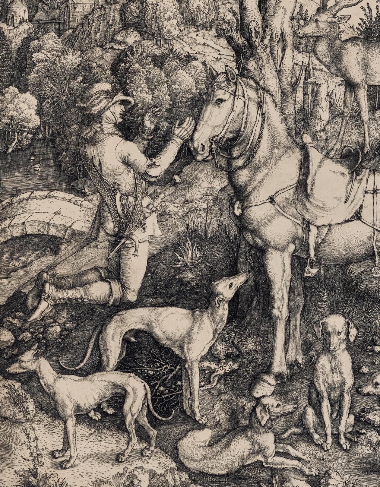 According to the legend a Roman soldier called Placidas saw a vision of the crucified Christ appear between the antlers of a stag he was hunting. Upon hearing God's voice spoken by the animal, 'O Placidas, why pursuest thou me?', he fell on his knees, was converted and baptized with the name Eustace. In Dürer's engraving the saint is shown kneeling on the banks of a stream, transfixed by his vision, while his horse and hounds wait patiently for their master. The animals are depicted with delightful naturalism, as is the woodland vegetation, the gnarled and splintered tree trunk, and the view in the distance of a hill surmounted by a castle, with a flock of birds spiralling around its castellated turrets. This display of technical virtuosity may have been Dürer's counter to the hotly contested view prevalent in the 16th century that sculpture was superior to painting due to its capacity to show the figure three-dimensionally. Dürer's depiction of the natural world in Saint Eustace in such exquisite detail - and in the case of the dogs from different sides at once - was a provocative claim for the parity of painting. One of the most admired and best loved elements in Dürer's whole graphic oeuvre are indeed the greyhounds in the foreground, which prompted Vasari's effusive description of the engraving as 'amazing, and particularly for the beauty of some dogs in various attitudes, which could not be more perfect'.