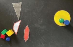 La clase sigue enfocándose en los atributos que definen y amplía la lista para incluir las características de las figuras tridimensionales, o figuras sólidas: las caras y los bordes. Por medio de la clasificación, descubren que algunos atributos son comunes tanto a las figuras planas como a las sólidas, como por ejemplo, las esquinas. Su razonamiento espacial evoluciona a medida que consideran cómo los atributos geométricos influyen en la manera en que se puede mover una figura sólida o la estampa que deja en una superficie.