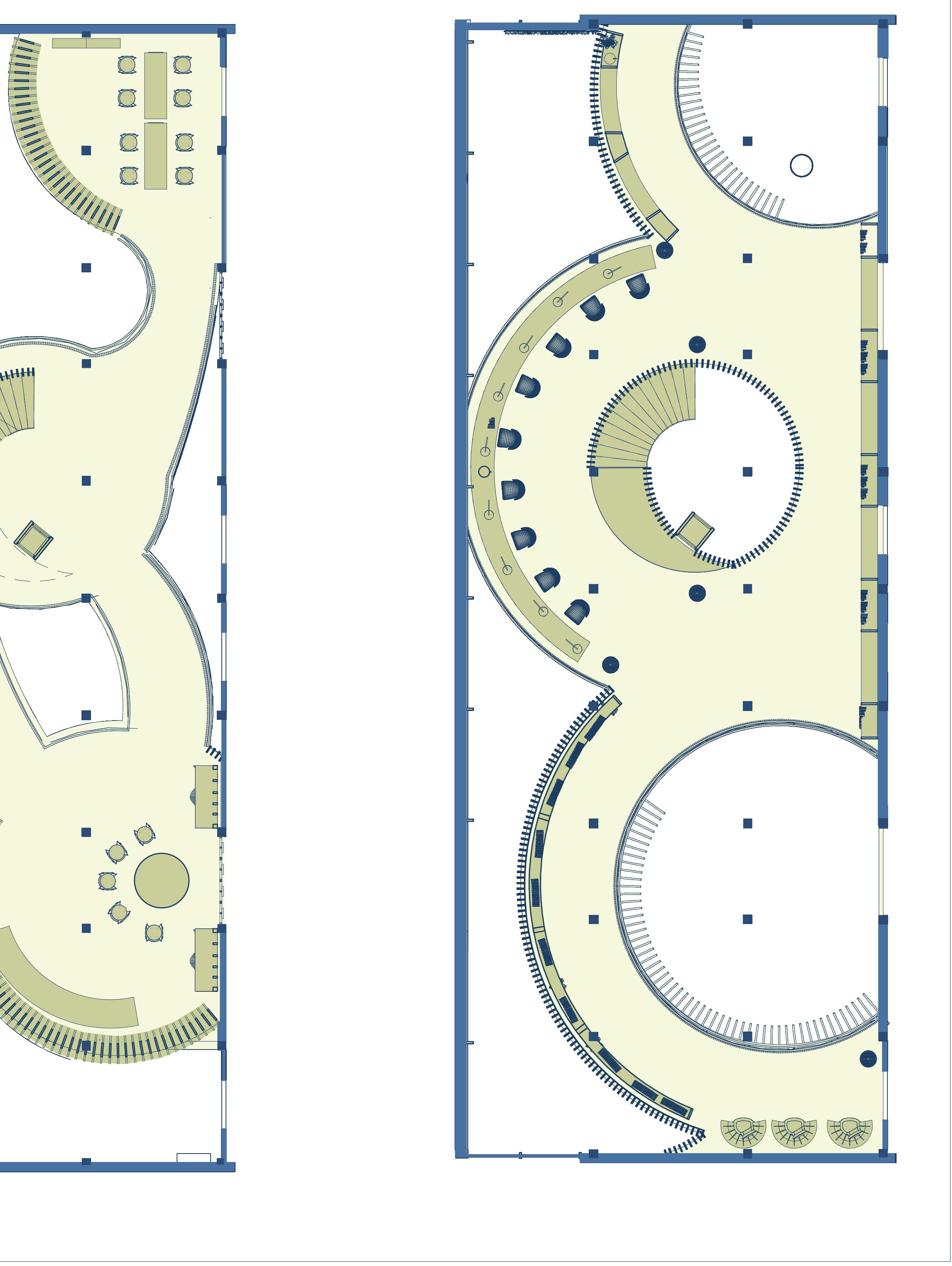The space mixes the two intrests of the students. One who enjoys movies and the other who is a book lover. By facing the main two interest back to back onto the diffrent sides of the room, they can both enjoy their intrests without having to disrupt each others spaces.