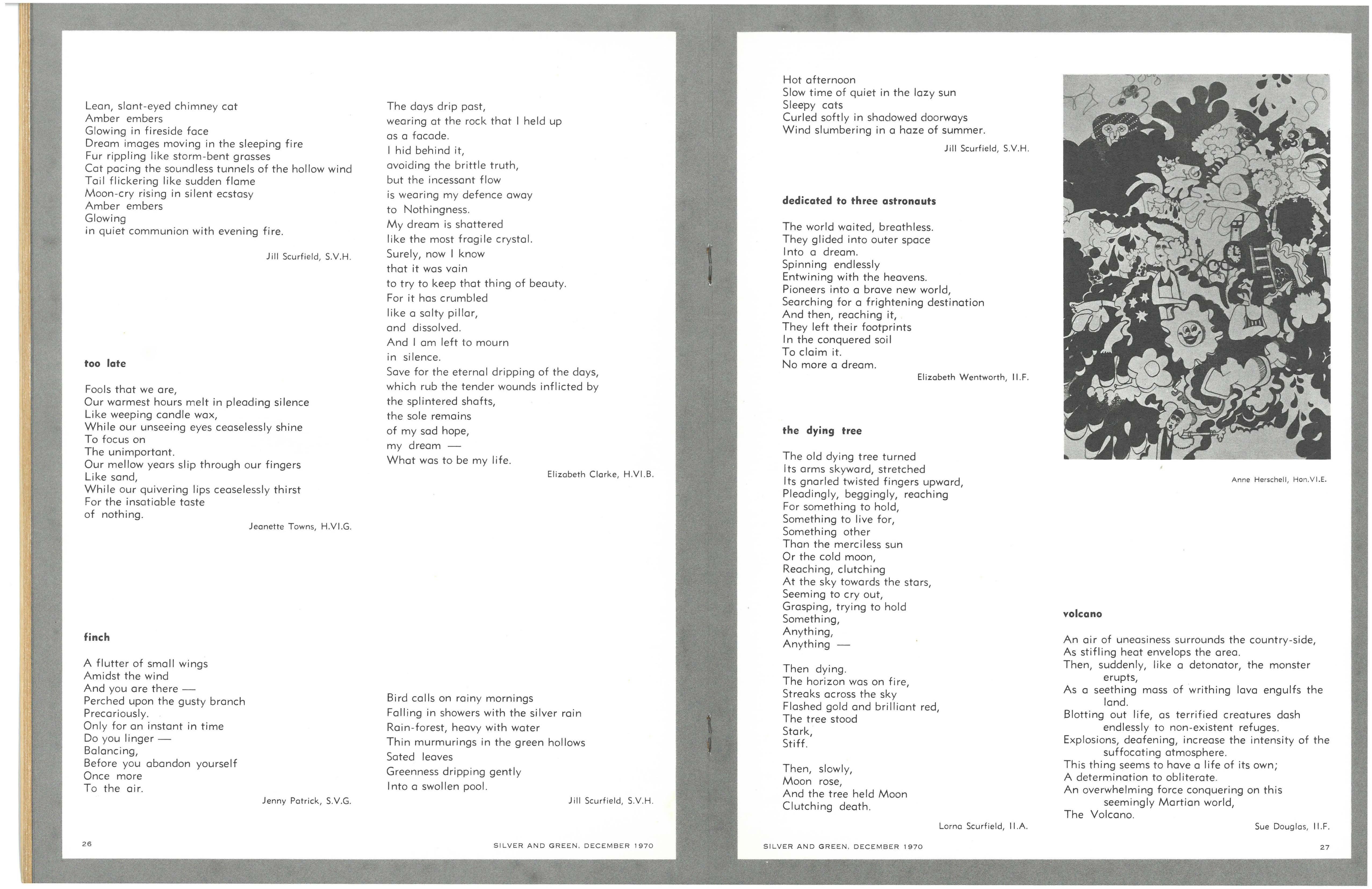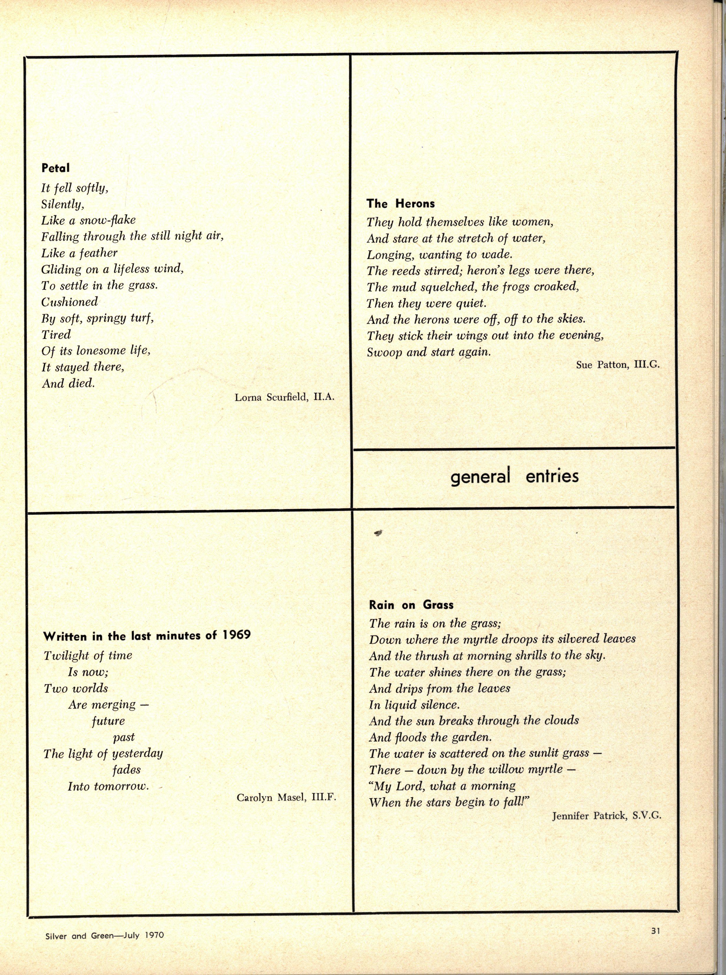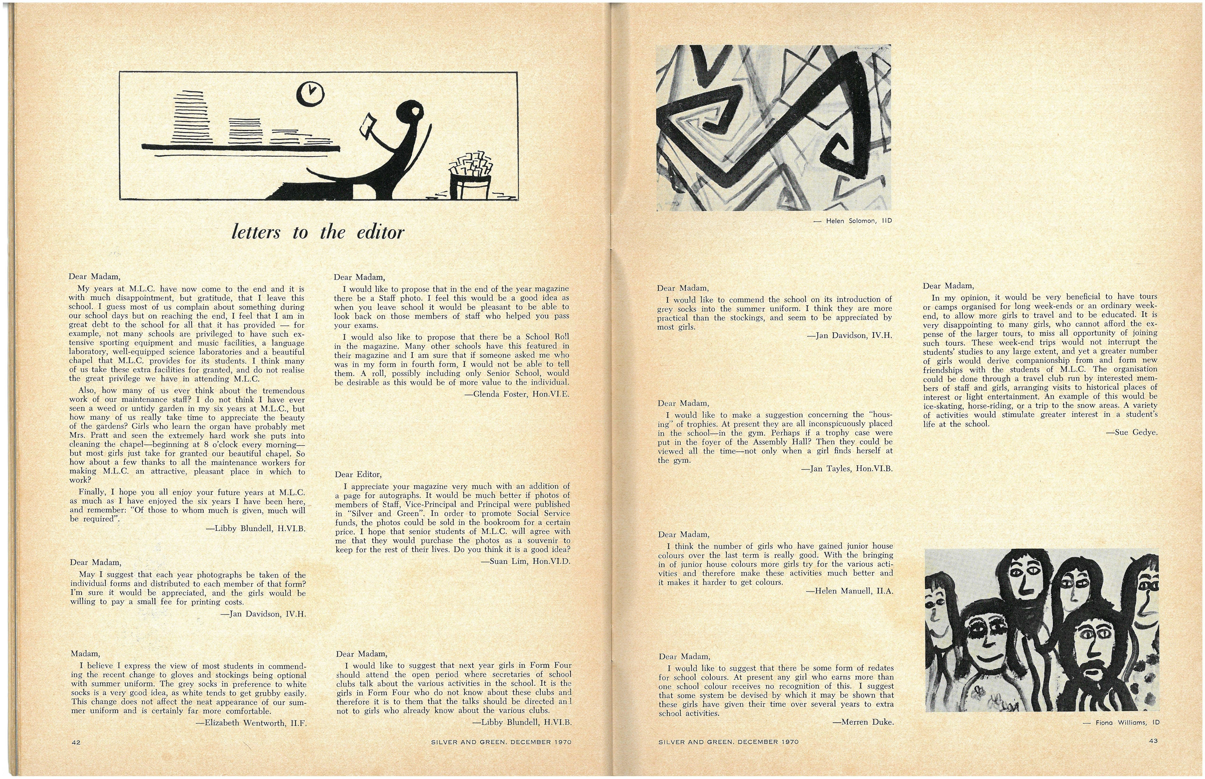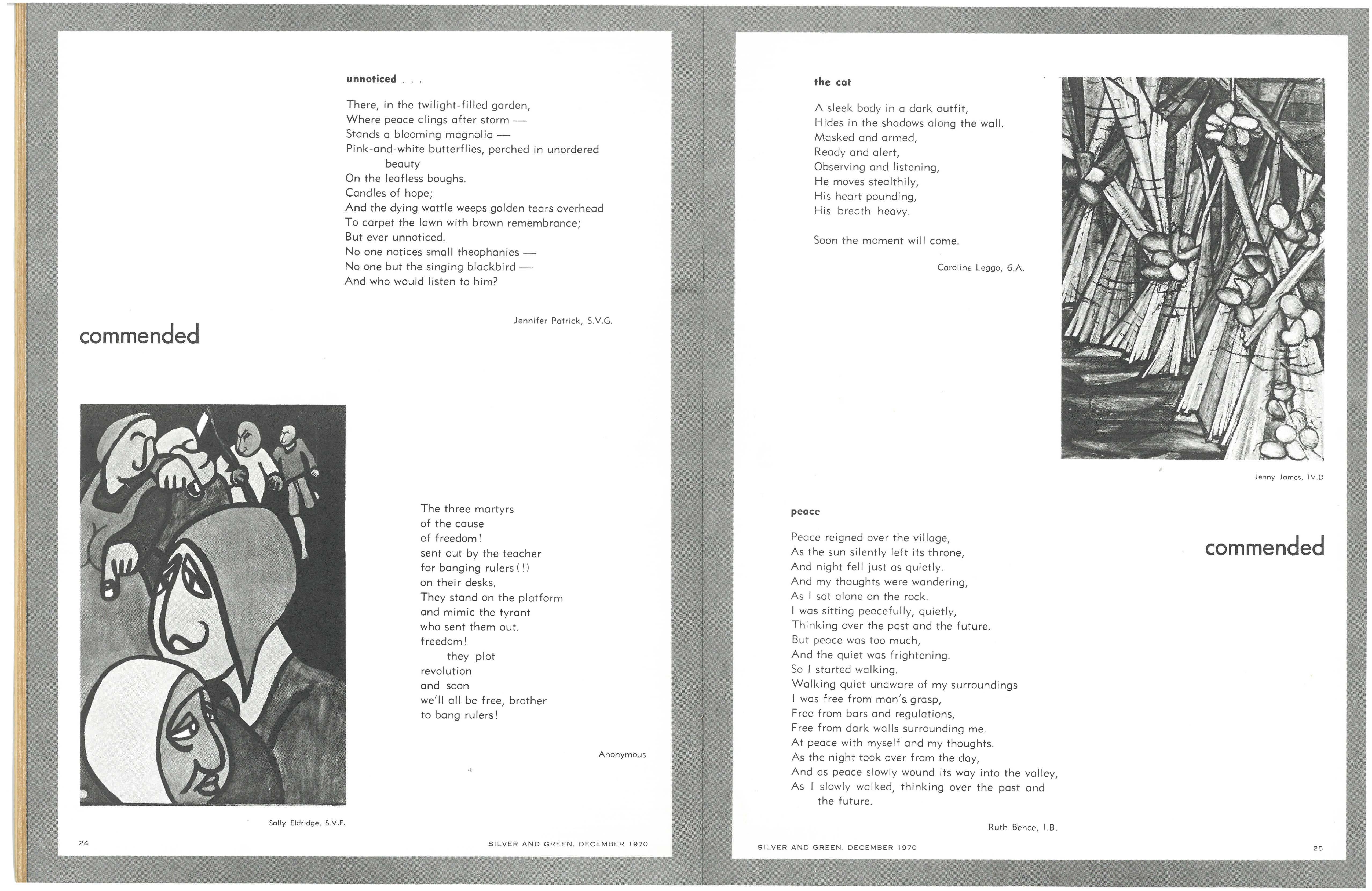 Following the entertaining address by the Senior Prefects, Ann Code and Carol Thorne, on "The Highlights of 1969", Rhonda Slater and Miriam Adams led the Senior Madrigal Group in a sensitive performance of Morley's "It was a Lover and His Lass" and Bennet's "All Creatures Now are Merry Minded"