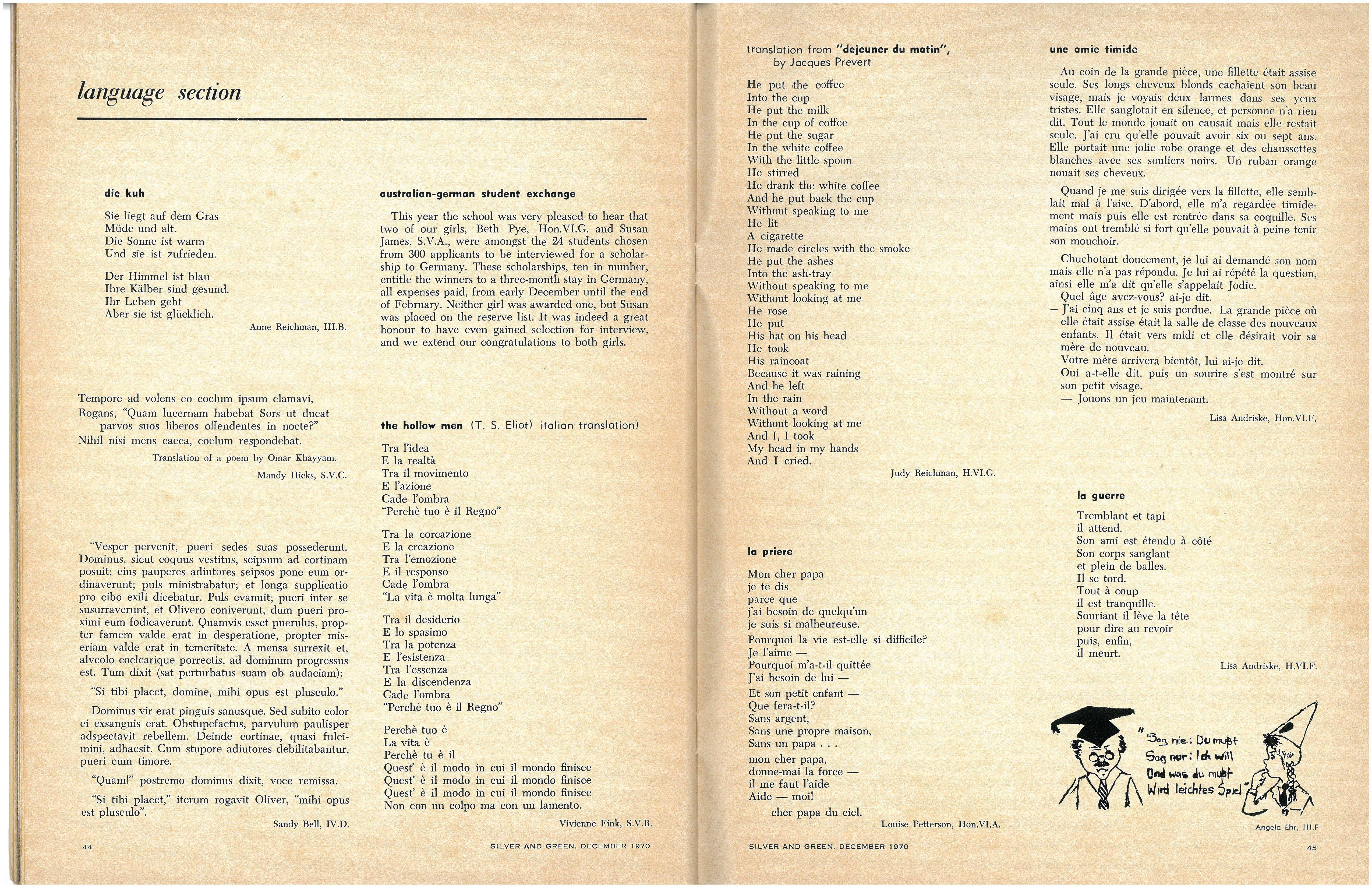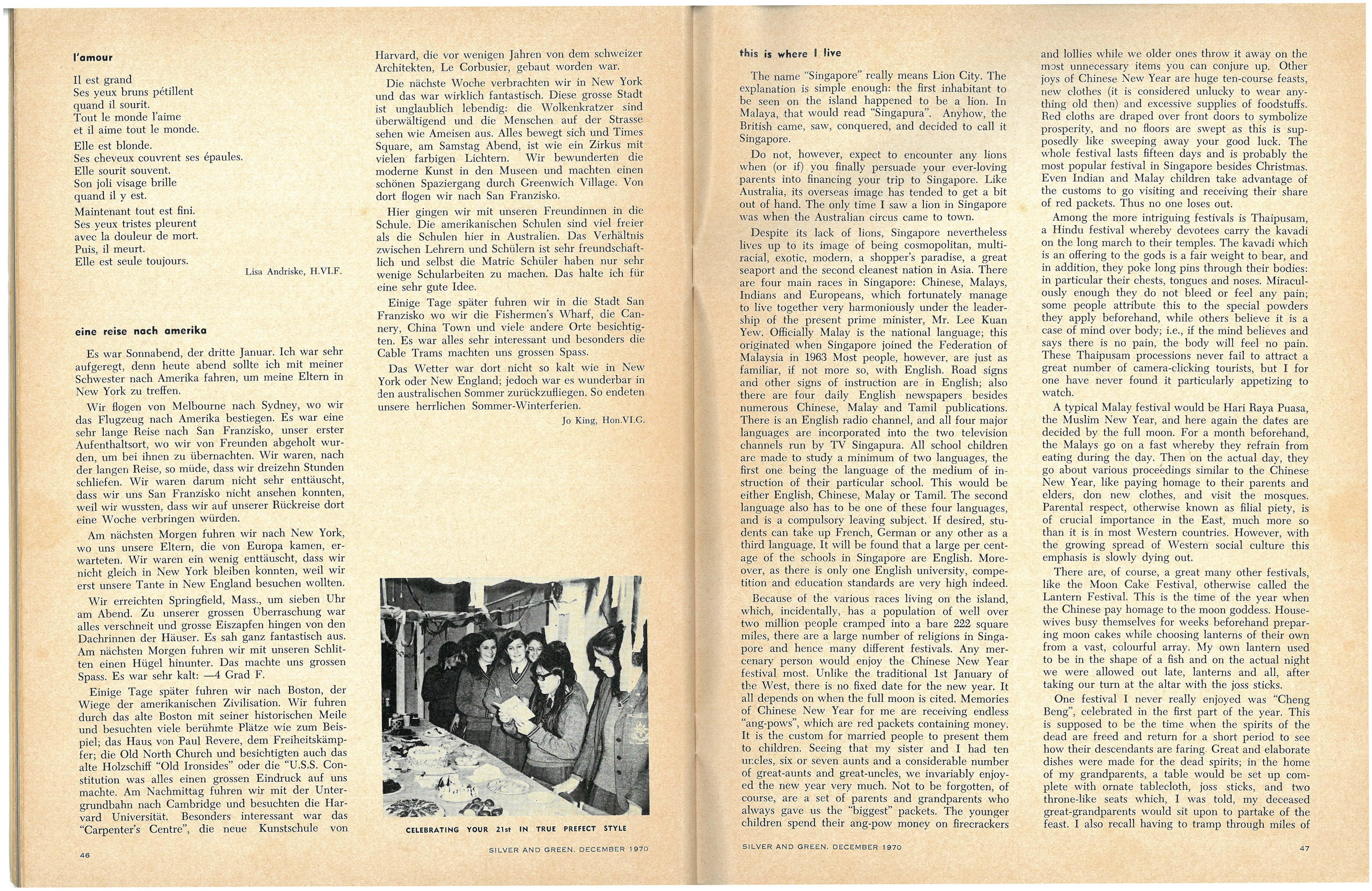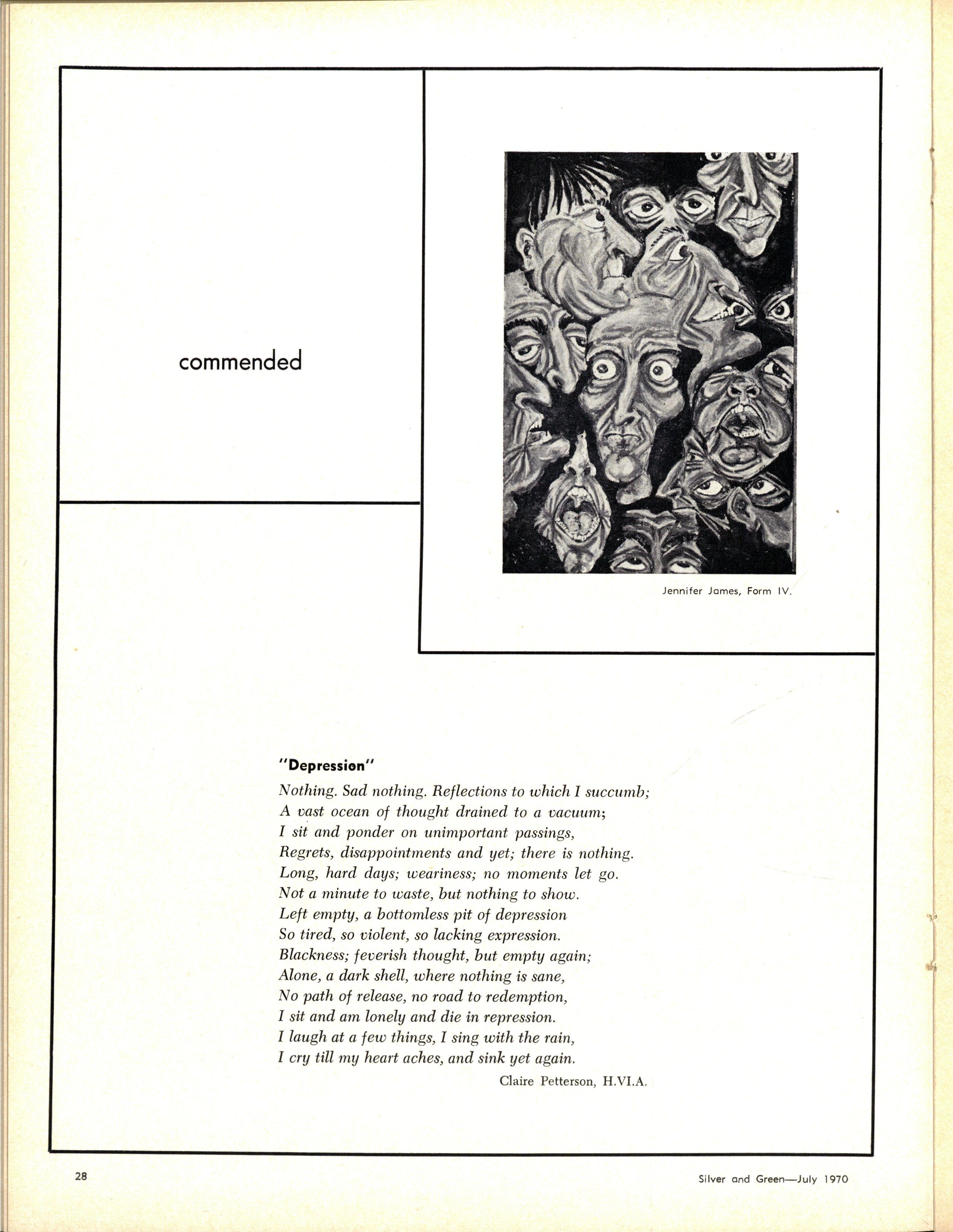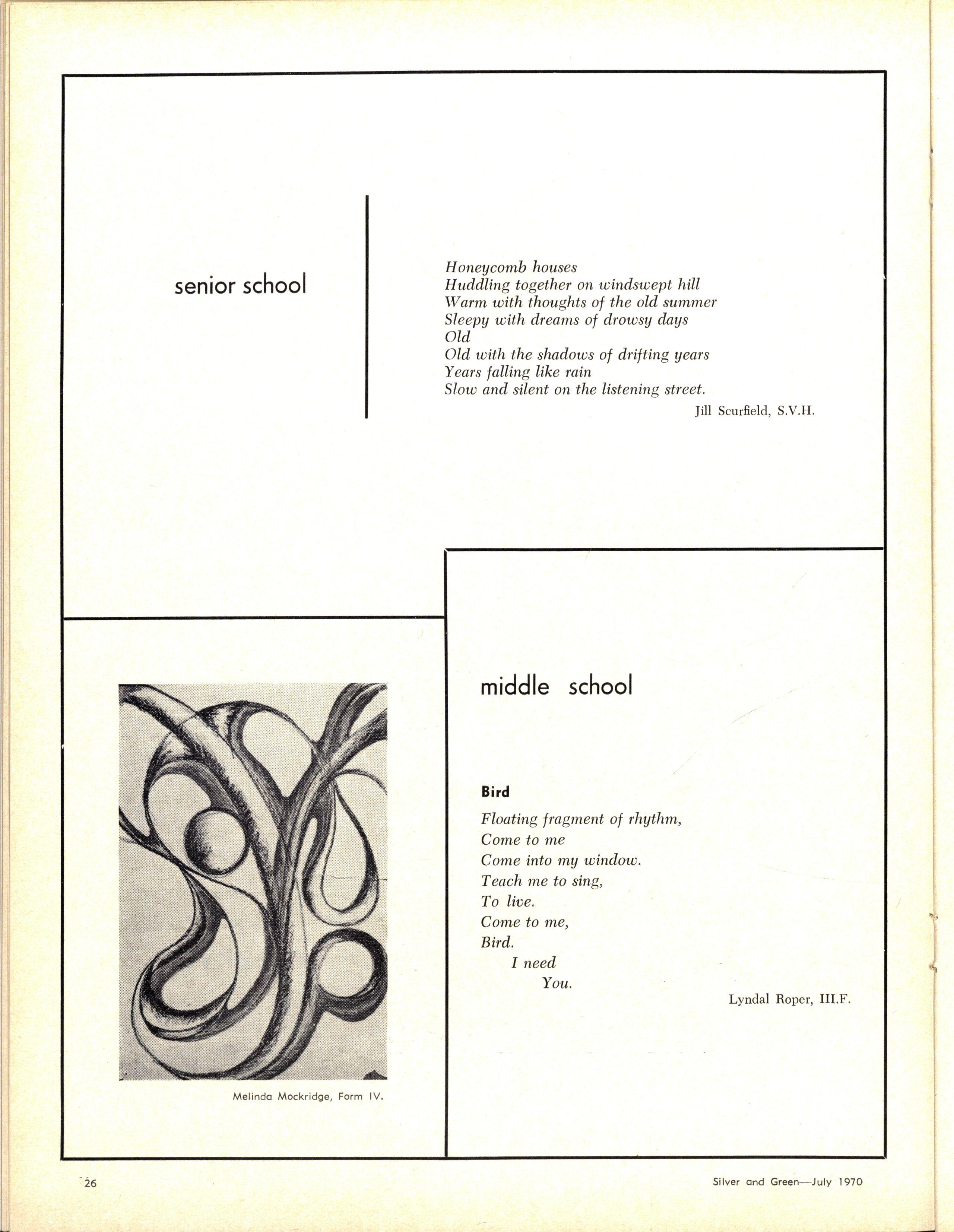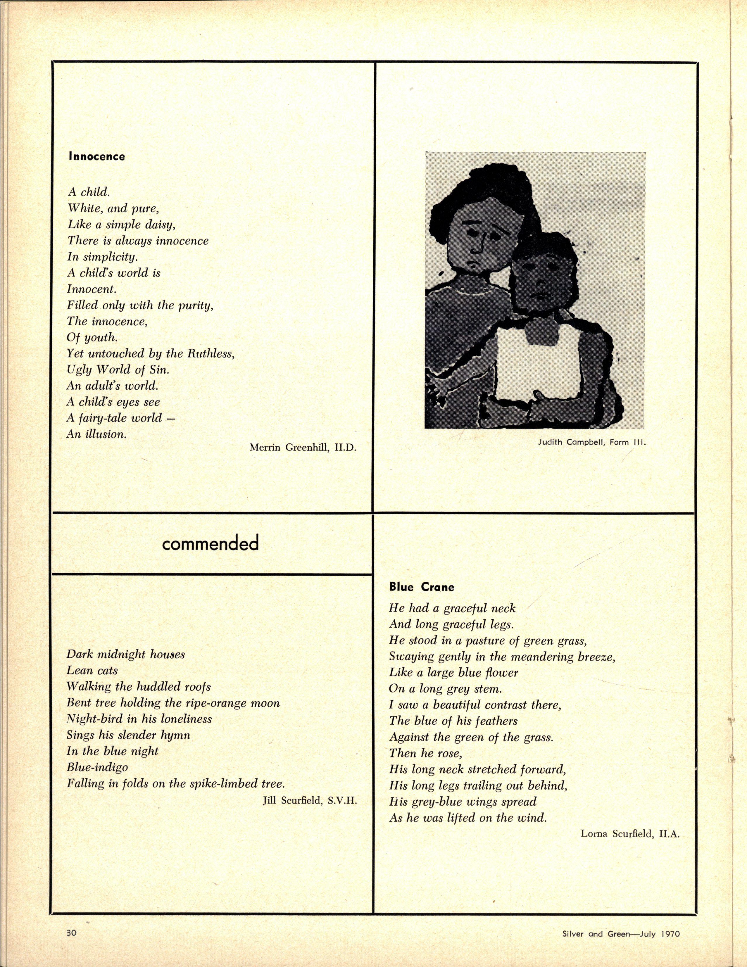 Following the entertaining address by the Senior Prefects, Ann Code and Carol Thorne, on "The Highlights of 1969", Rhonda Slater and Miriam Adams led the Senior Madrigal Group in a sensitive performance of Morley's "It was a Lover and His Lass" and Bennet's "All Creatures Now are Merry Minded"