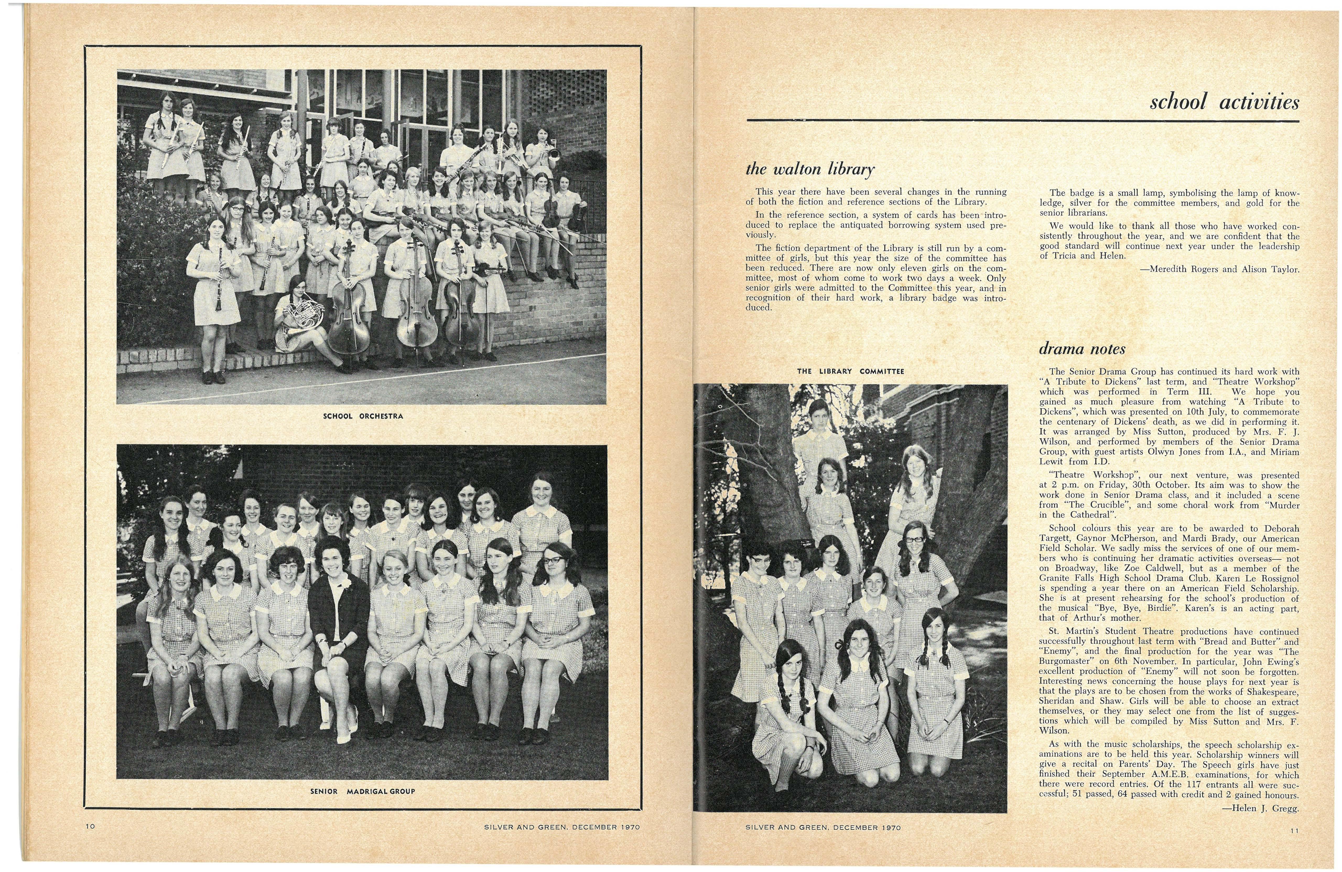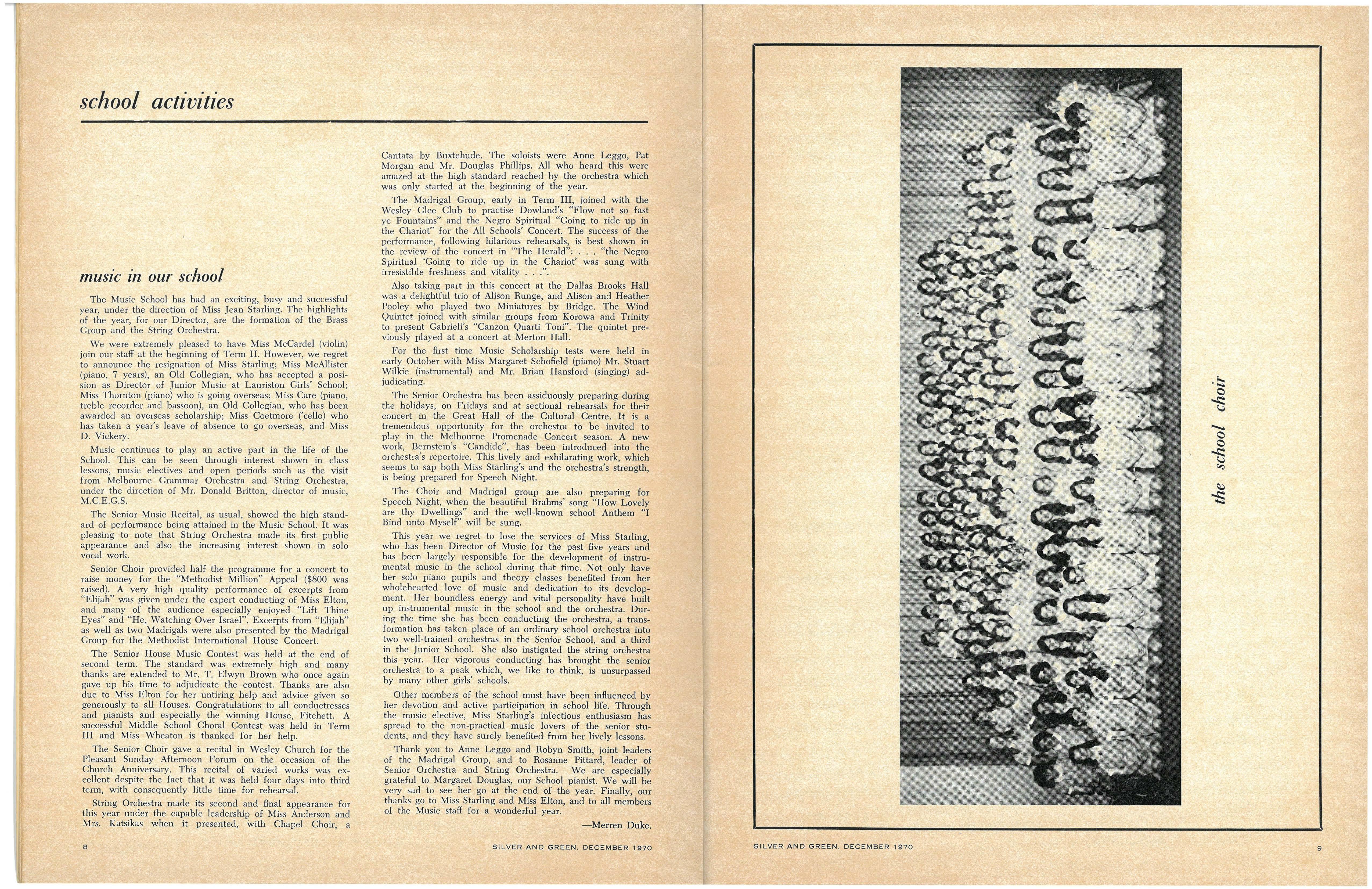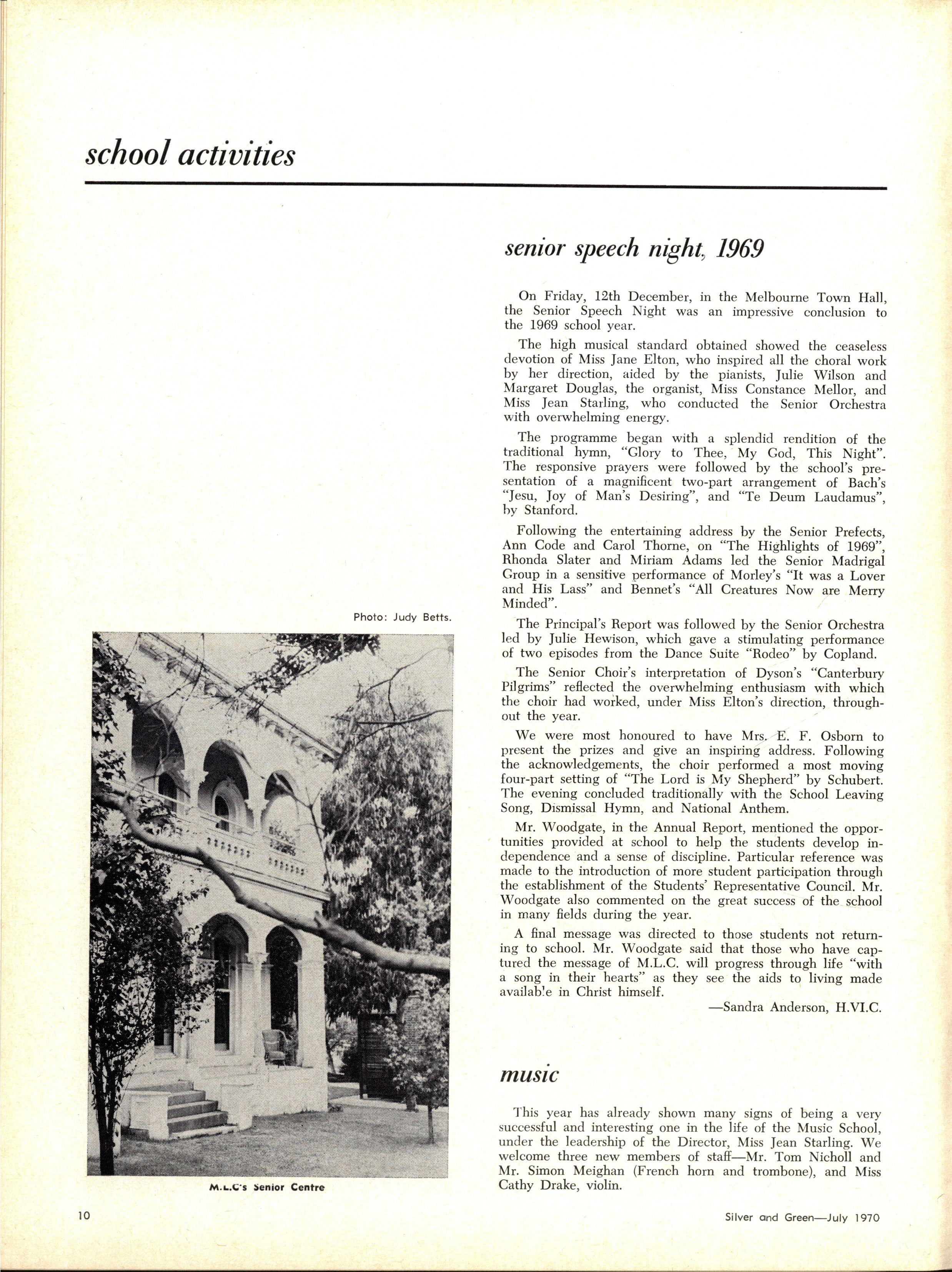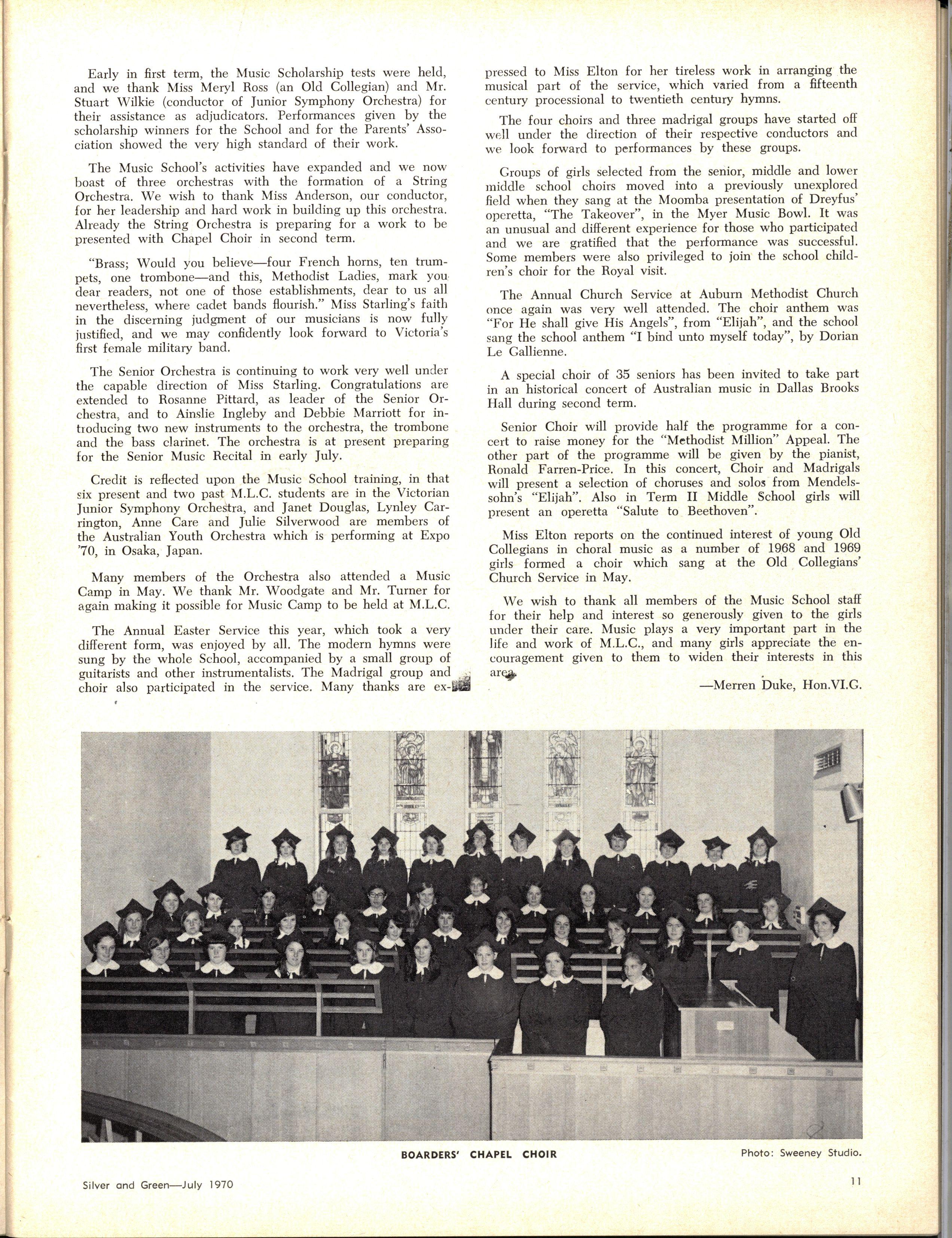 Credit is reflected upon the Music School training, in that six present and two past M.L.C students are in the Victorian Junior Symphony Orchestra, and Janet Douglas, Lynley Carrington, Anne Care and Julie Silverwood are members of the Australian Youth Orchestra which is performing at Expo '70, in Osaka, Japan