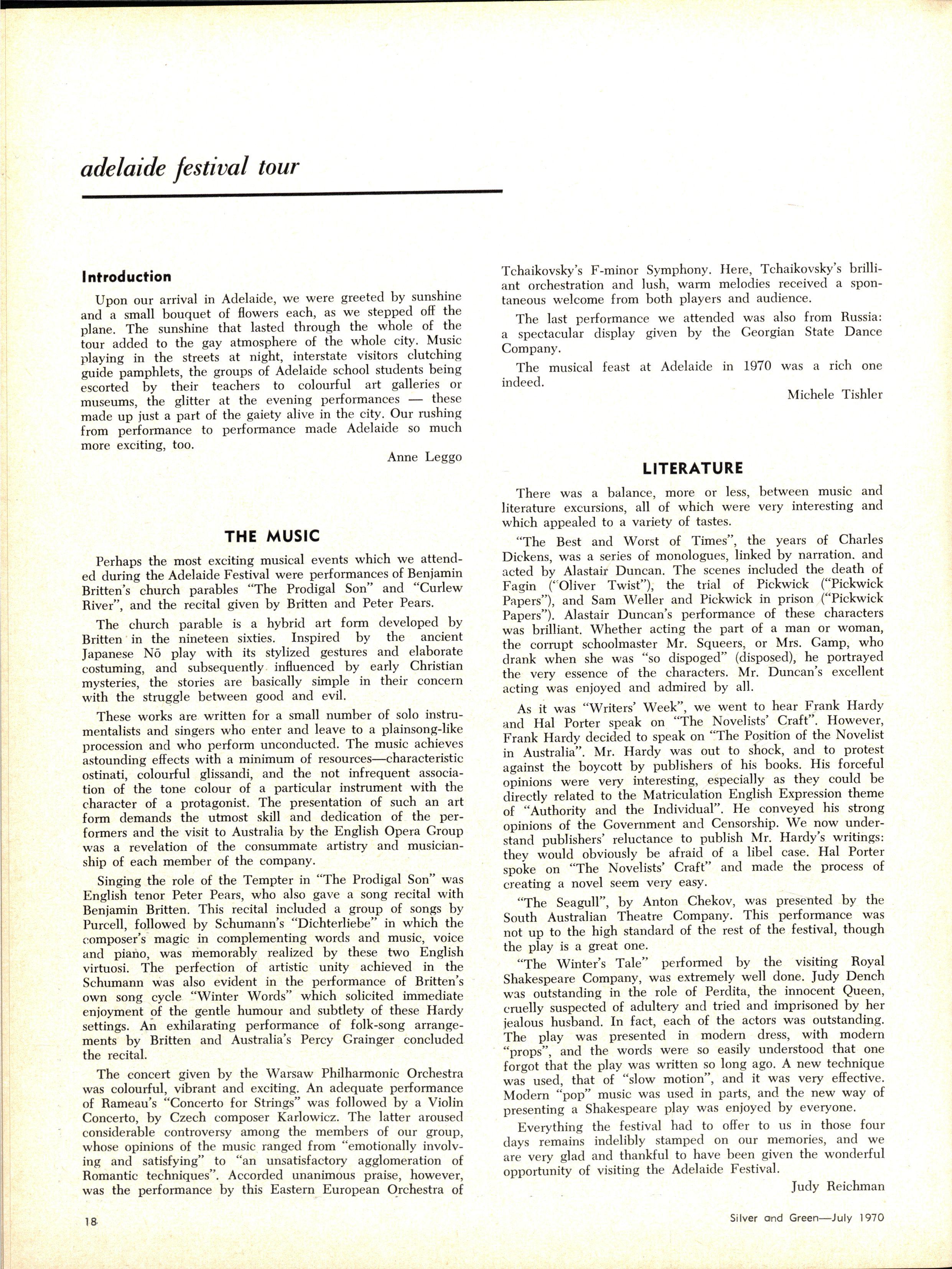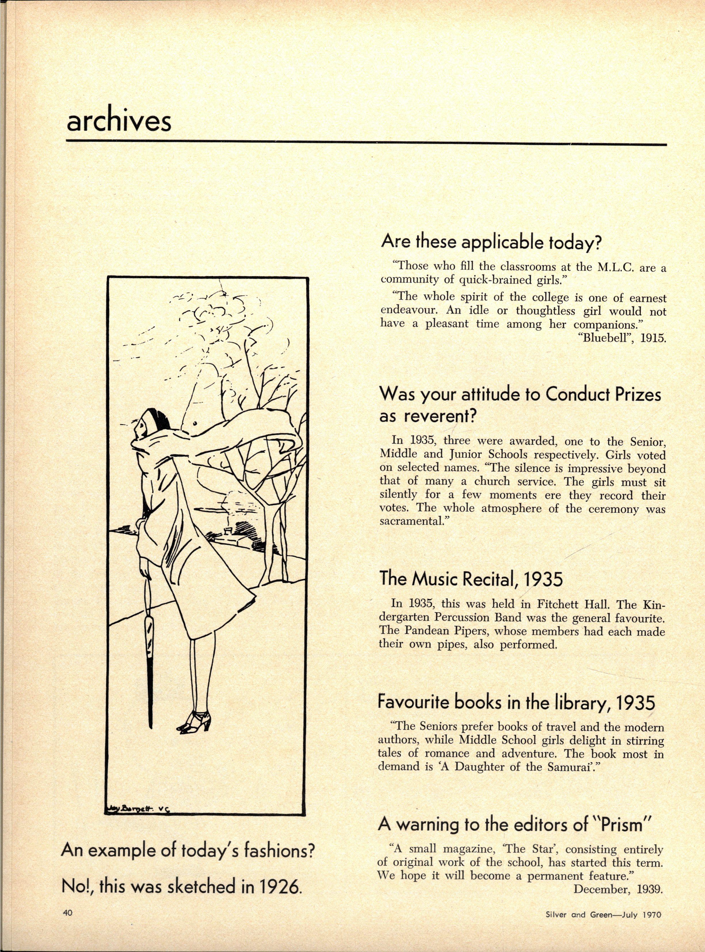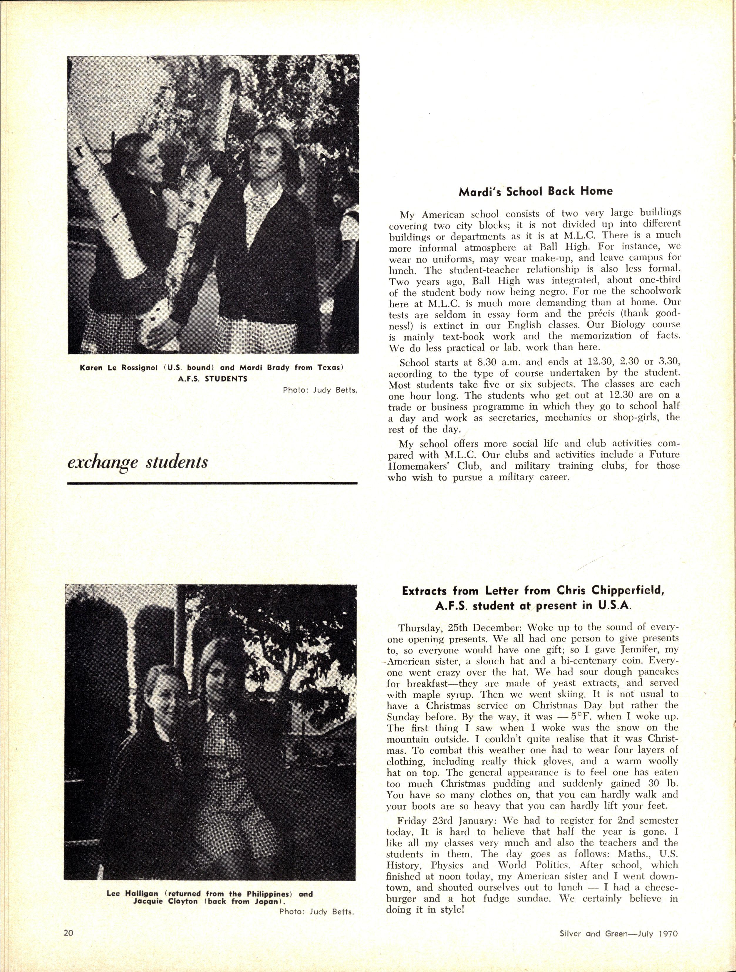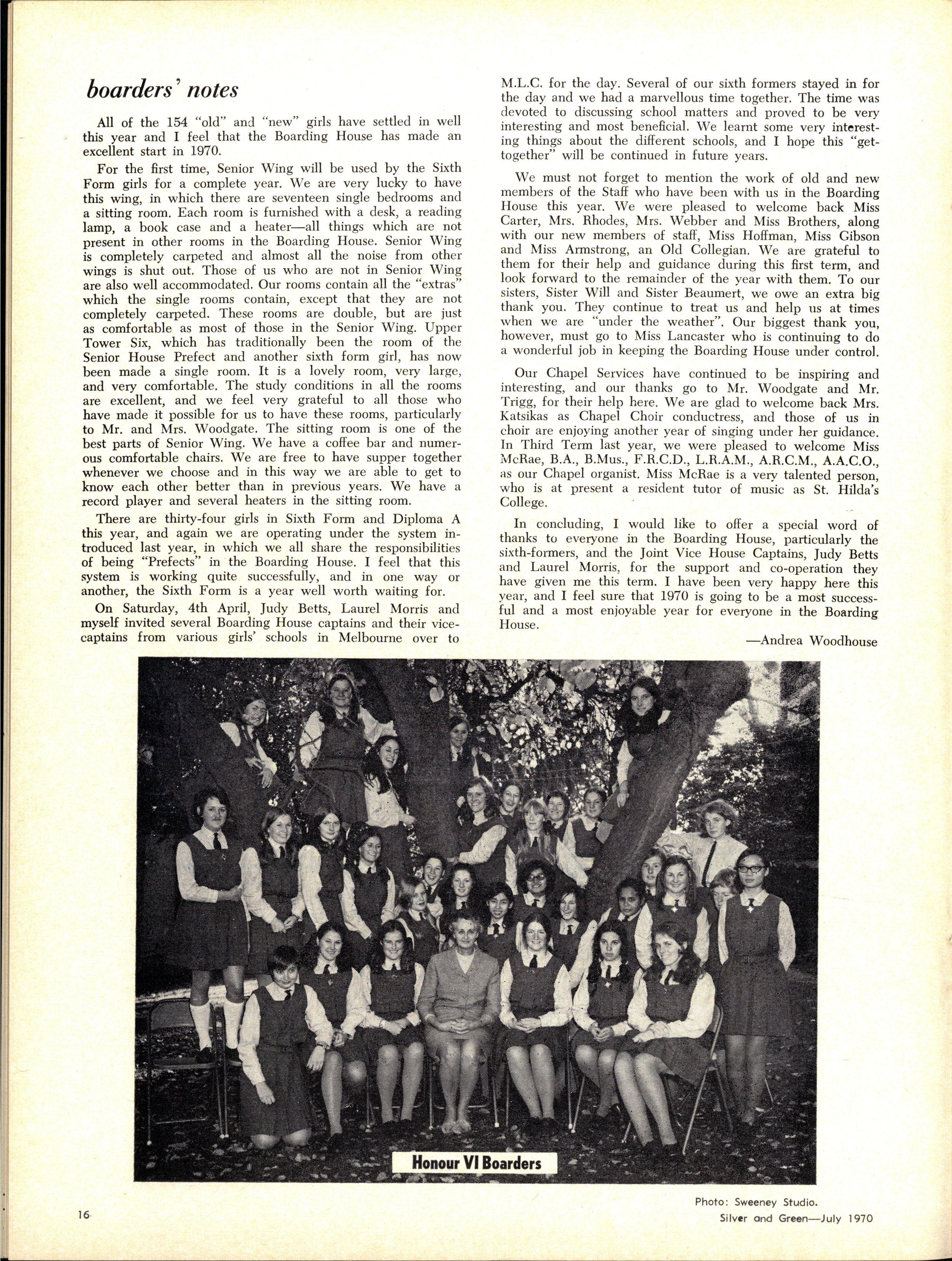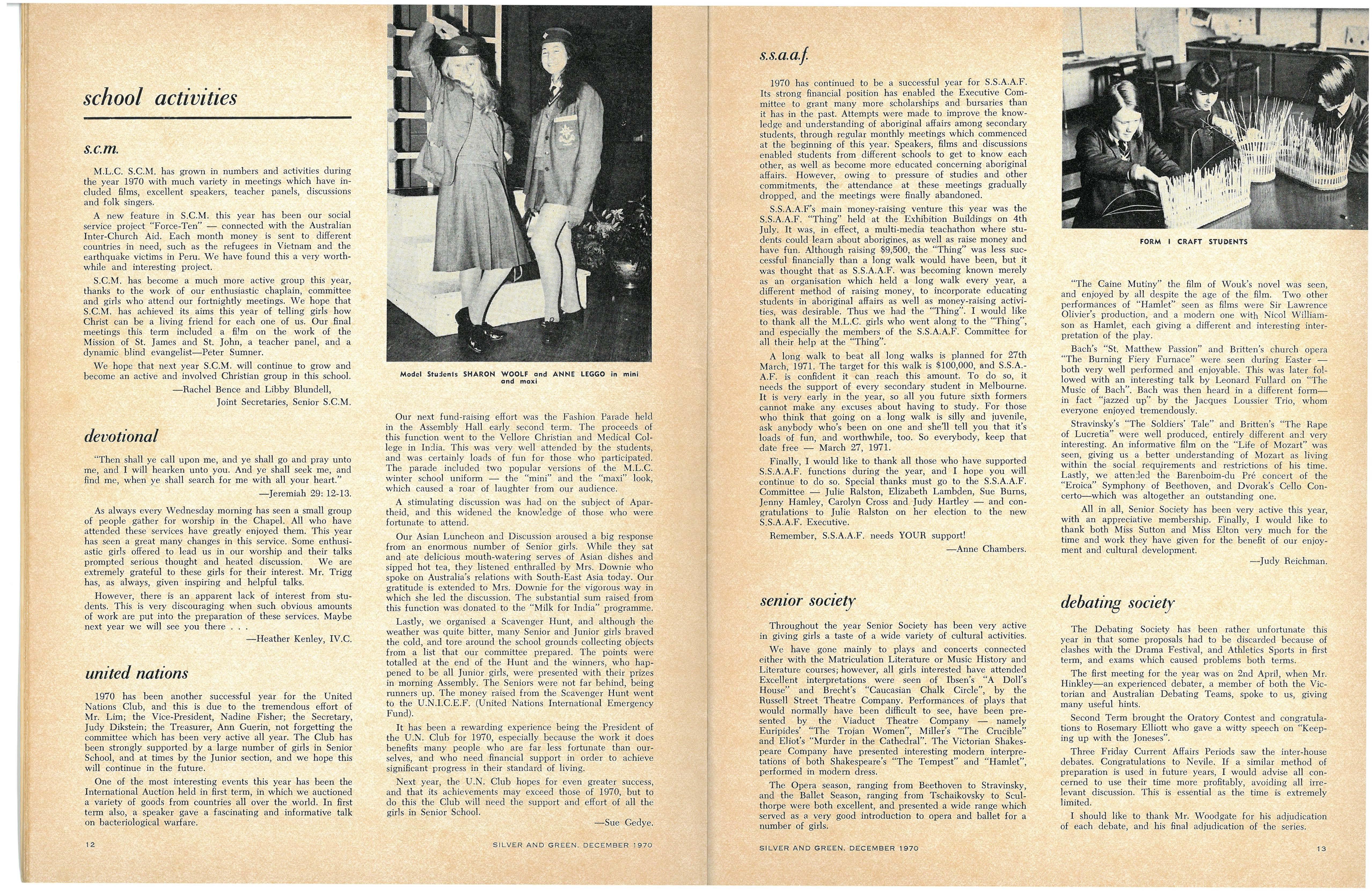 Credit is reflected upon the Music School training, in that six present and two past M.L.C students are in the Victorian Junior Symphony Orchestra, and Janet Douglas, Lynley Carrington, Anne Care and Julie Silverwood are members of the Australian Youth Orchestra which is performing at Expo '70, in Osaka, Japan