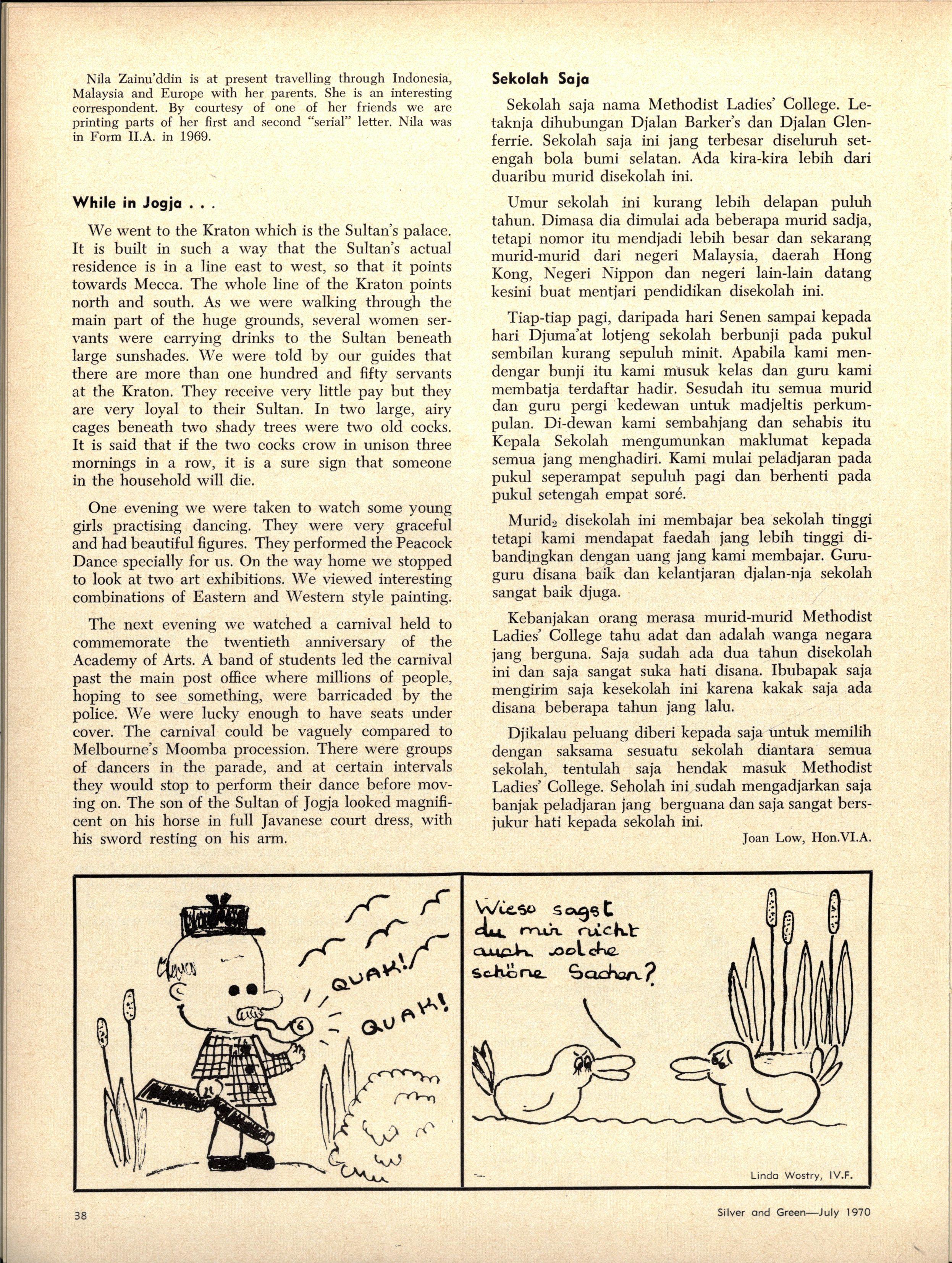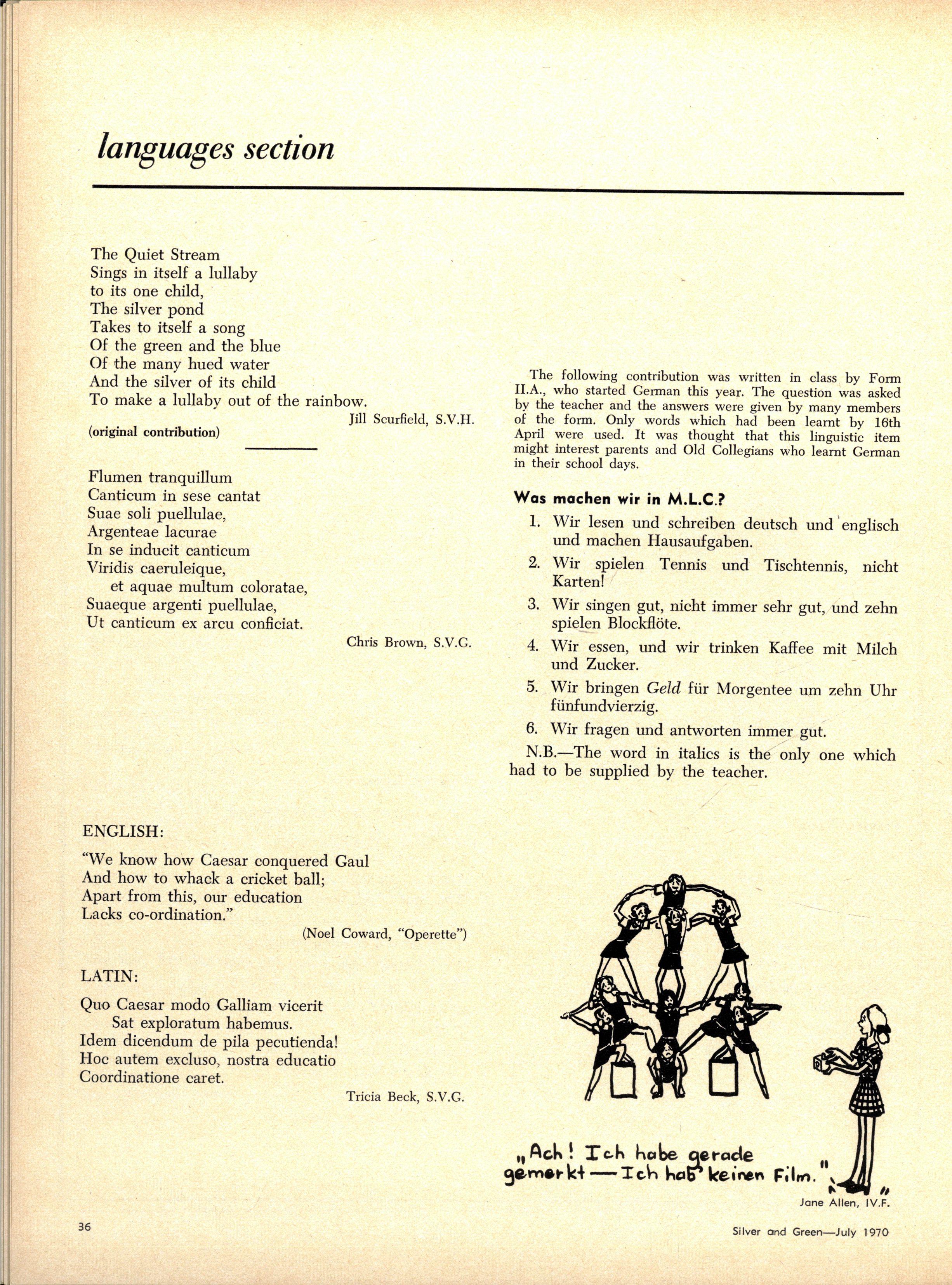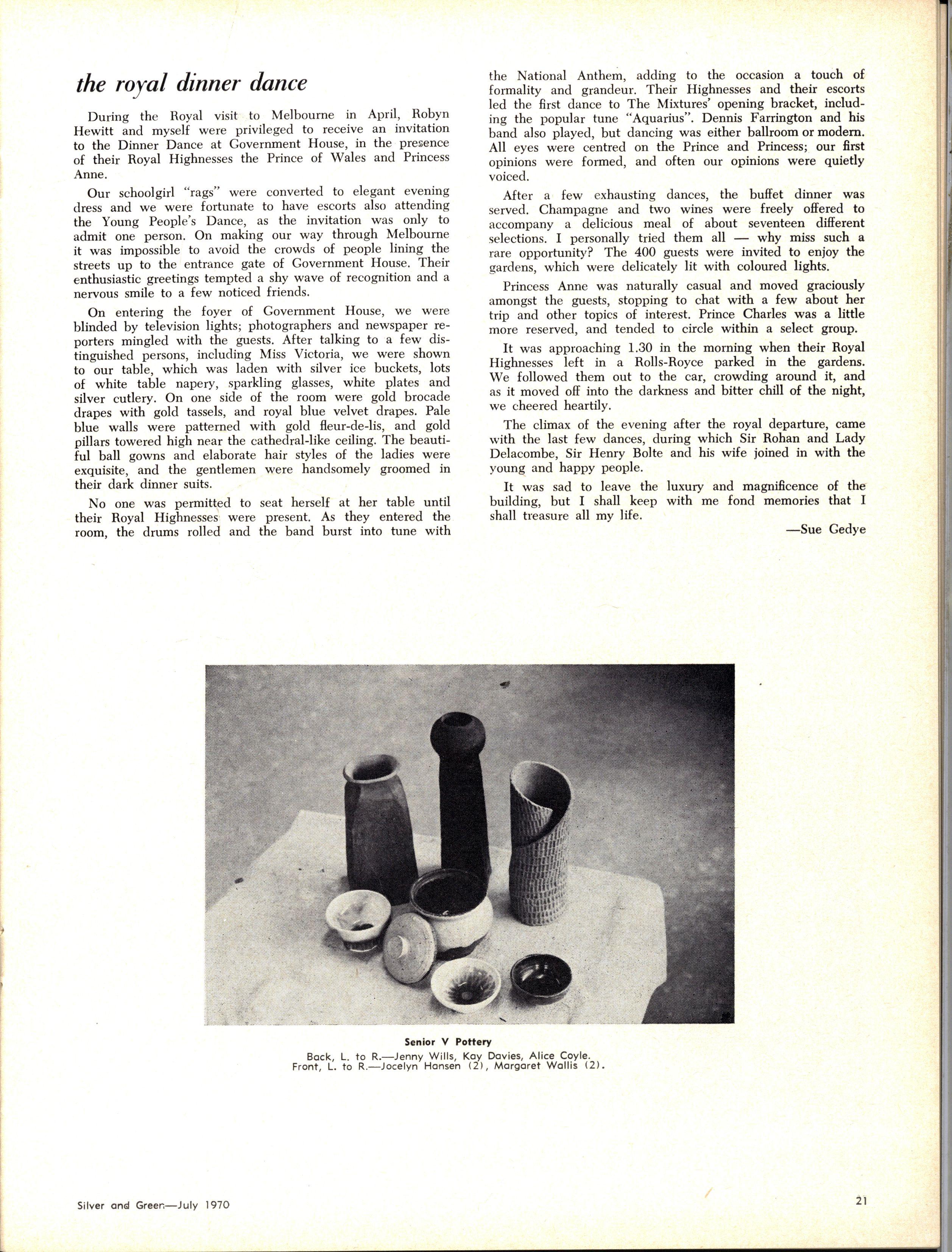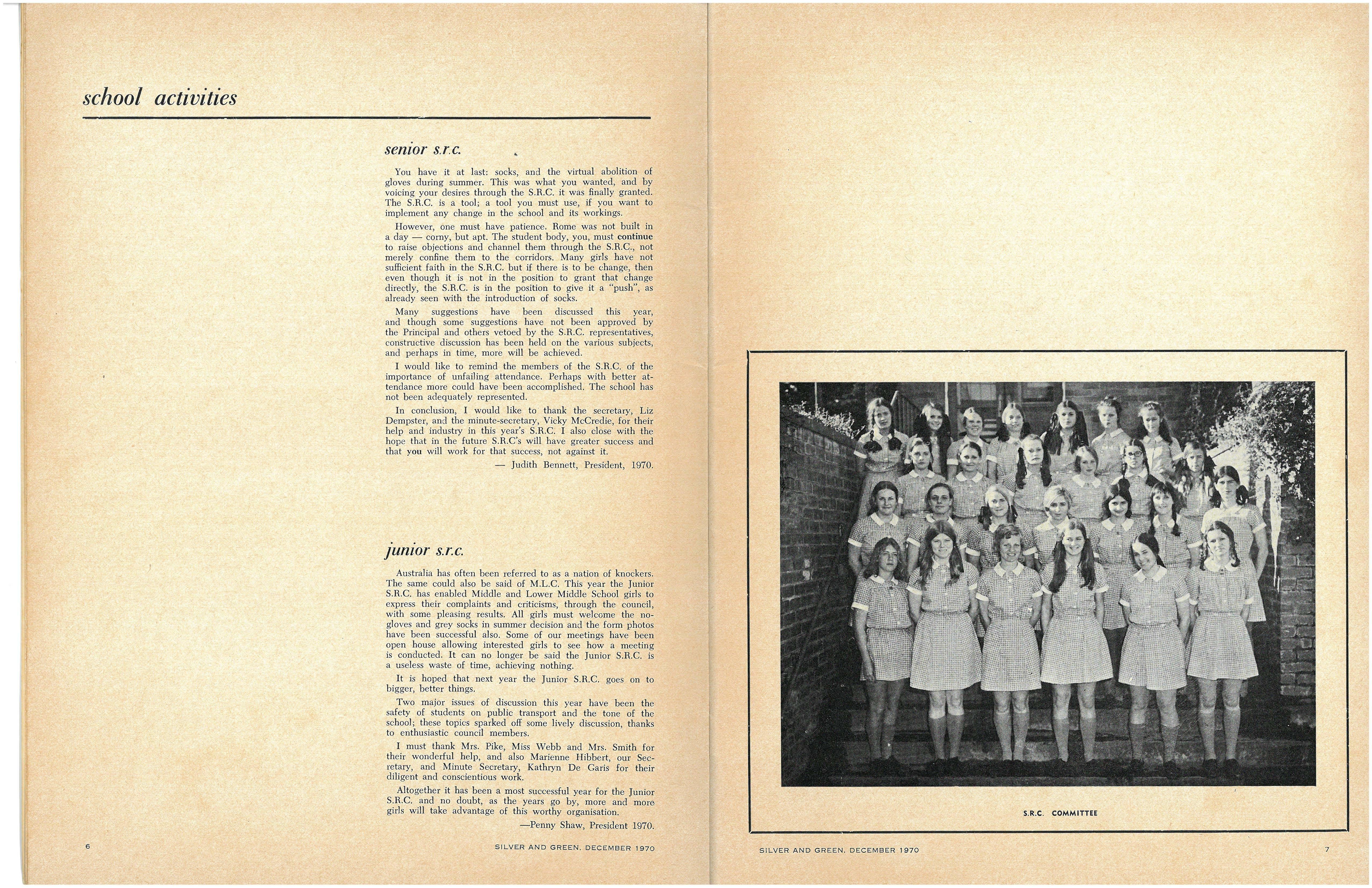 Credit is reflected upon the Music School training, in that six present and two past M.L.C students are in the Victorian Junior Symphony Orchestra, and Janet Douglas, Lynley Carrington, Anne Care and Julie Silverwood are members of the Australian Youth Orchestra which is performing at Expo '70, in Osaka, Japan