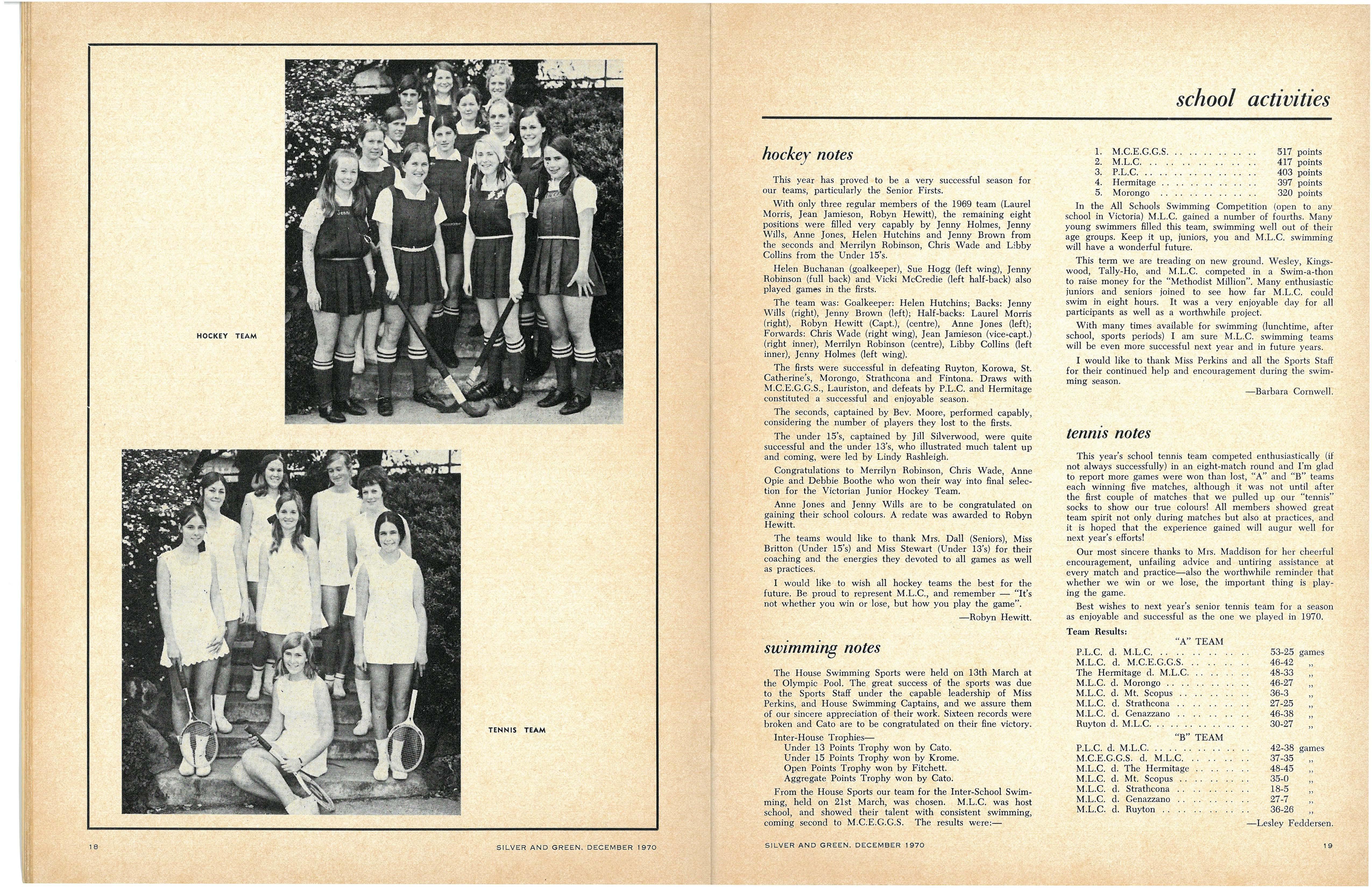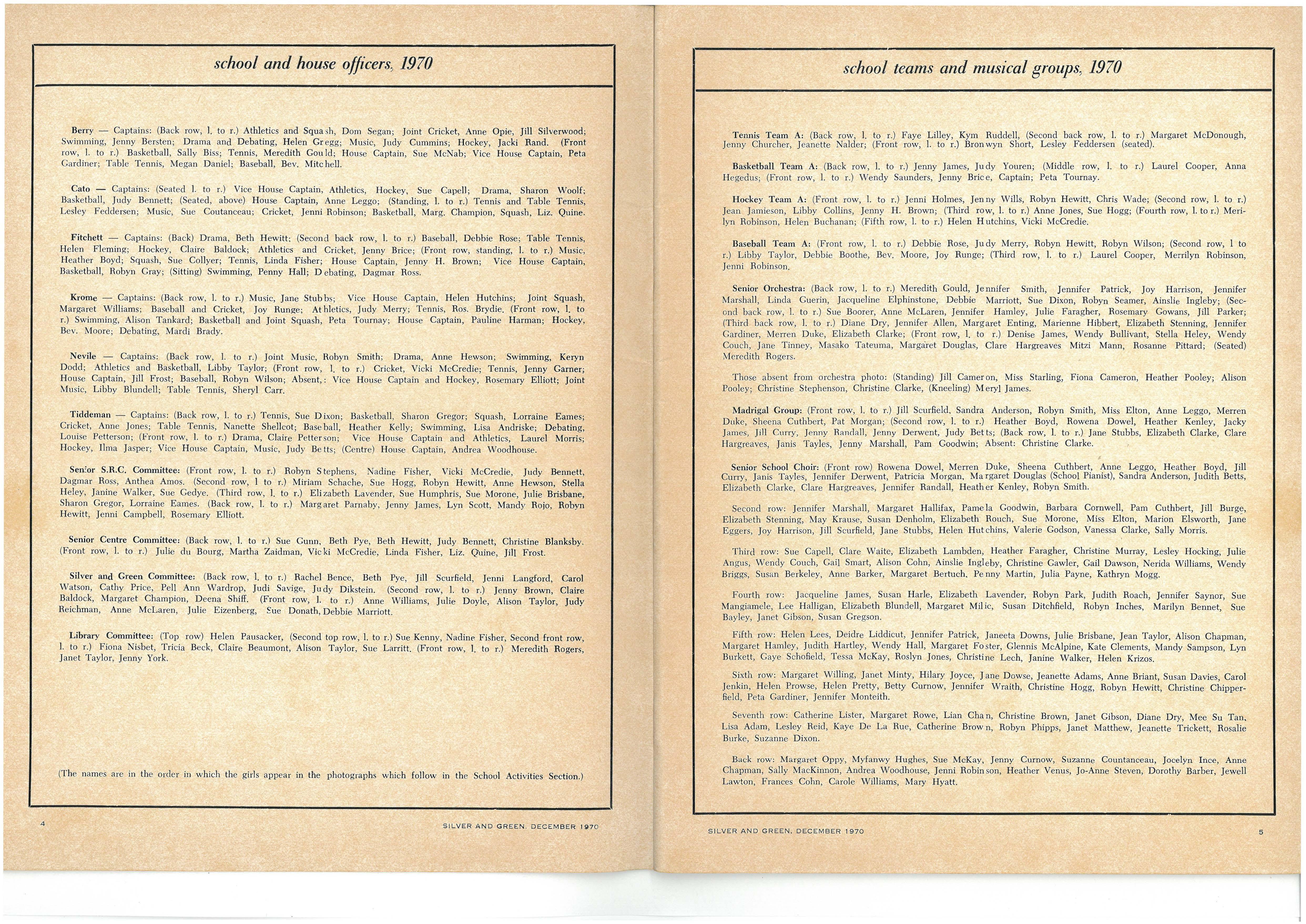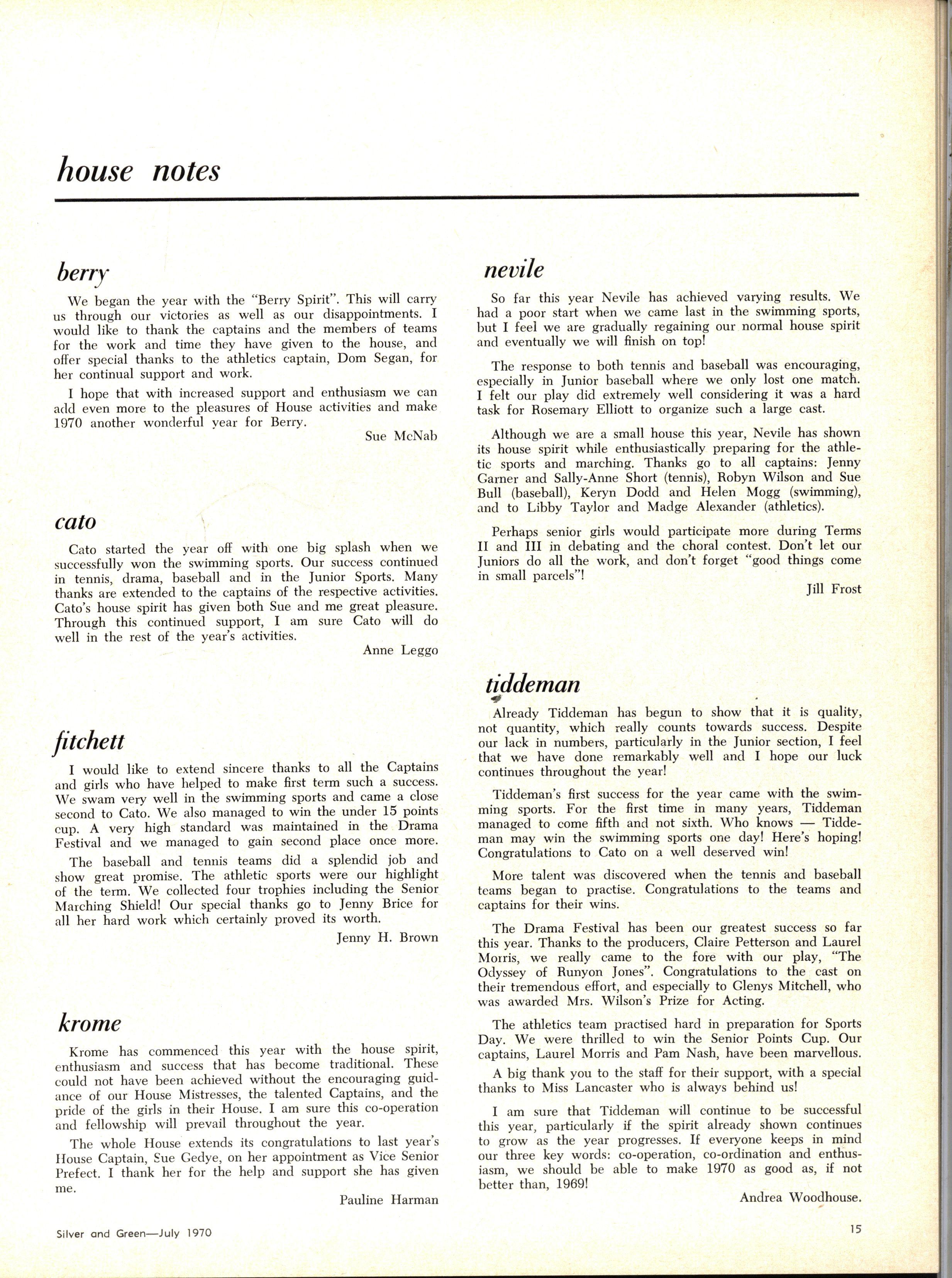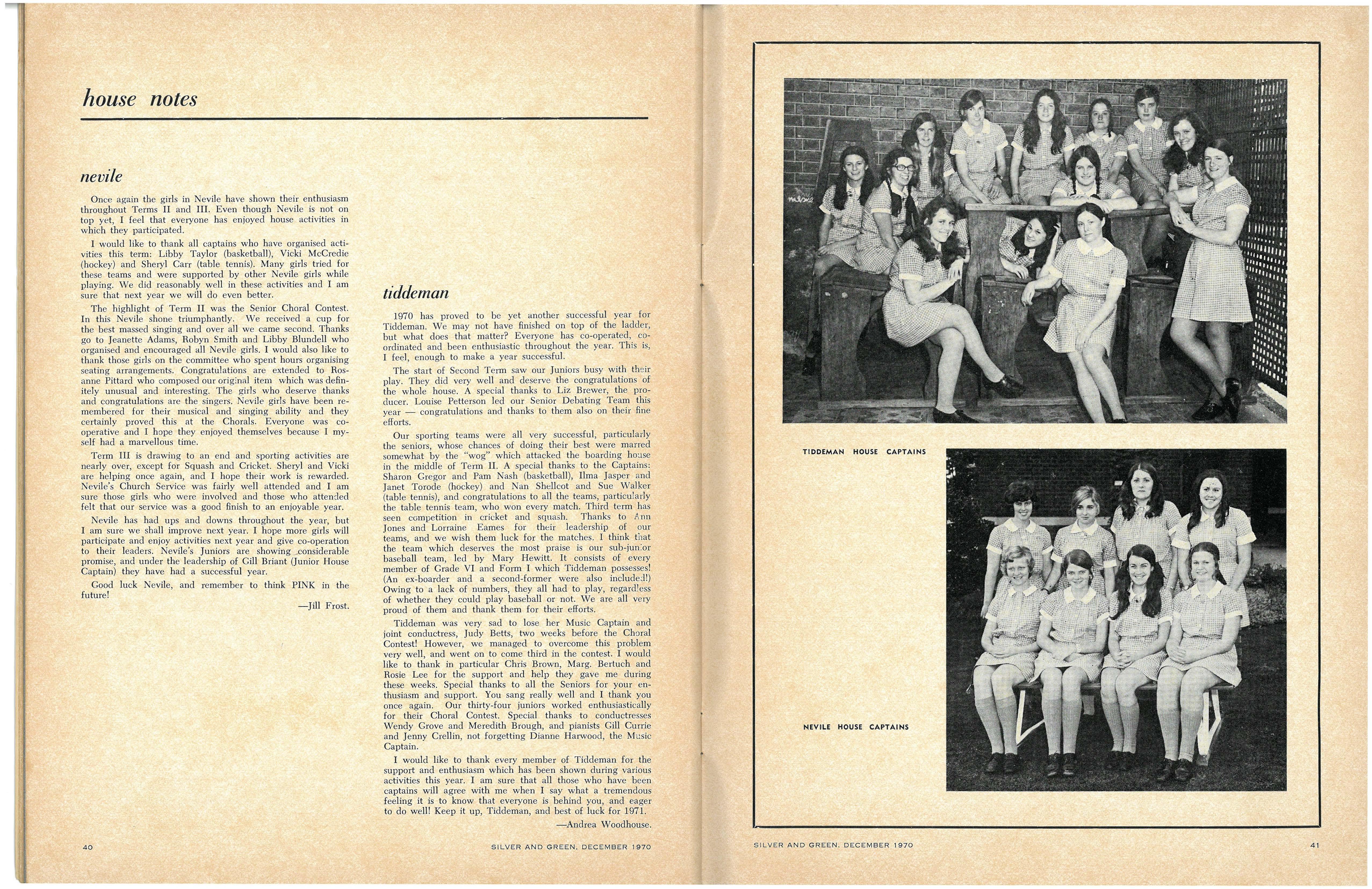 House Vice:Captains: Senior—Peta Gardiner (Berry), Sue Capell (Cato), Robyn Gray (Fitchett), Helen Hutchins (Krome), Rosemary Elliott (Nevile), Judy Betts, Laurel Morris (Joint) (Tiddeman) Junior—Margaret Hamley (Berry), Lindy Steggal (Cato), Heather Jack (Fitchett), Jenny Green (Krome), Yvonne Ackerley (Nevile), Sue Walker, Leeanne Smith (Joint) (Tiddeman)