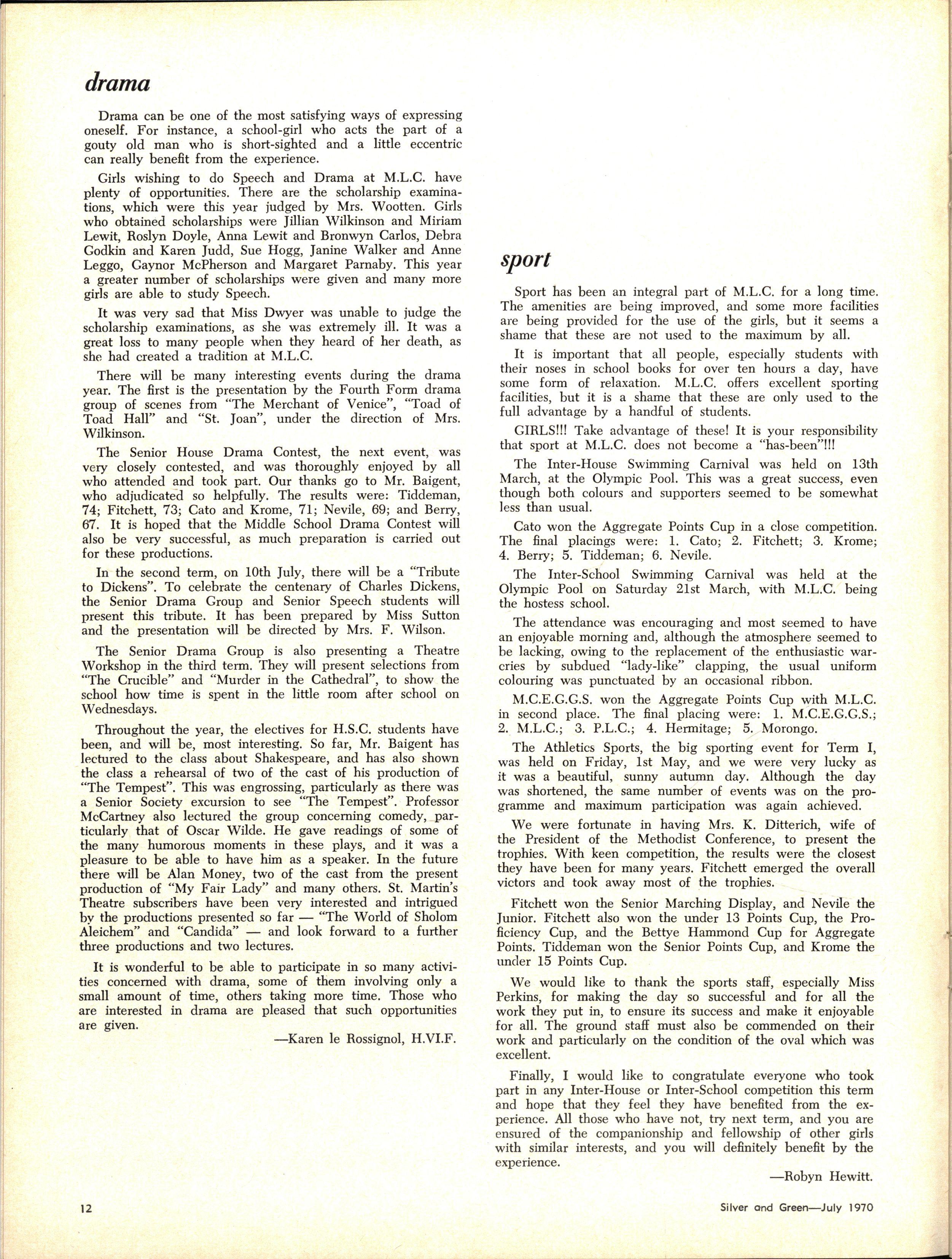 Girls wishing to do Speech and Drama at M.L.C have plenty of opportunities There are the scholarship examinations, which were this year judged by Mrs Wootten Girls who obtained scholarships were Jillian Wilkinson and Miriam Lewit, Roslyn Doyle, Anna Lewit and Bronwyn Carlos, Debra Godkin and Karen Judd, Sue Hogg, Janine Walker and Anne Leggo, Gaynor McPherson and Margaret Parnaby This year a greater number of scholarships were given and many more girls are able to study Speech