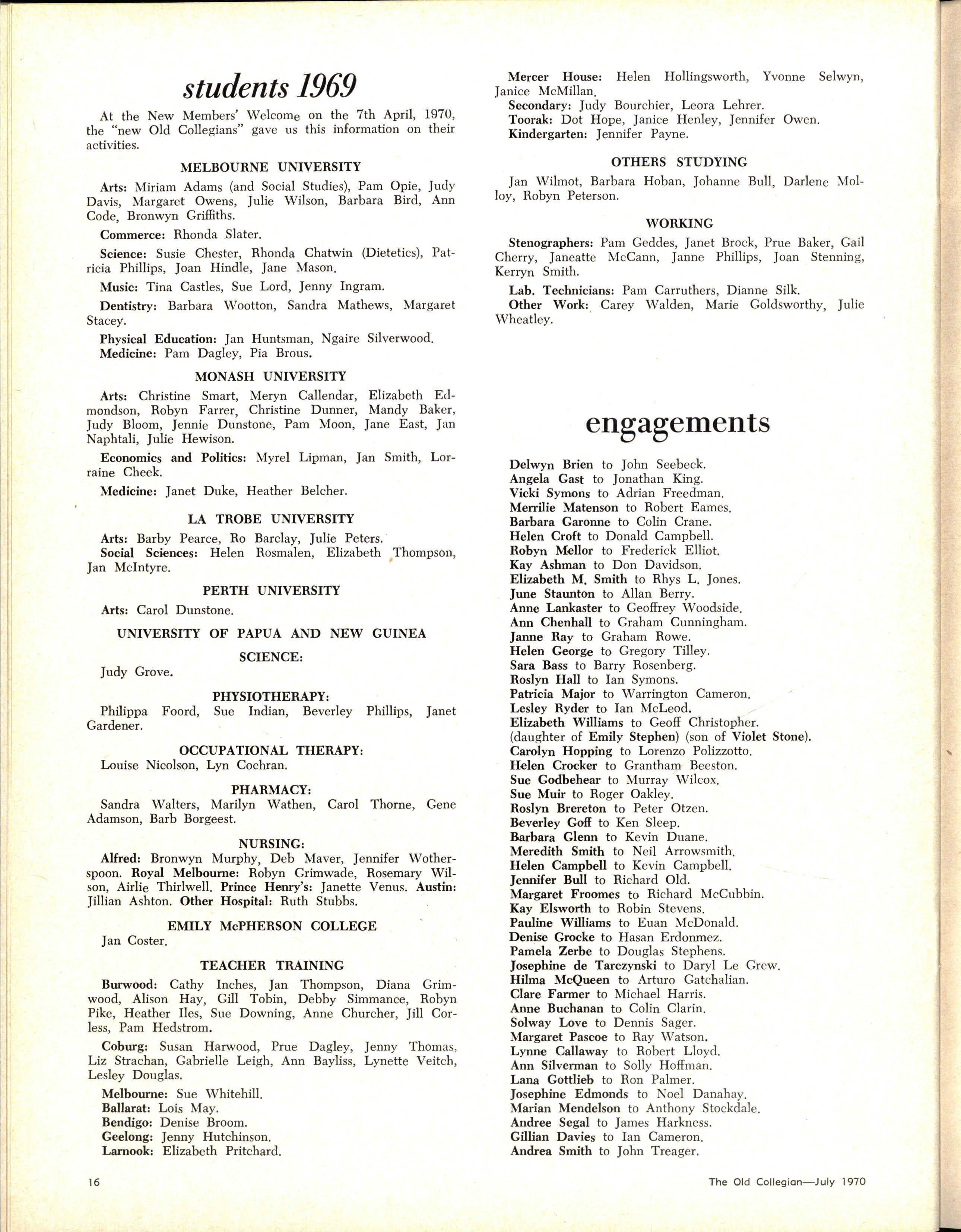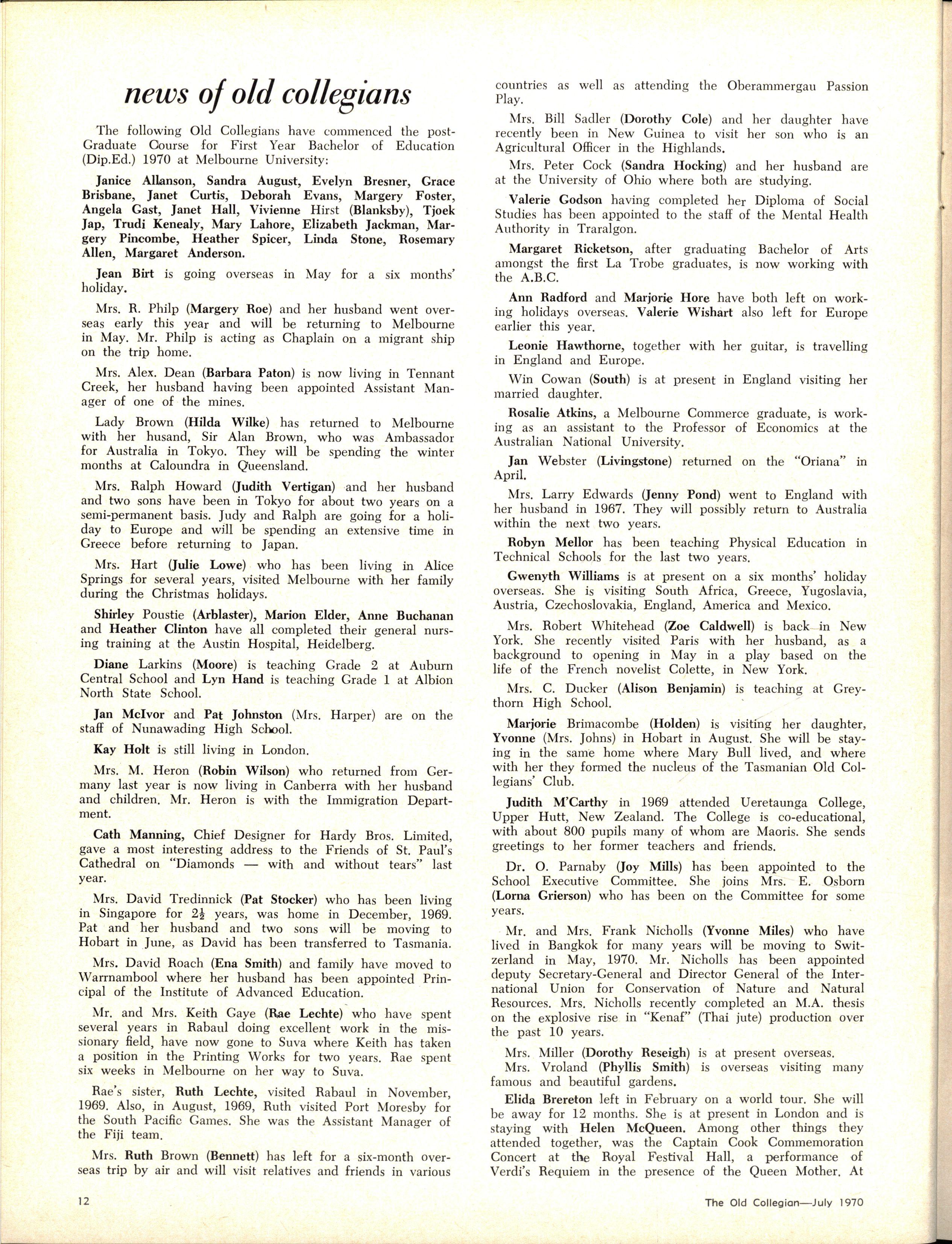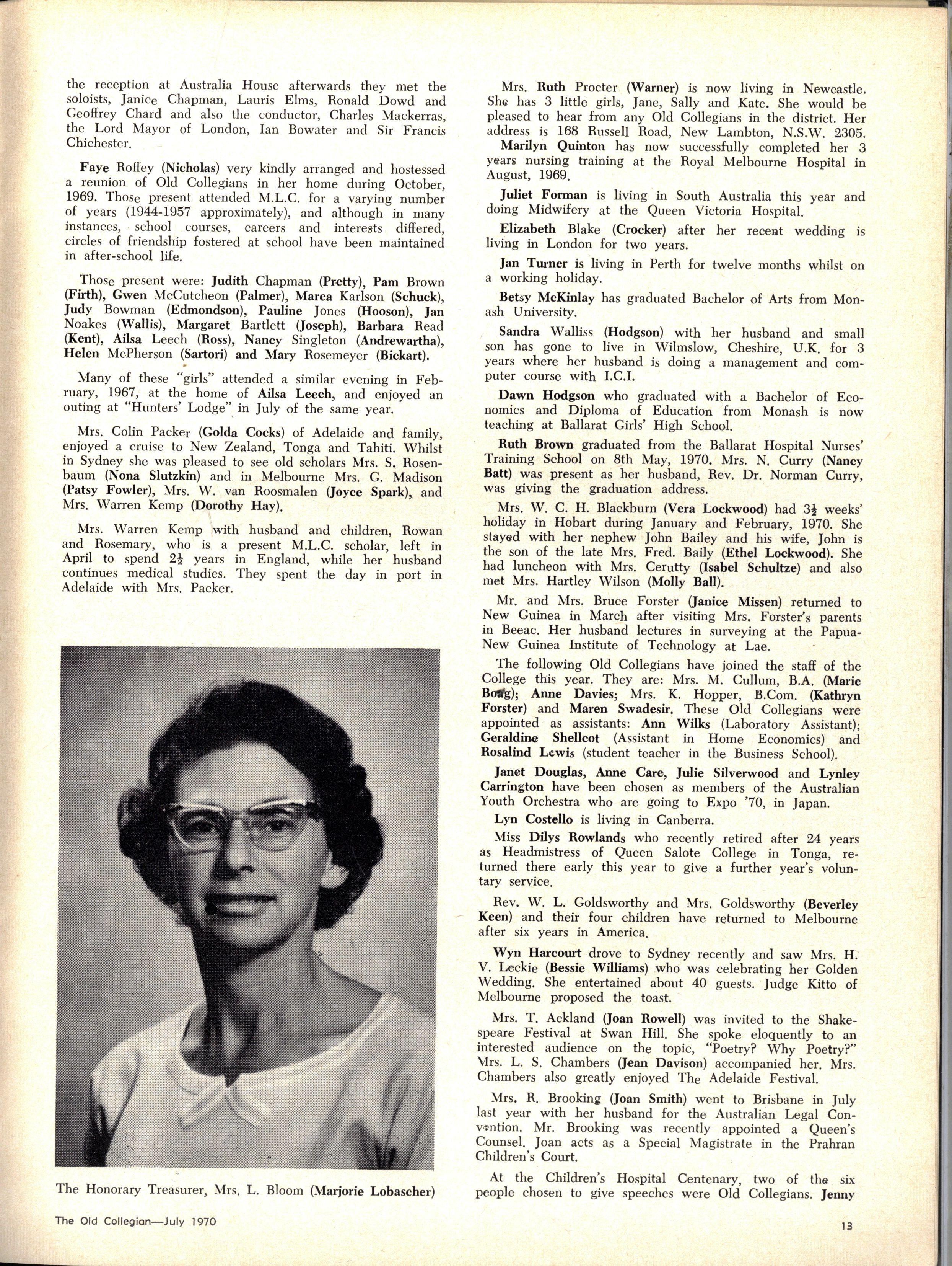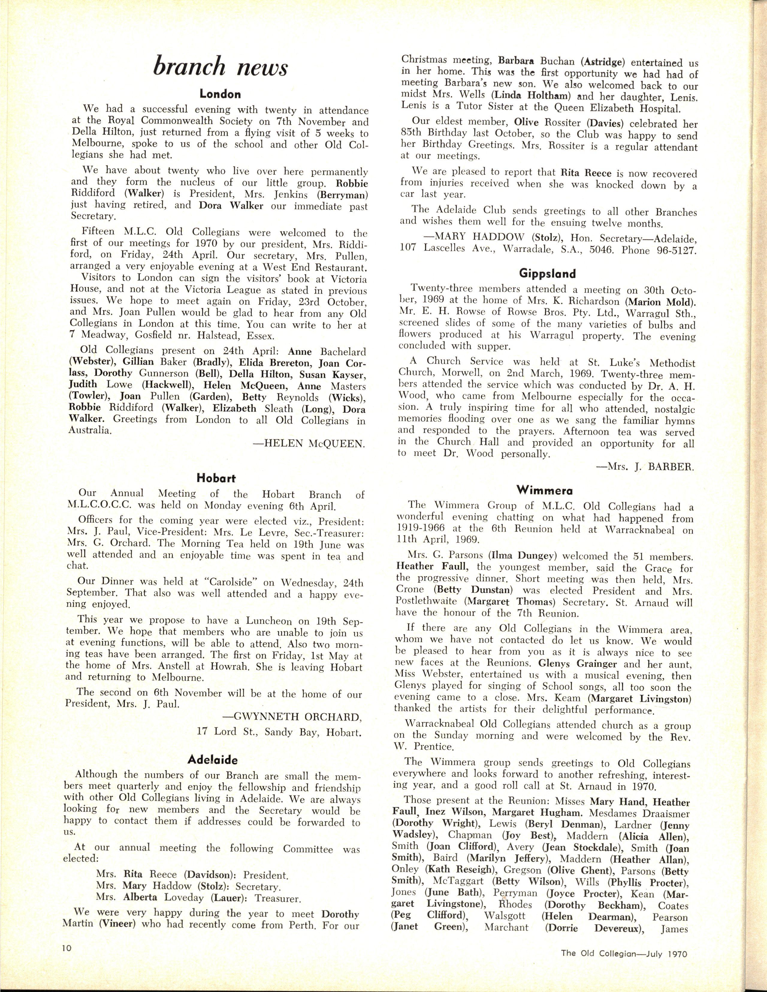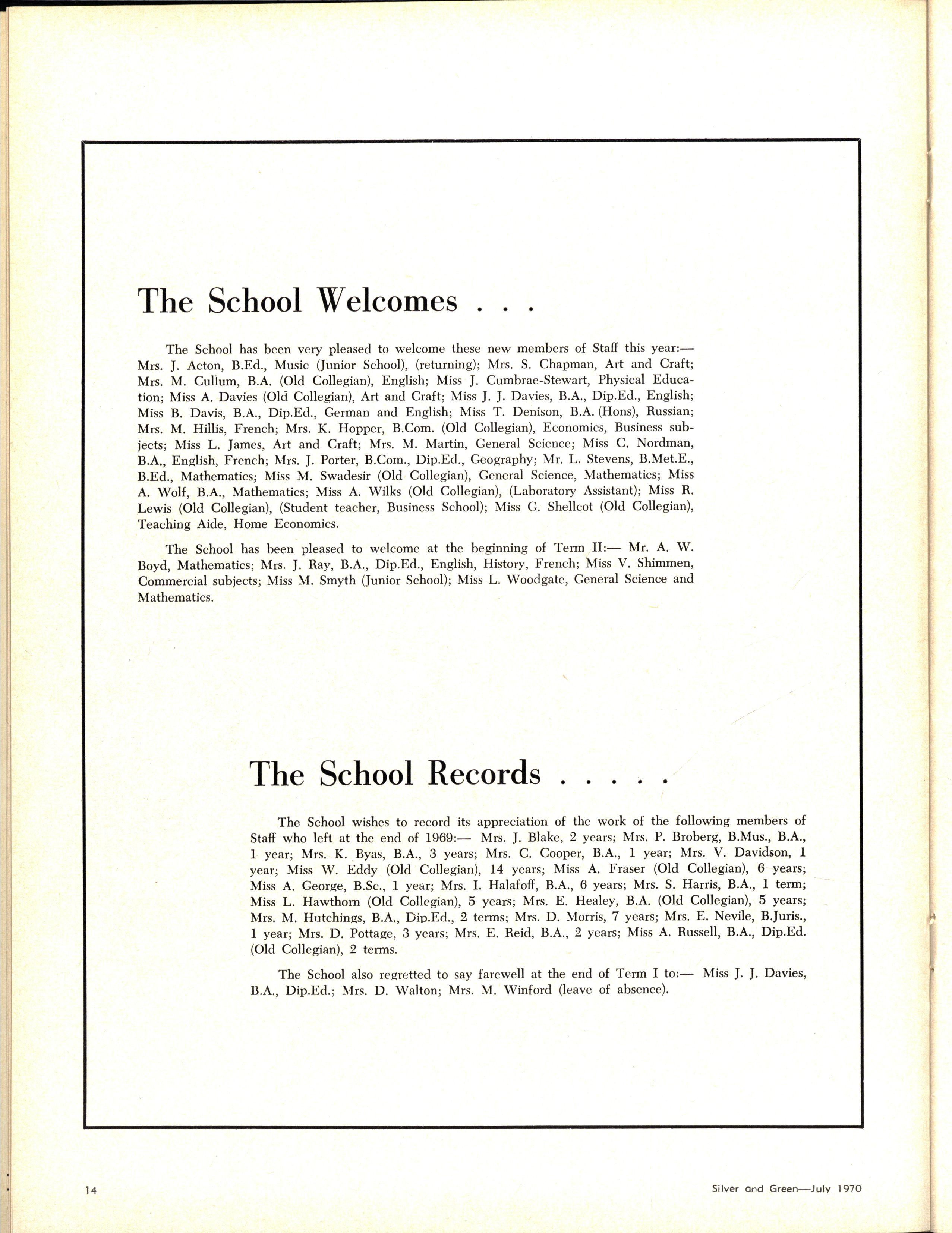 The School wishes to record its appreciation of the work of the following members of Staff who left at the end of 1969: Mrs J Blake, 2 years; Mrs P Broberg, B.Mus., B.A., 1 year; Mrs K Byas, B.A., 3 years; Mrs C Cooper, B.A., 1 year; Mrs V Davidson, 1 year; Miss W Eddy (Old Collegian), 14 years; Miss A Fraser (Old Collegian), 6 years; Miss A George, B.Sc., 1 year; Mrs I Halafoff, B.A., 6 years; Mrs S Harris, B.A., 1 term; Miss L Hawthorn (Old Collegian), 5 years; Mrs E Healey, B.A (Old Collegian), 5 years; Mrs M Hutchings, B.A., Dip.Ed., 2 terms; Mrs D Morris, 7 years; Mrs E Nevile, B.Juris., 1 year; Mrs D Pottage, 3 years; Mrs E Beid, B.A., 2 years; Miss A Russell, B.A., Dip.Ed (Old Collegian), 2 terms