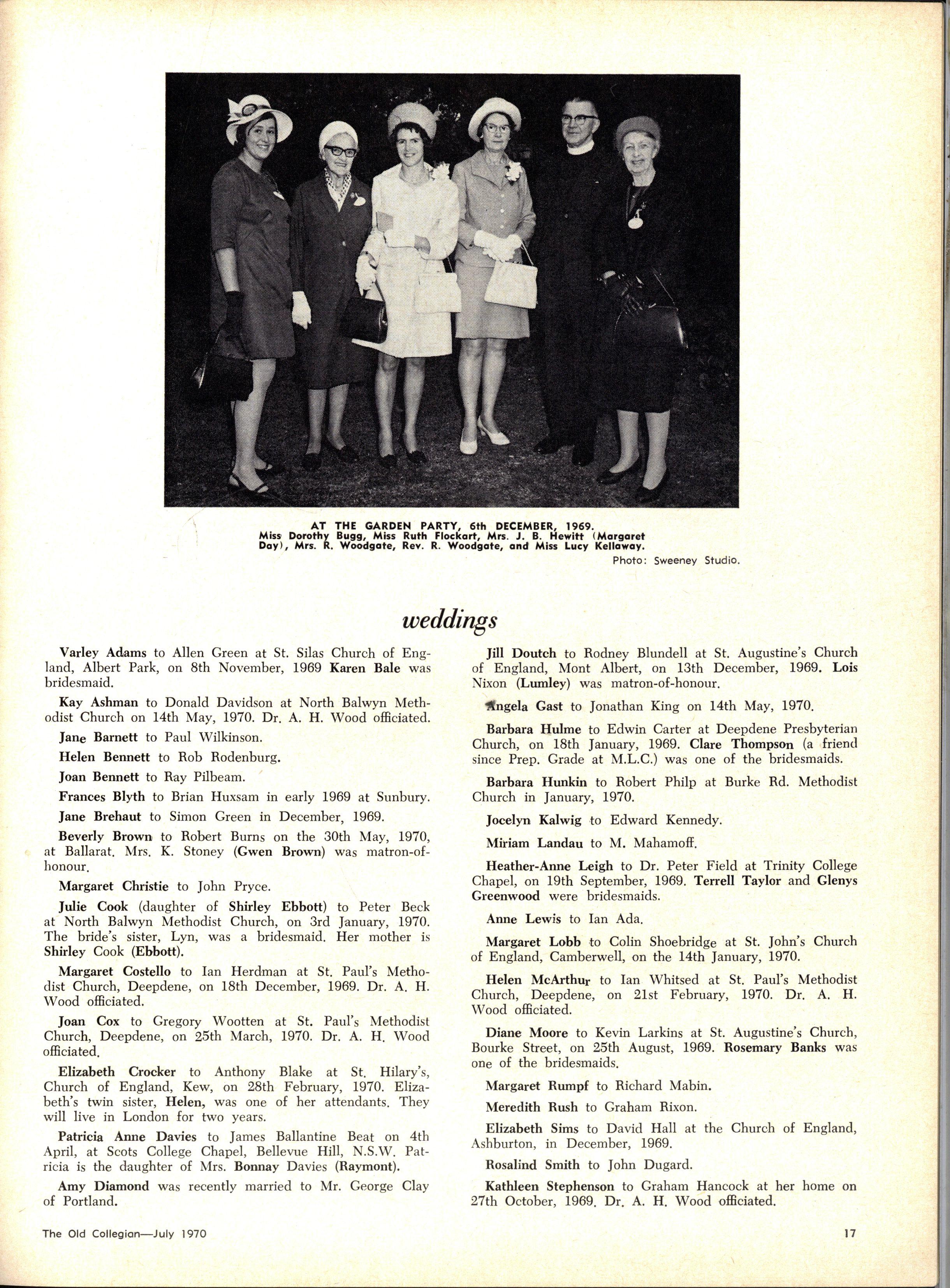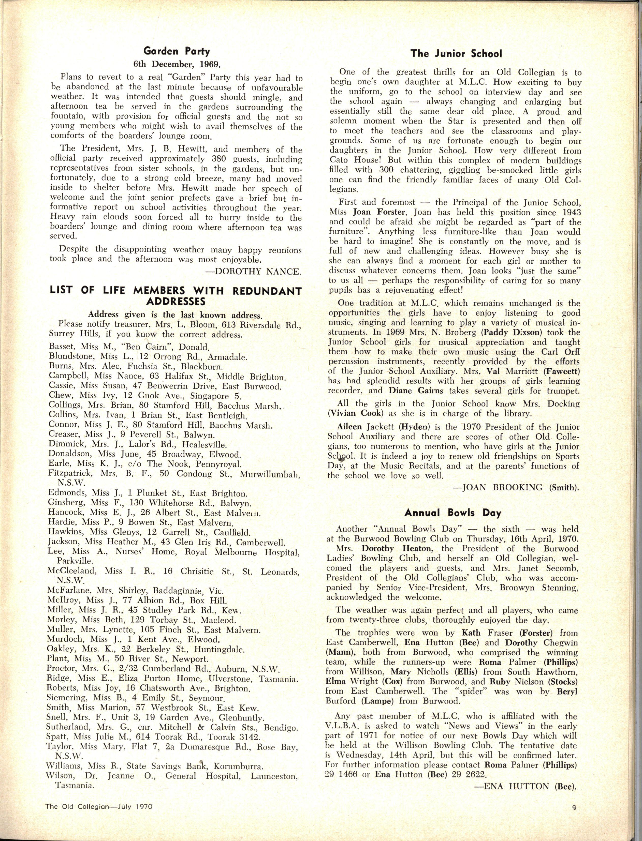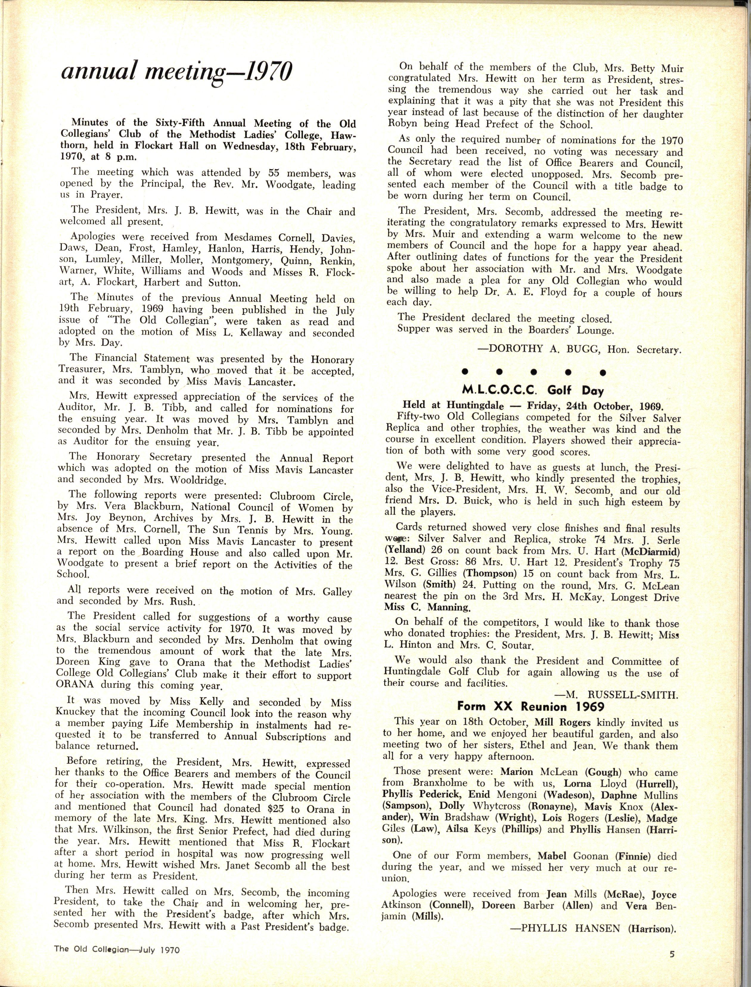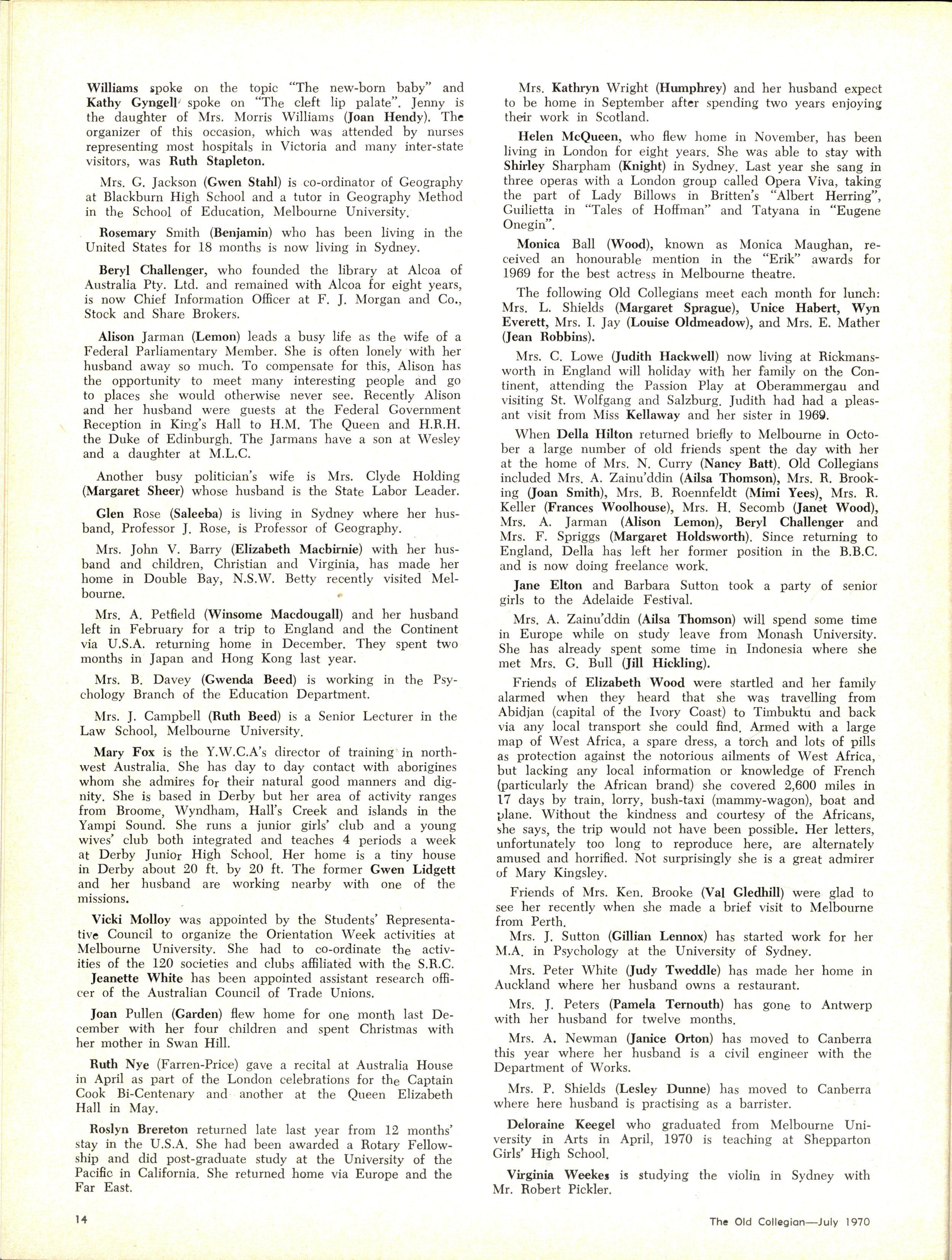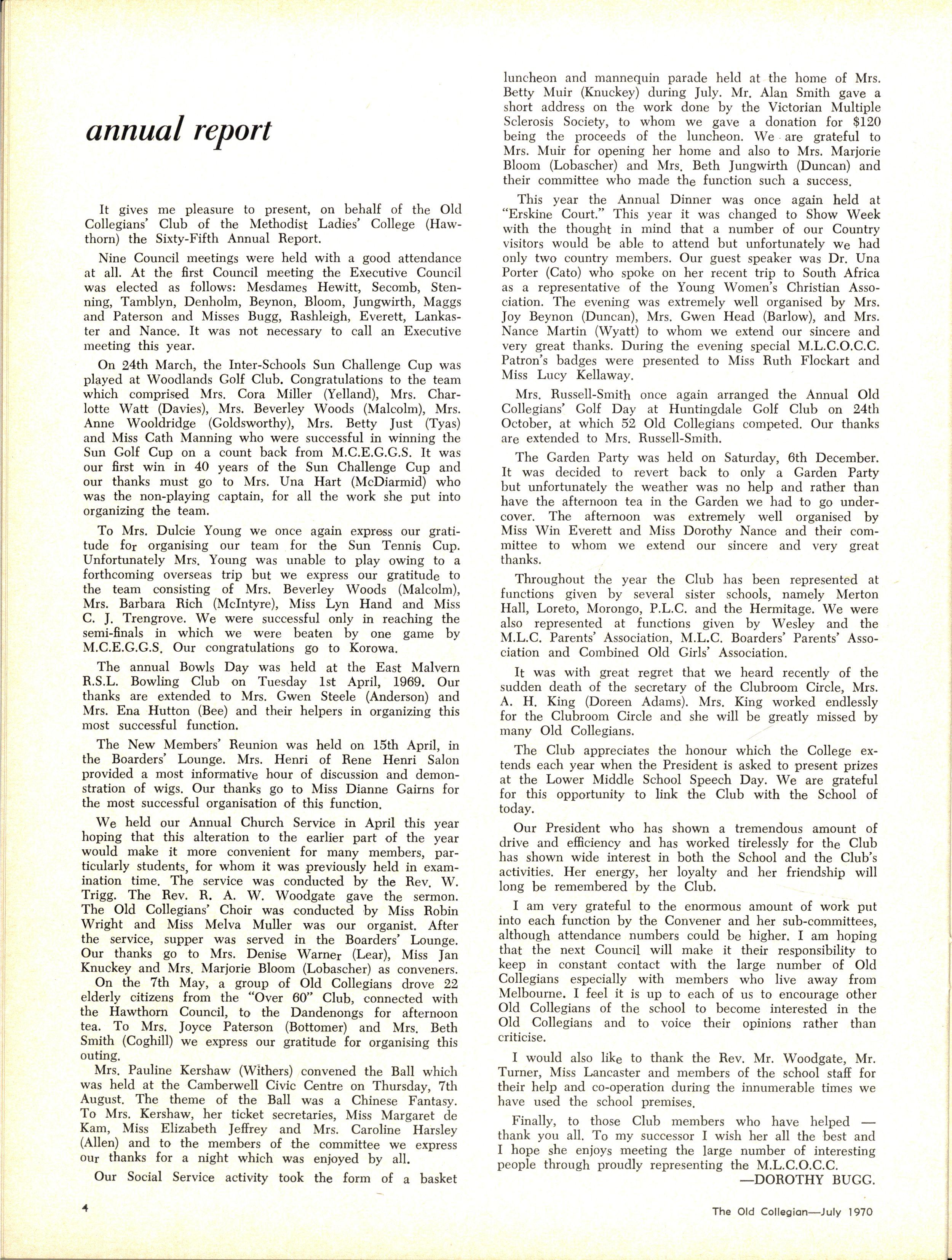 The School wishes to record its appreciation of the work of the following members of Staff who left at the end of 1969: Mrs J Blake, 2 years; Mrs P Broberg, B.Mus., B.A., 1 year; Mrs K Byas, B.A., 3 years; Mrs C Cooper, B.A., 1 year; Mrs V Davidson, 1 year; Miss W Eddy (Old Collegian), 14 years; Miss A Fraser (Old Collegian), 6 years; Miss A George, B.Sc., 1 year; Mrs I Halafoff, B.A., 6 years; Mrs S Harris, B.A., 1 term; Miss L Hawthorn (Old Collegian), 5 years; Mrs E Healey, B.A (Old Collegian), 5 years; Mrs M Hutchings, B.A., Dip.Ed., 2 terms; Mrs D Morris, 7 years; Mrs E Nevile, B.Juris., 1 year; Mrs D Pottage, 3 years; Mrs E Beid, B.A., 2 years; Miss A Russell, B.A., Dip.Ed (Old Collegian), 2 terms