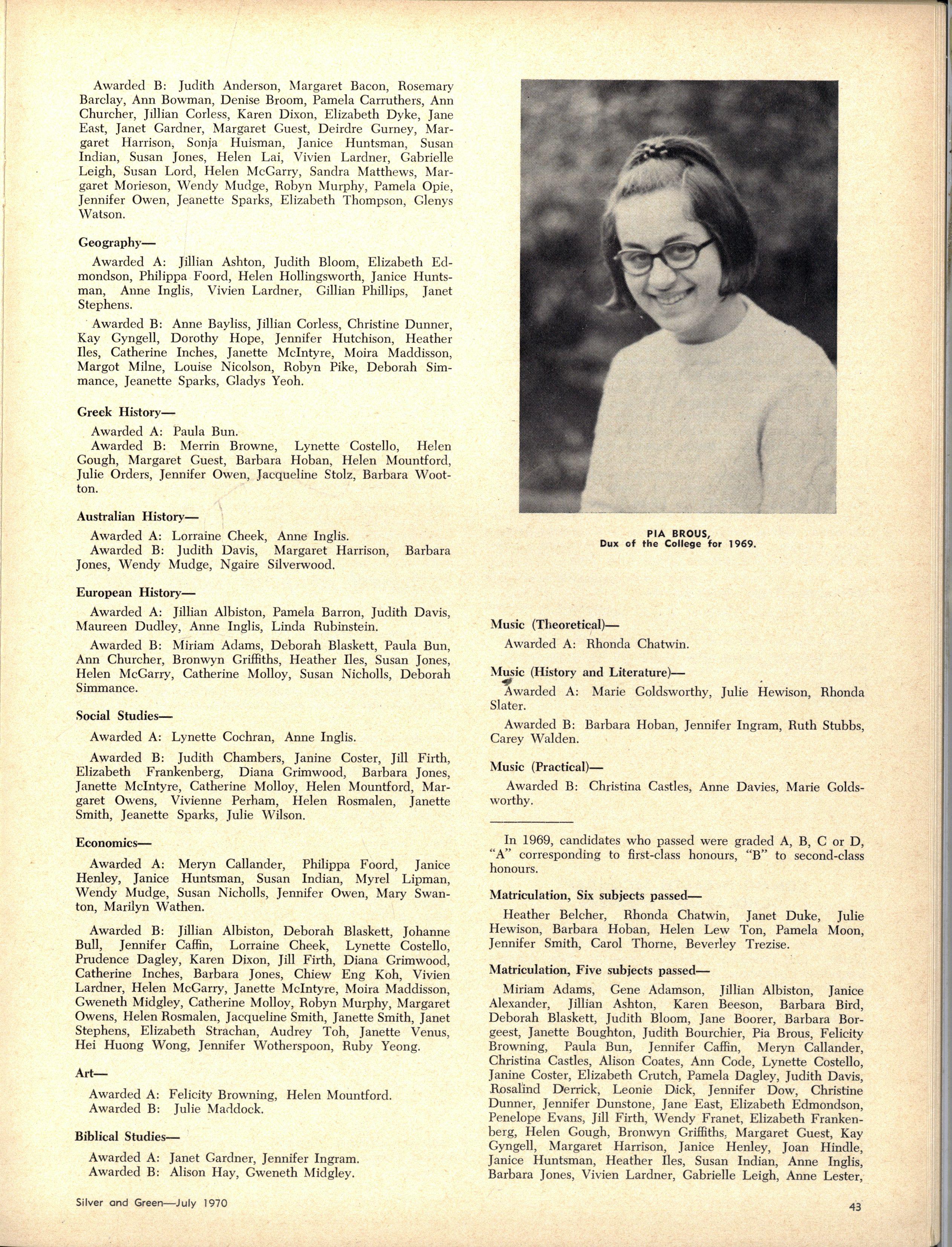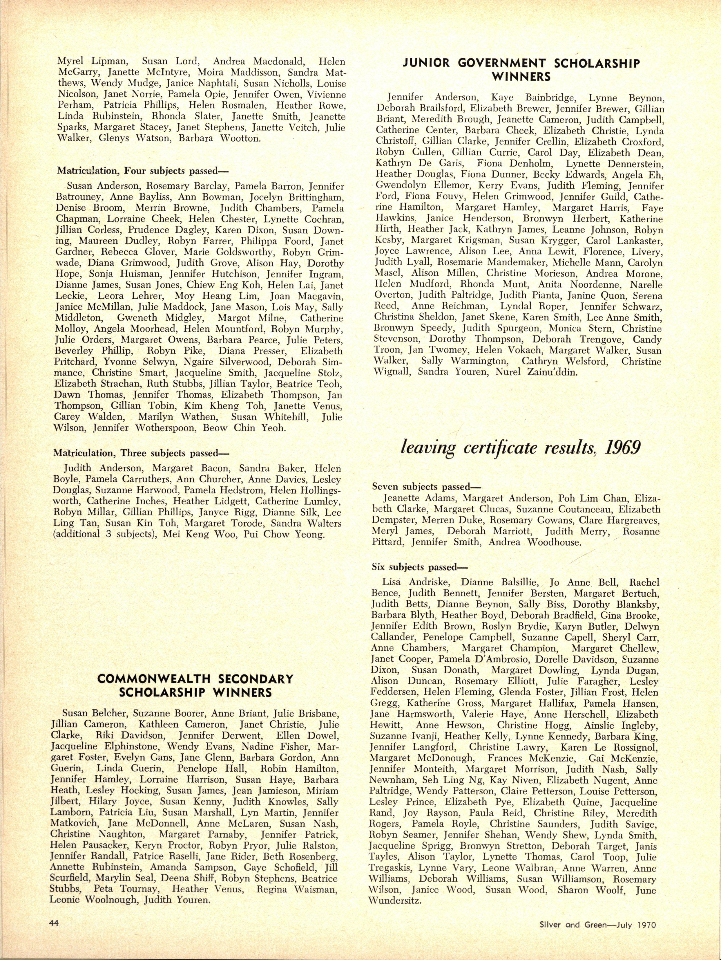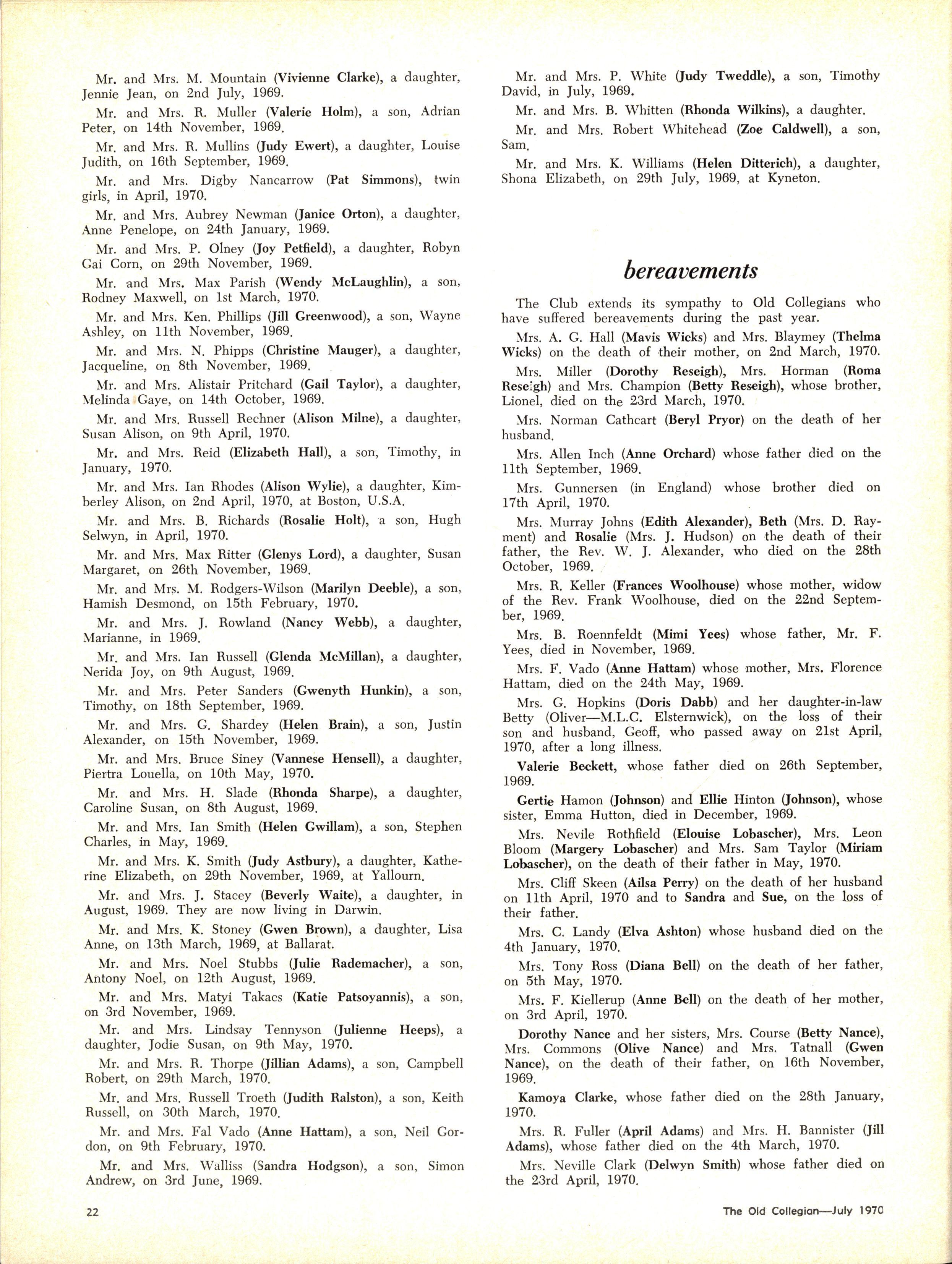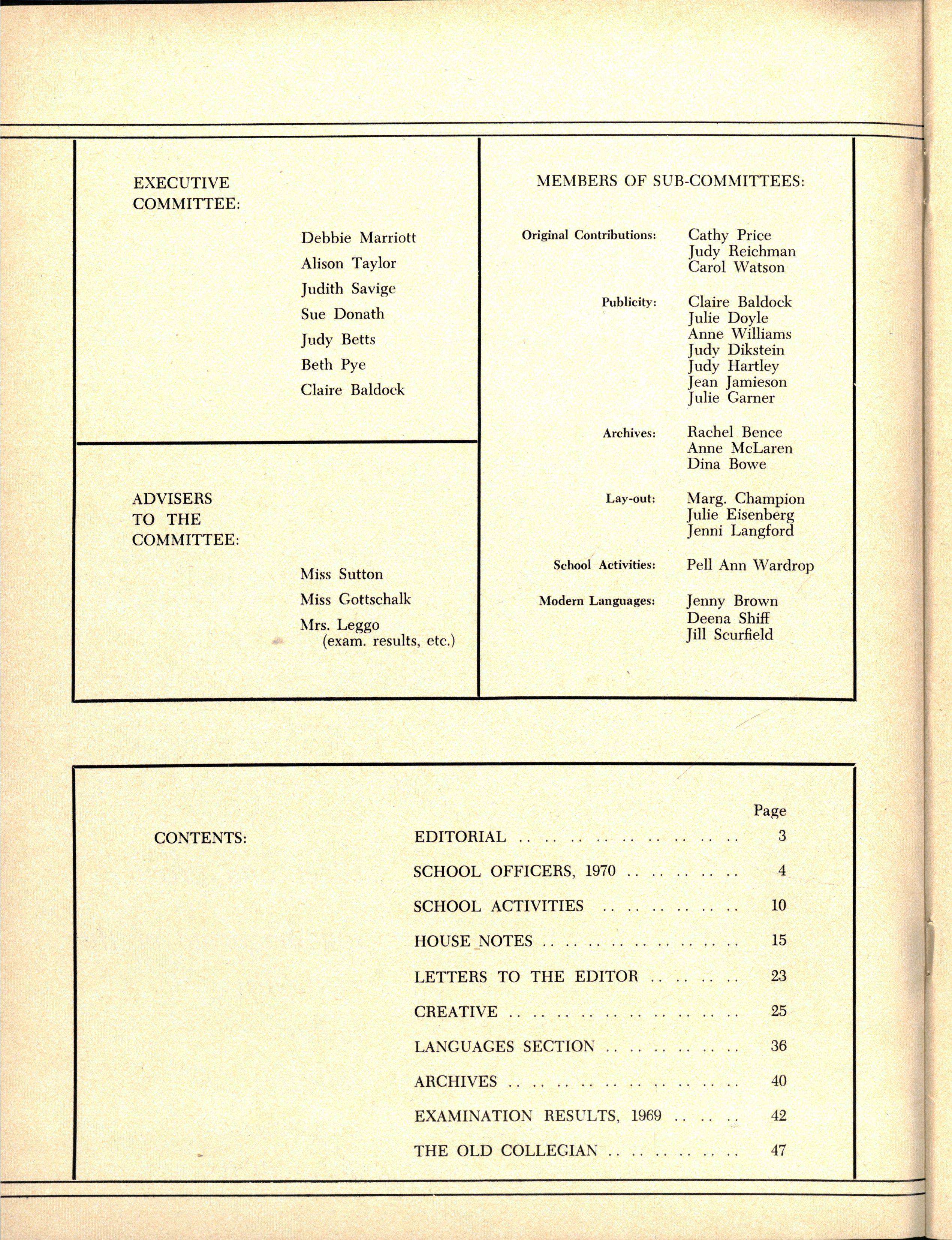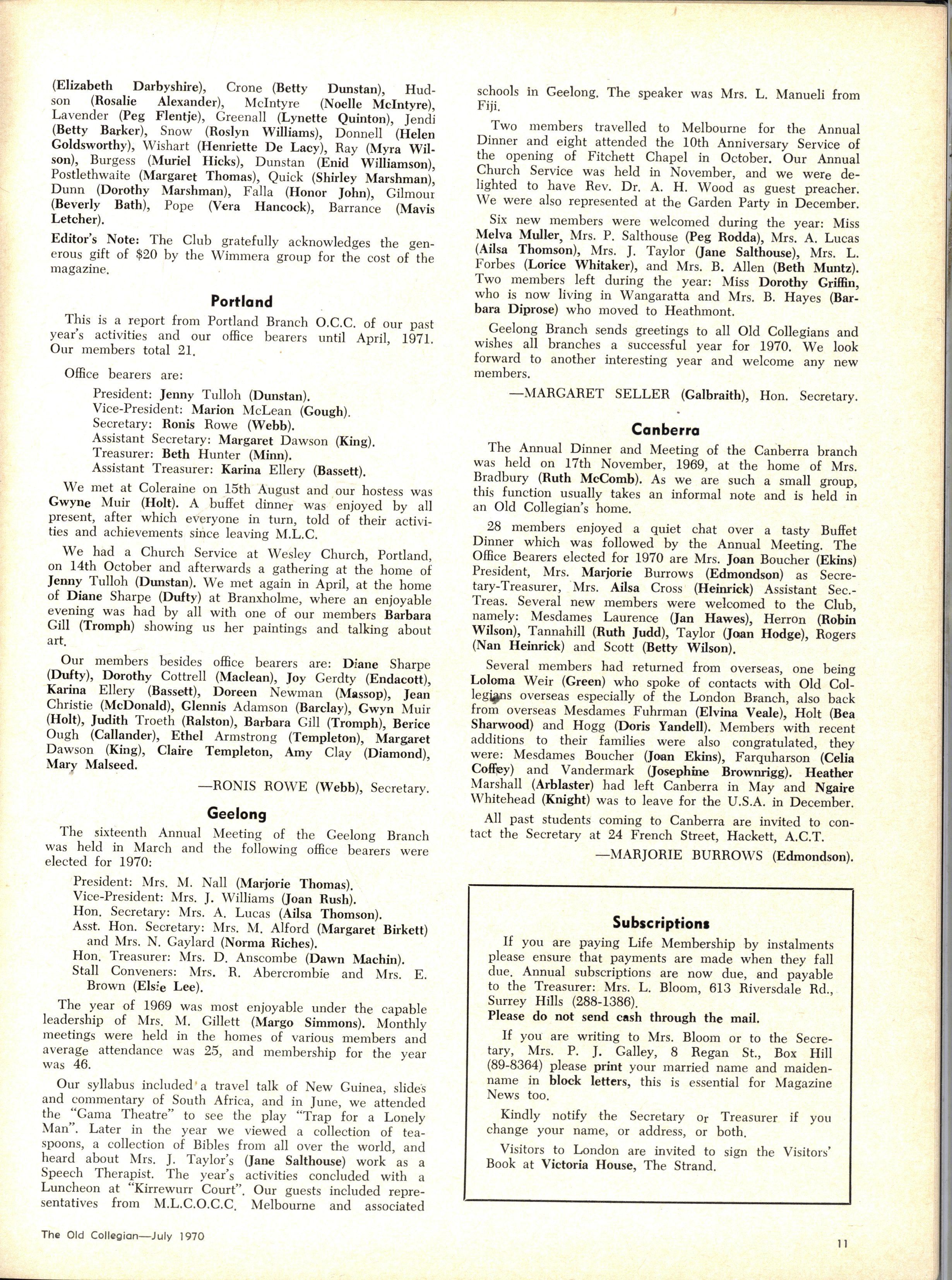 The School wishes to record its appreciation of the work of the following members of Staff who left at the end of 1969: Mrs J Blake, 2 years; Mrs P Broberg, B.Mus., B.A., 1 year; Mrs K Byas, B.A., 3 years; Mrs C Cooper, B.A., 1 year; Mrs V Davidson, 1 year; Miss W Eddy (Old Collegian), 14 years; Miss A Fraser (Old Collegian), 6 years; Miss A George, B.Sc., 1 year; Mrs I Halafoff, B.A., 6 years; Mrs S Harris, B.A., 1 term; Miss L Hawthorn (Old Collegian), 5 years; Mrs E Healey, B.A (Old Collegian), 5 years; Mrs M Hutchings, B.A., Dip.Ed., 2 terms; Mrs D Morris, 7 years; Mrs E Nevile, B.Juris., 1 year; Mrs D Pottage, 3 years; Mrs E Beid, B.A., 2 years; Miss A Russell, B.A., Dip.Ed (Old Collegian), 2 terms