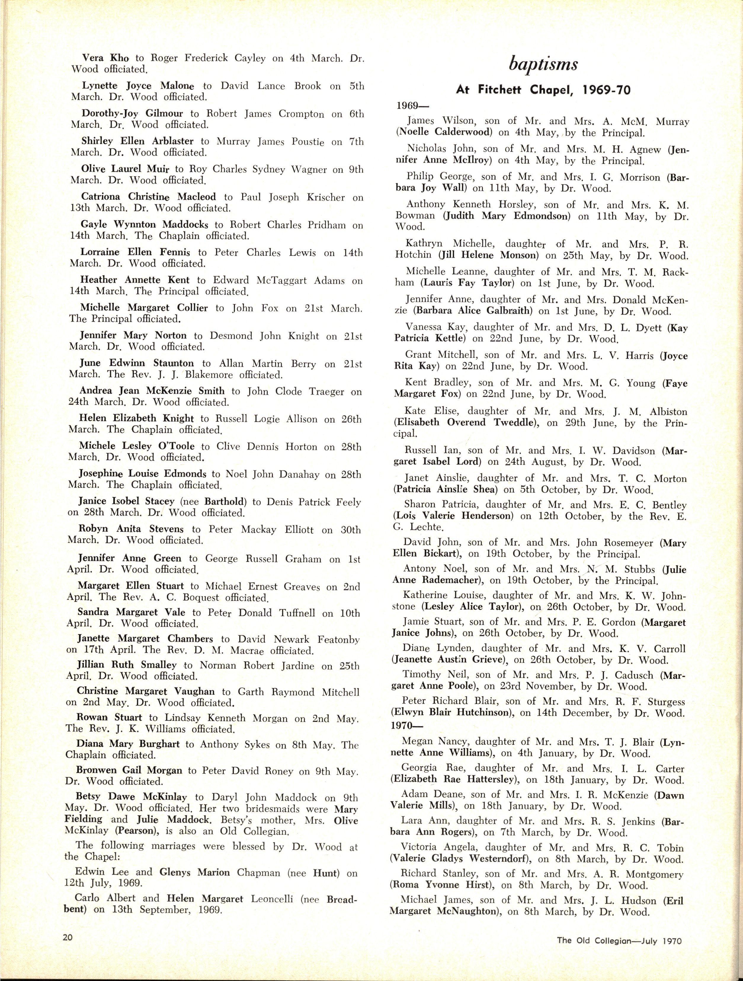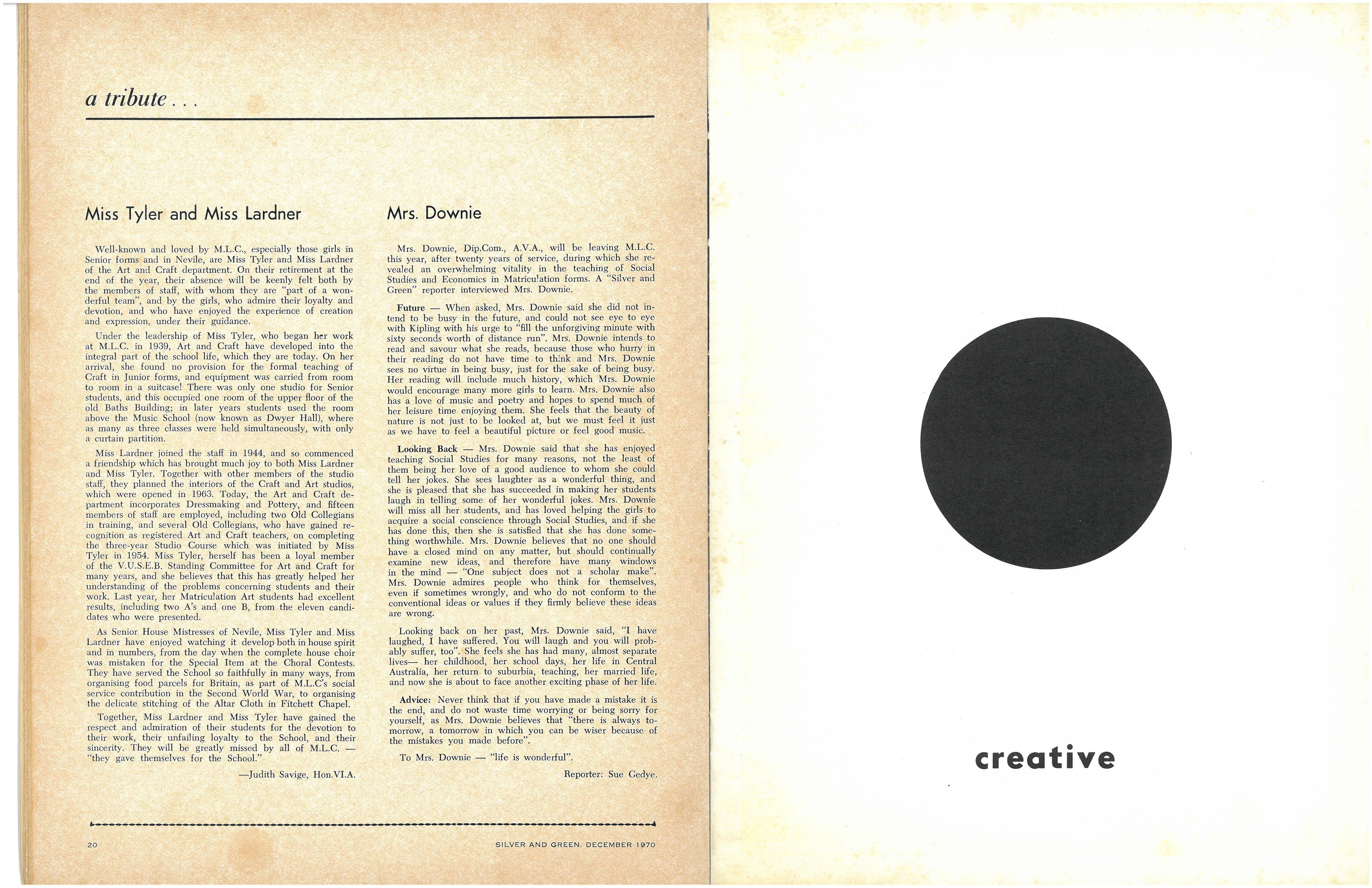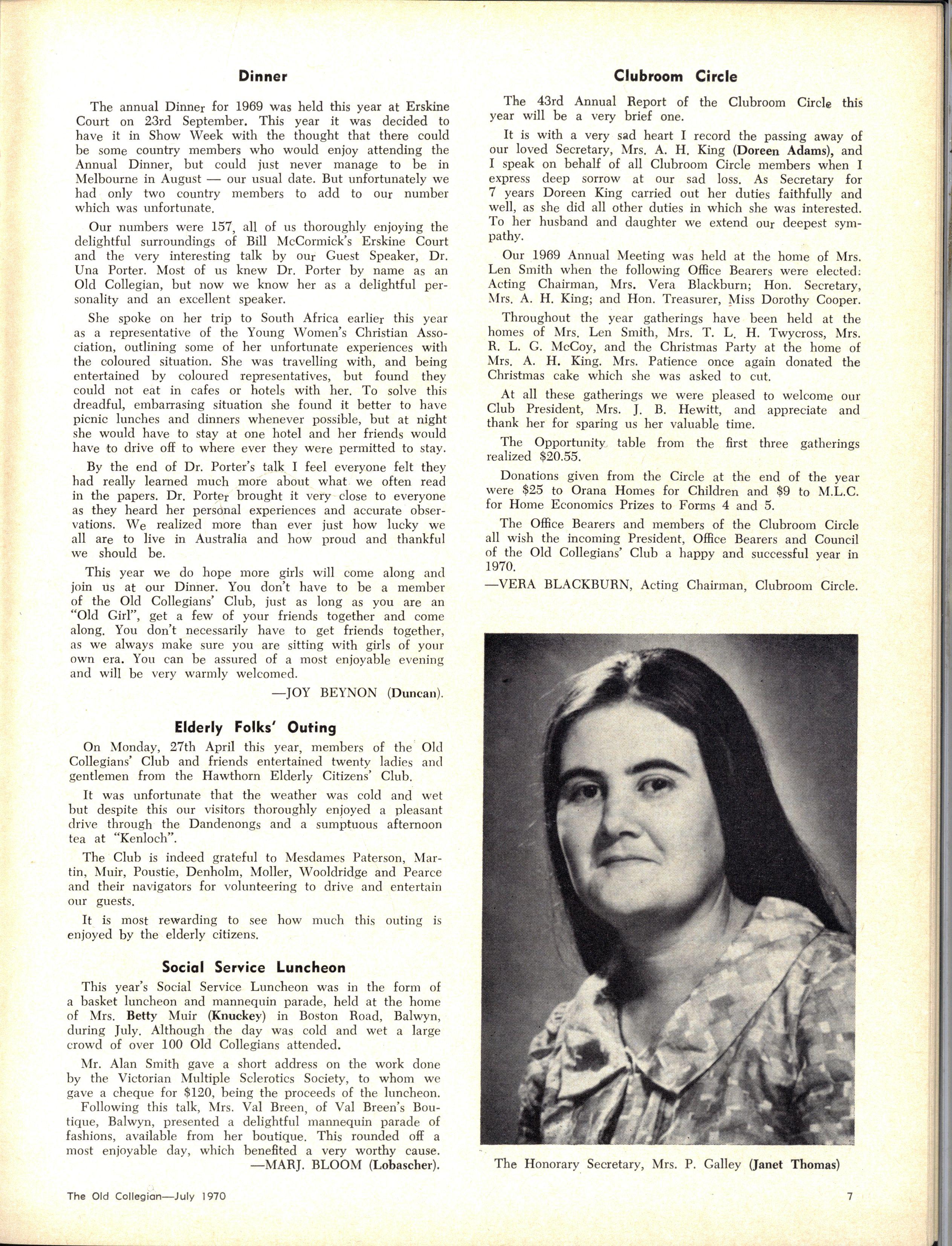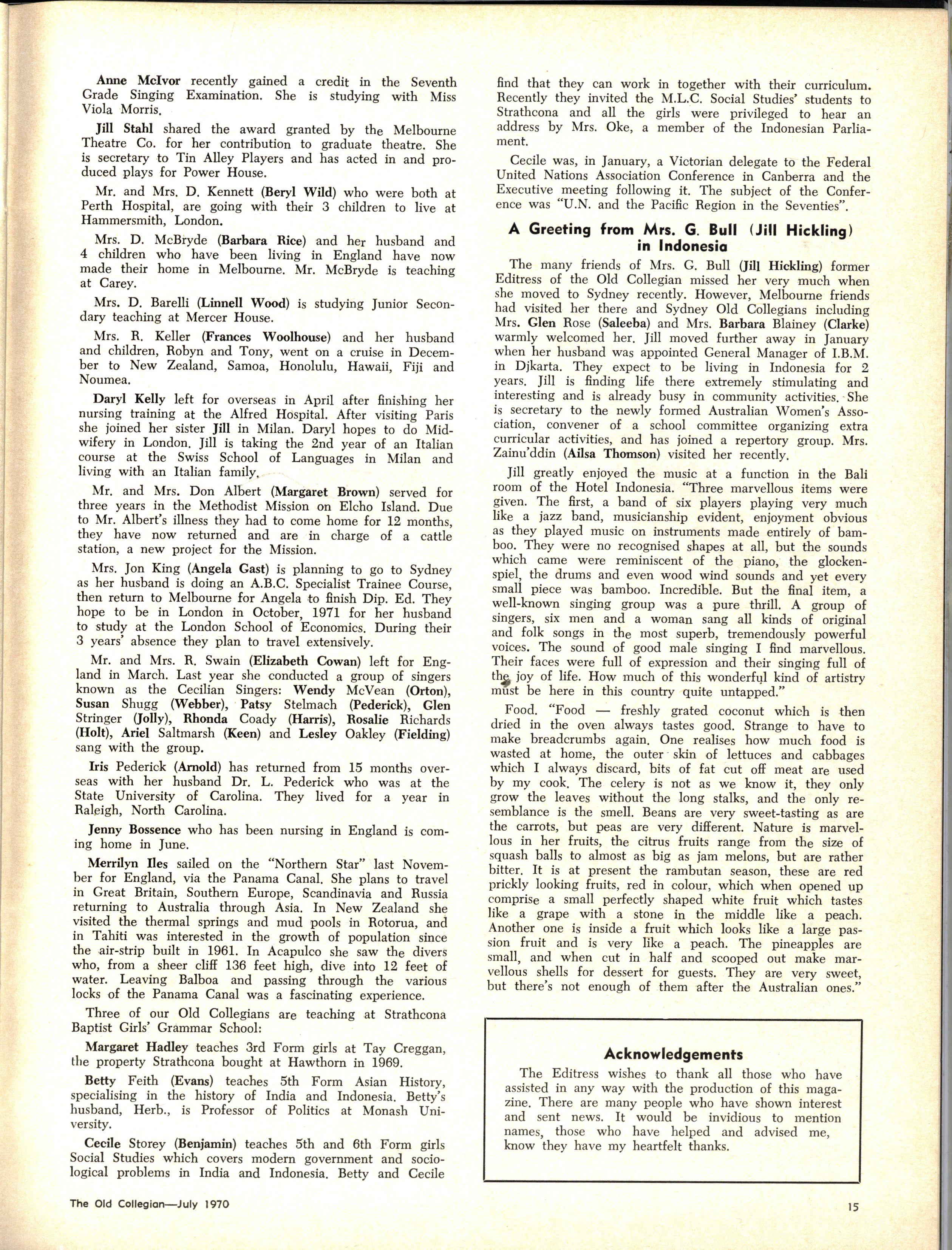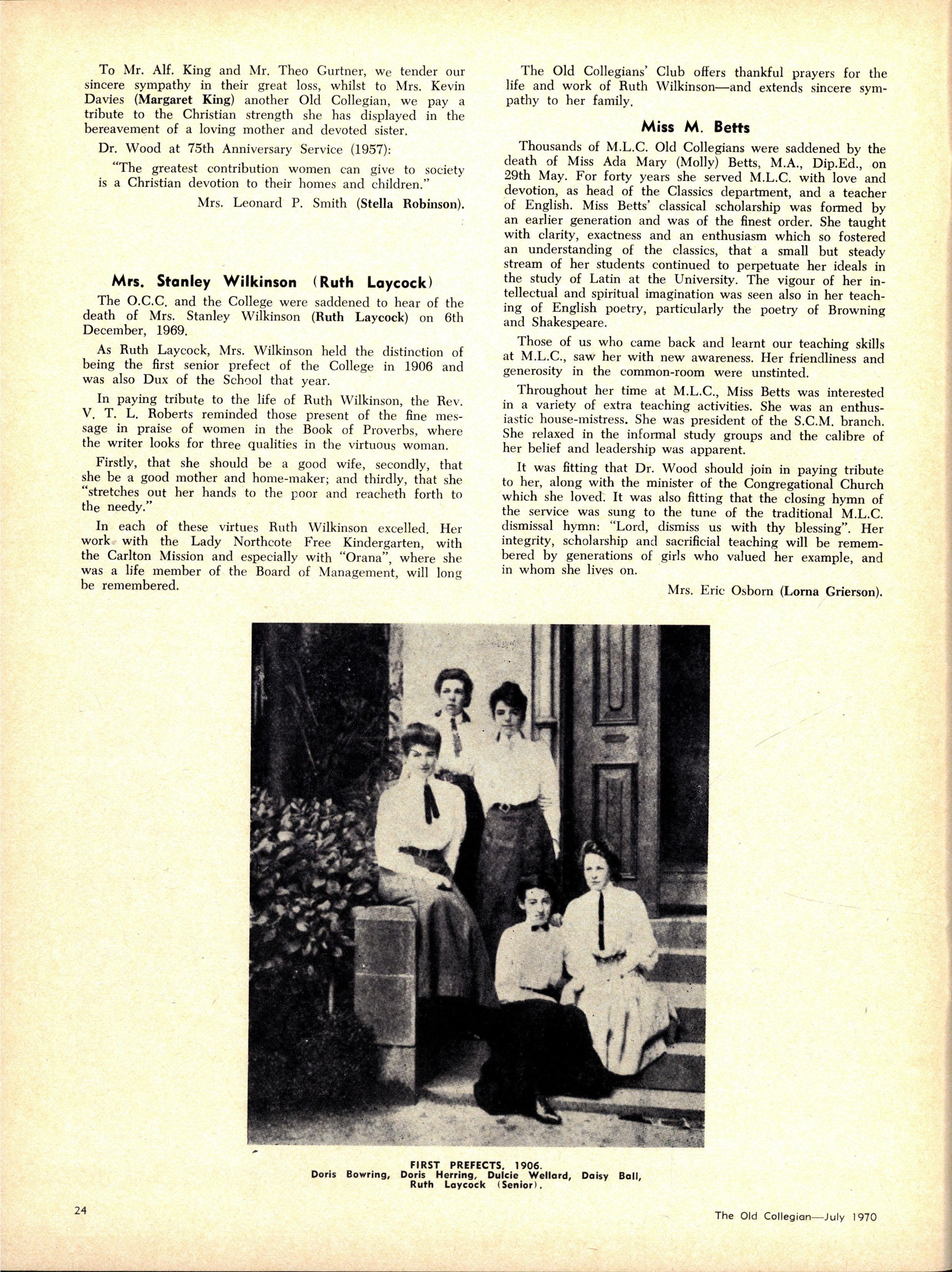 The School wishes to record its appreciation of the work of the following members of Staff who left at the end of 1969: Mrs J Blake, 2 years; Mrs P Broberg, B.Mus., B.A., 1 year; Mrs K Byas, B.A., 3 years; Mrs C Cooper, B.A., 1 year; Mrs V Davidson, 1 year; Miss W Eddy (Old Collegian), 14 years; Miss A Fraser (Old Collegian), 6 years; Miss A George, B.Sc., 1 year; Mrs I Halafoff, B.A., 6 years; Mrs S Harris, B.A., 1 term; Miss L Hawthorn (Old Collegian), 5 years; Mrs E Healey, B.A (Old Collegian), 5 years; Mrs M Hutchings, B.A., Dip.Ed., 2 terms; Mrs D Morris, 7 years; Mrs E Nevile, B.Juris., 1 year; Mrs D Pottage, 3 years; Mrs E Beid, B.A., 2 years; Miss A Russell, B.A., Dip.Ed (Old Collegian), 2 terms