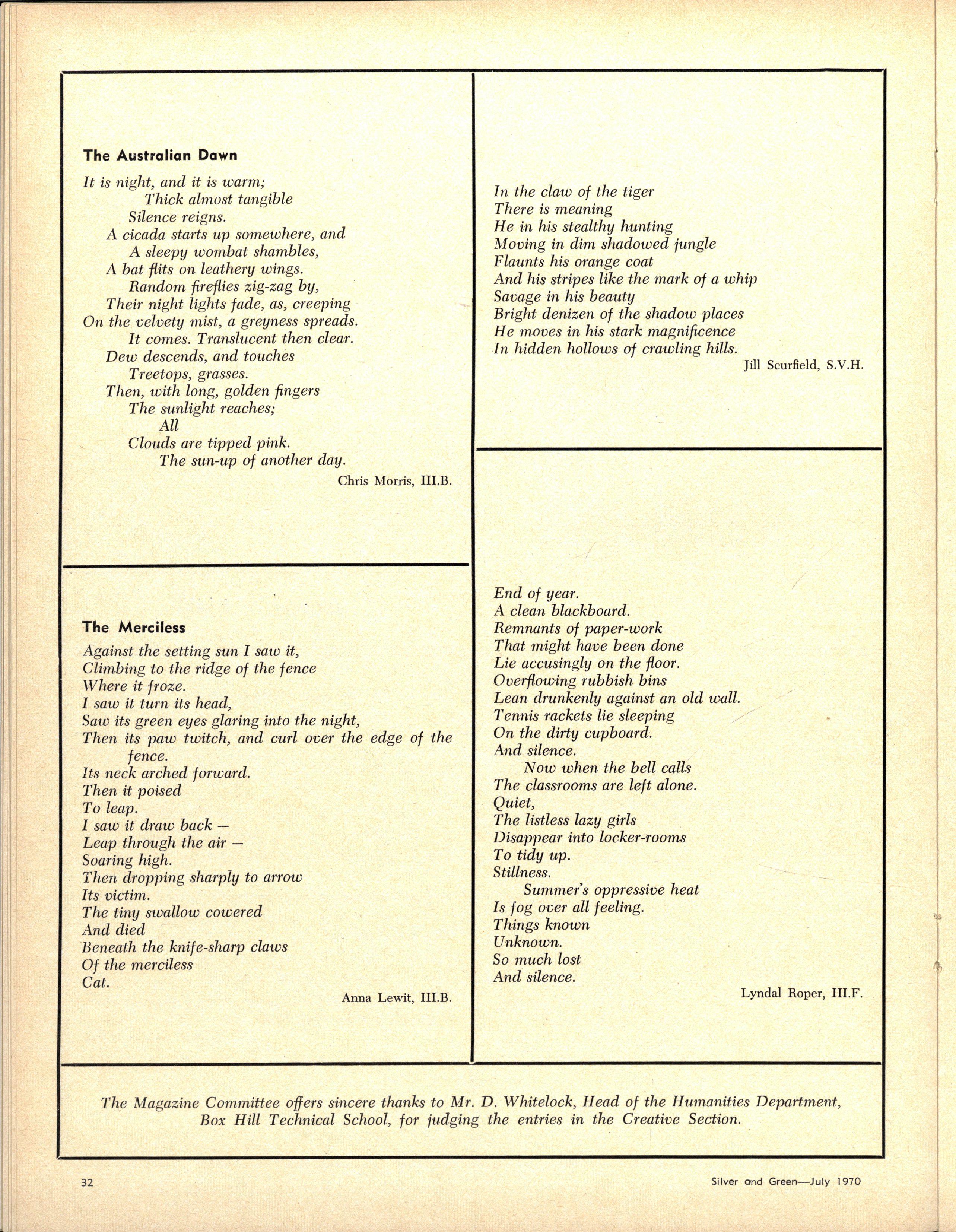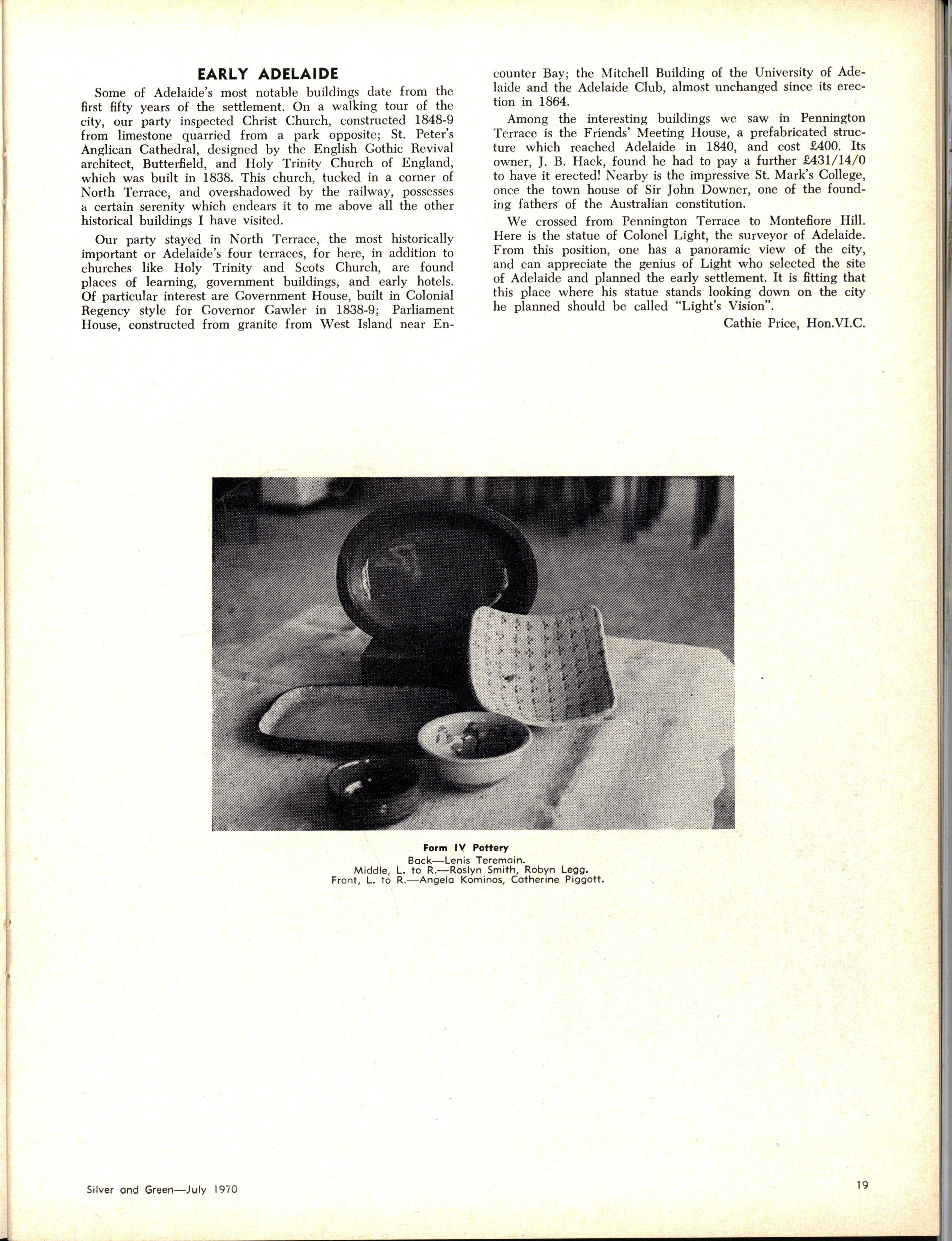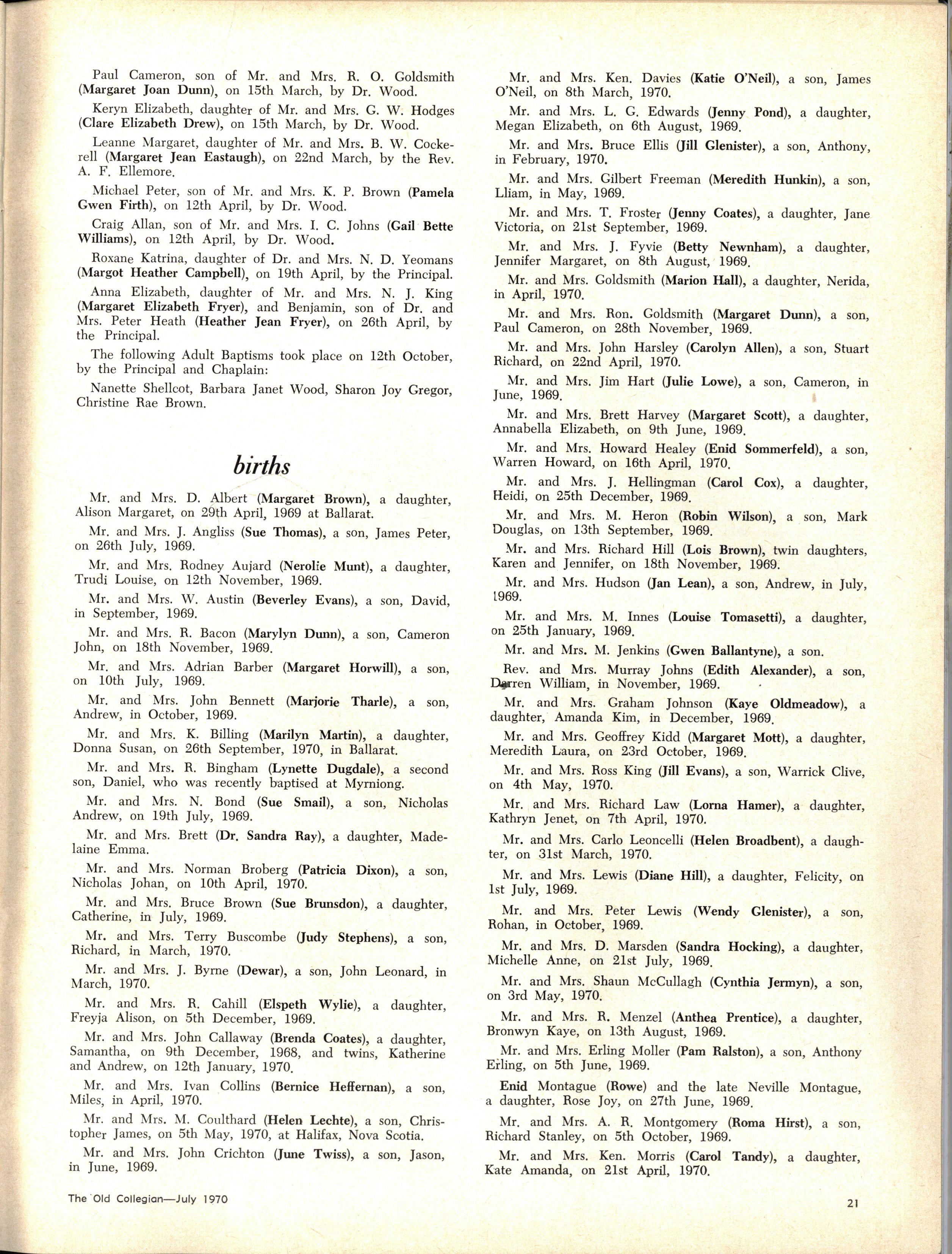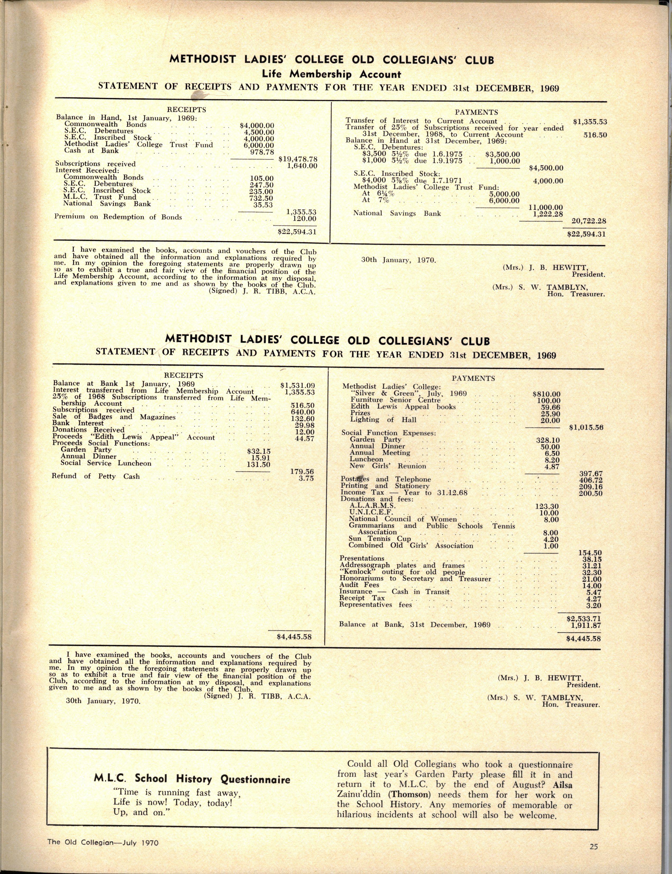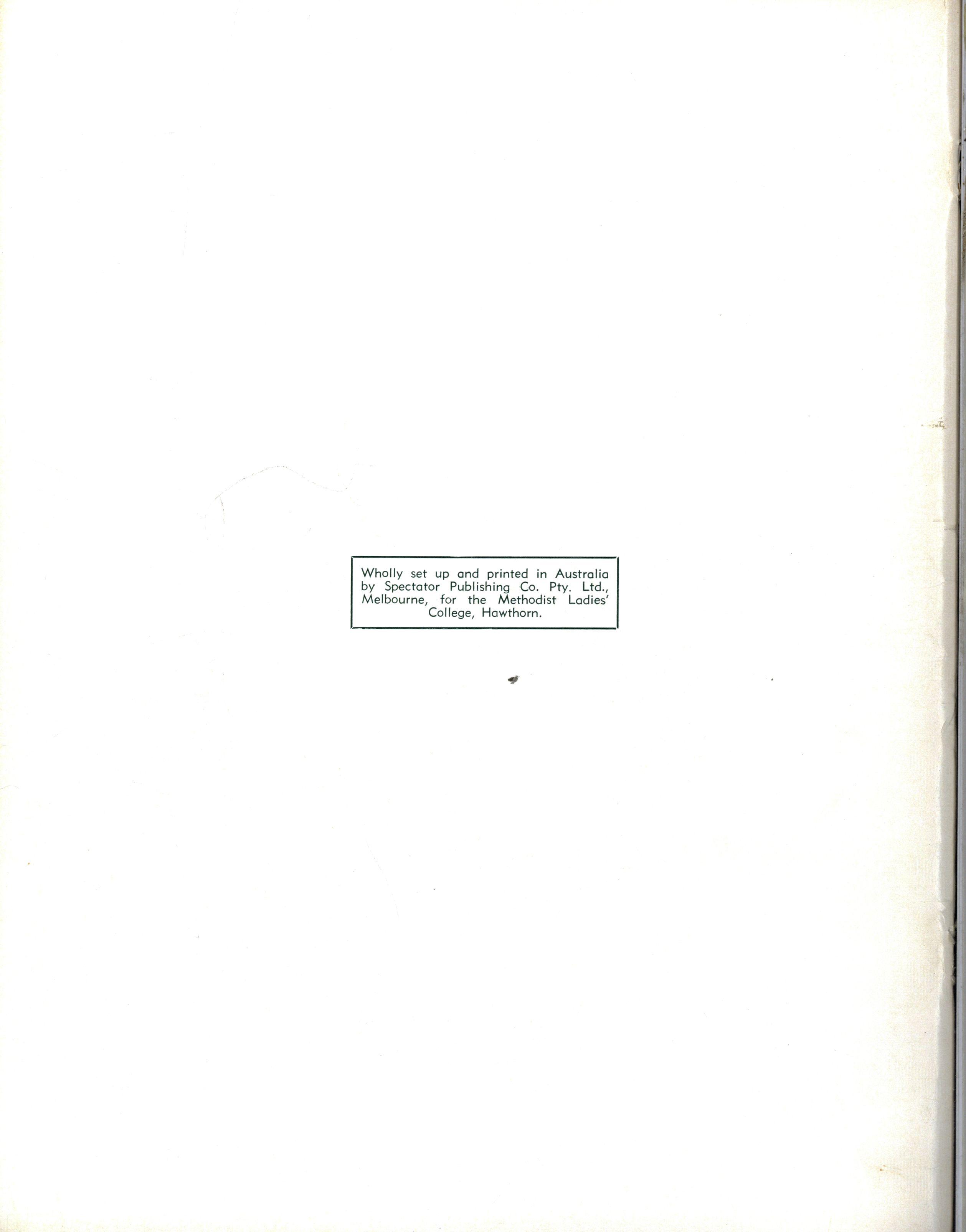 The School wishes to record its appreciation of the work of the following members of Staff who left at the end of 1969: Mrs J Blake, 2 years; Mrs P Broberg, B.Mus., B.A., 1 year; Mrs K Byas, B.A., 3 years; Mrs C Cooper, B.A., 1 year; Mrs V Davidson, 1 year; Miss W Eddy (Old Collegian), 14 years; Miss A Fraser (Old Collegian), 6 years; Miss A George, B.Sc., 1 year; Mrs I Halafoff, B.A., 6 years; Mrs S Harris, B.A., 1 term; Miss L Hawthorn (Old Collegian), 5 years; Mrs E Healey, B.A (Old Collegian), 5 years; Mrs M Hutchings, B.A., Dip.Ed., 2 terms; Mrs D Morris, 7 years; Mrs E Nevile, B.Juris., 1 year; Mrs D Pottage, 3 years; Mrs E Beid, B.A., 2 years; Miss A Russell, B.A., Dip.Ed (Old Collegian), 2 terms