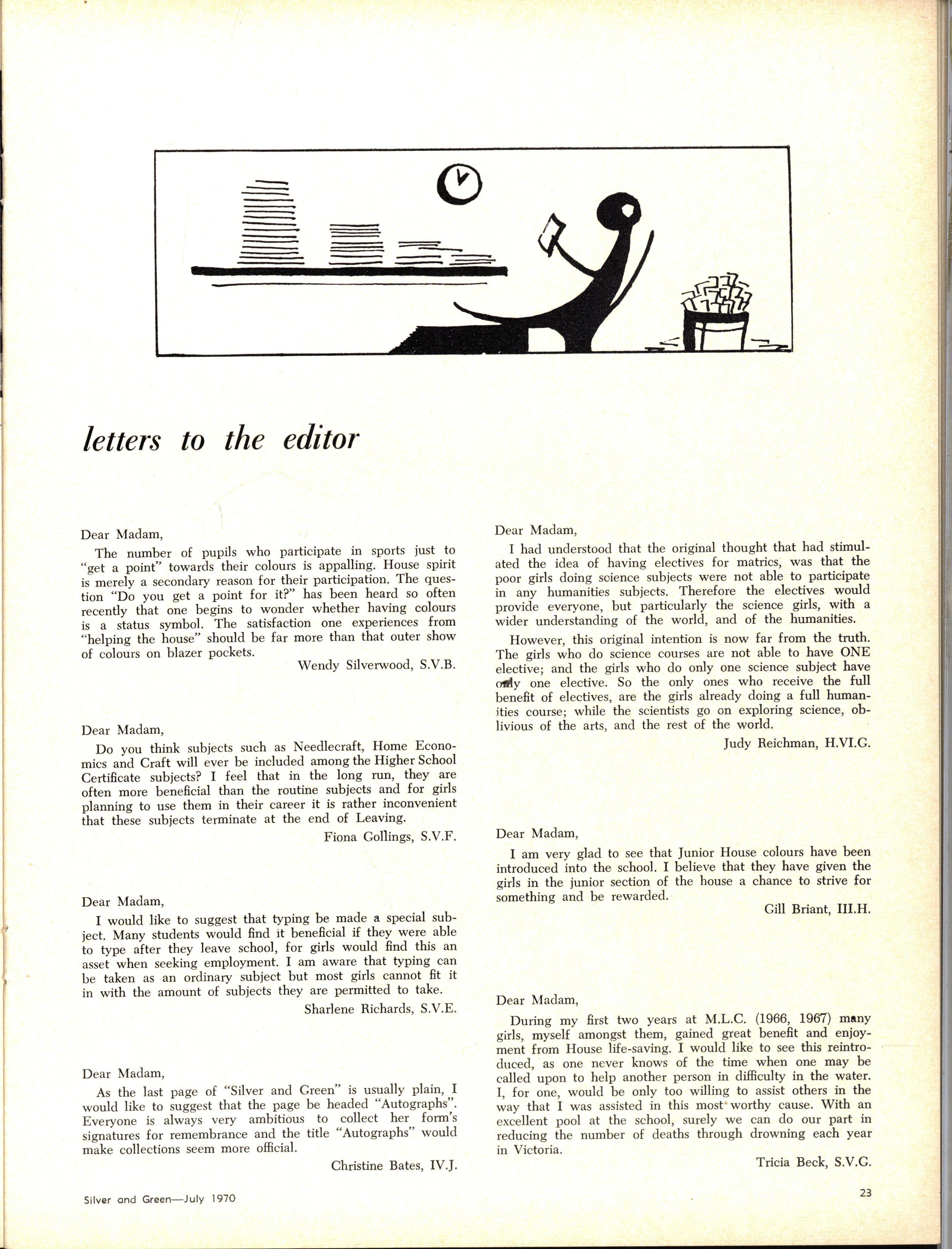 Finally, I would like to congratulate everyone who took part in any Inter-House or Inter-School competition this term and hope that they feel they have benefited from the experience All those who have not, try next term, and you are ensured of the companionship and fellowship of other girls with similar interests, and you will definitely benefit by the experience