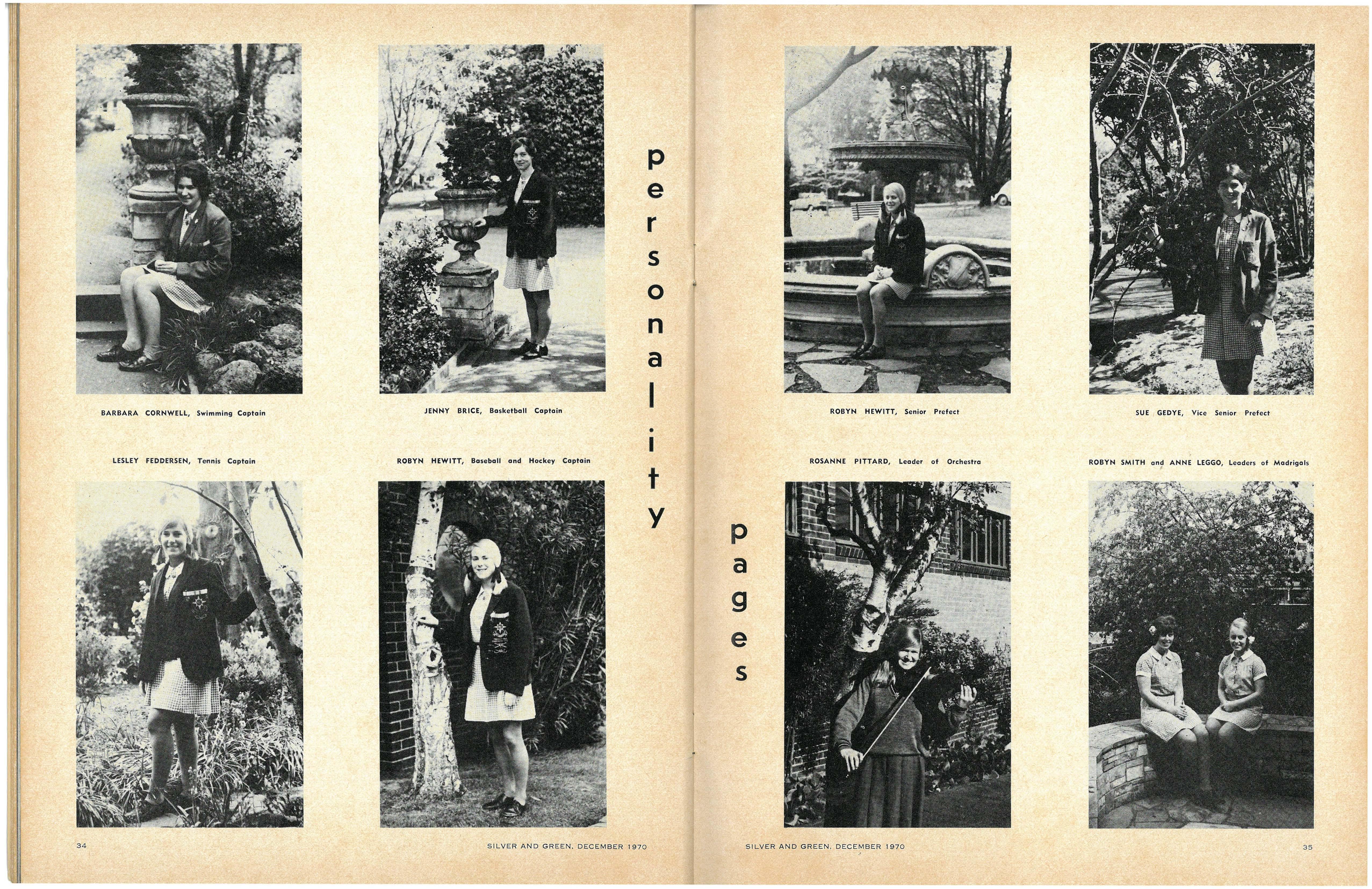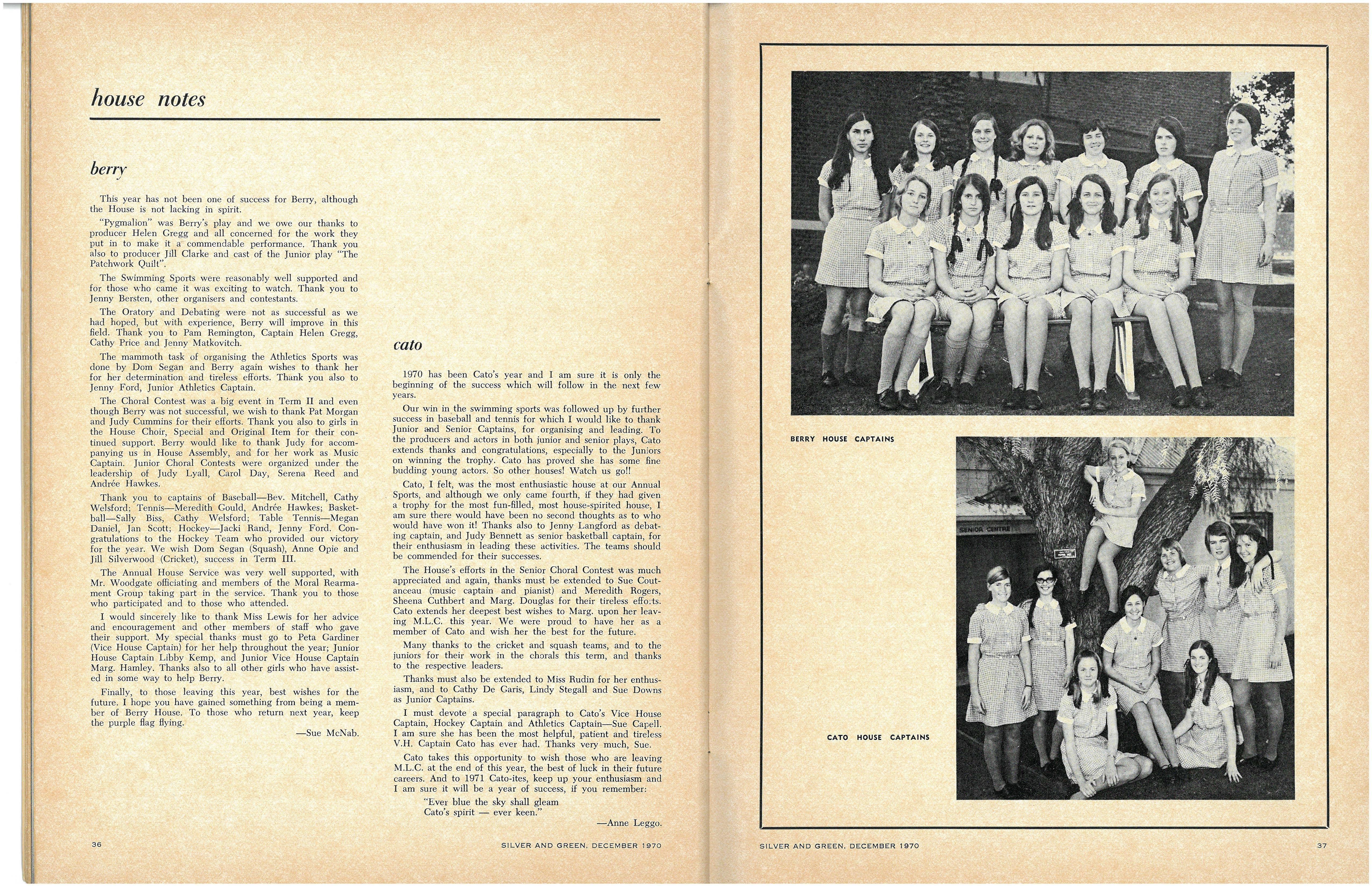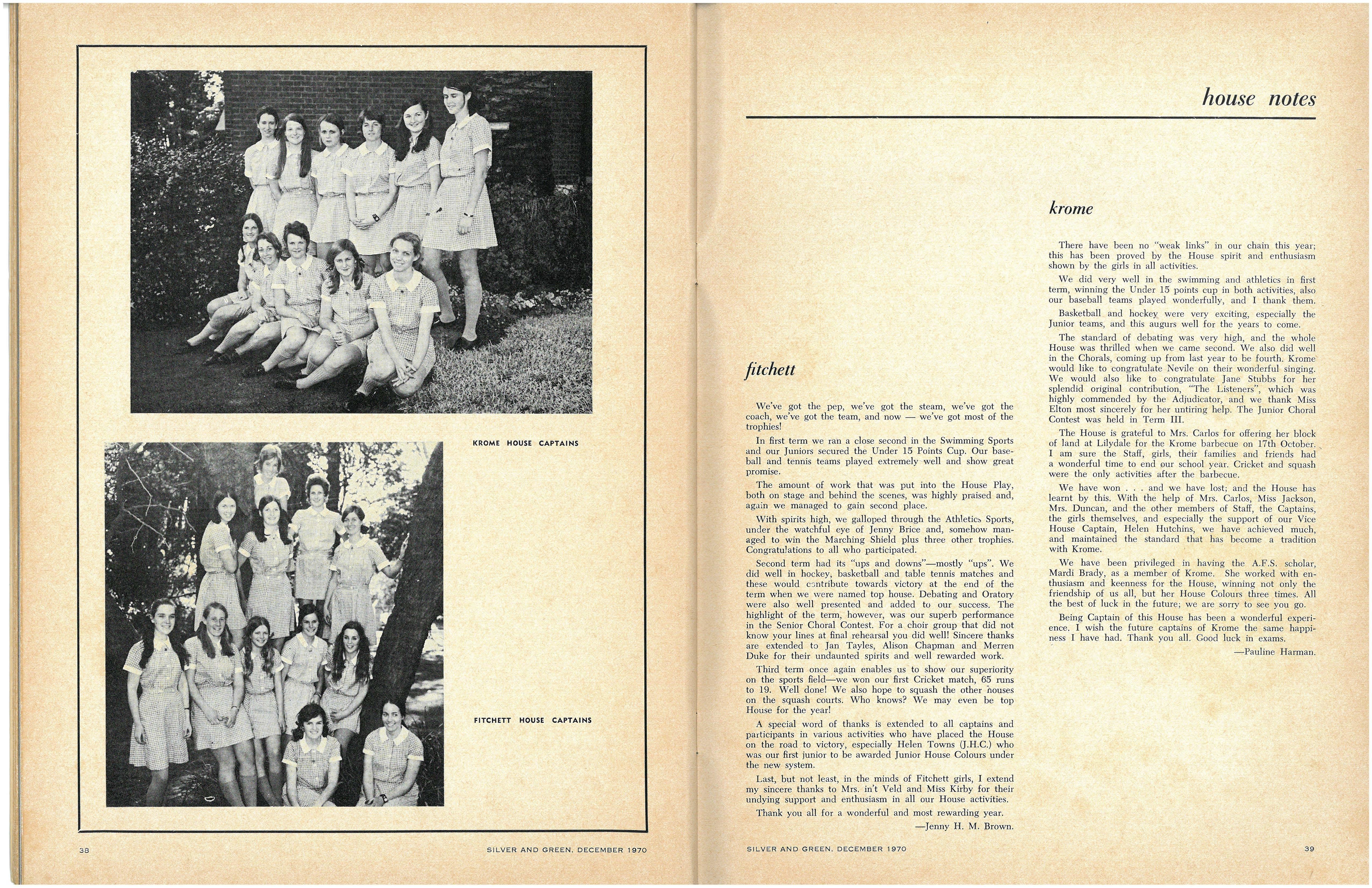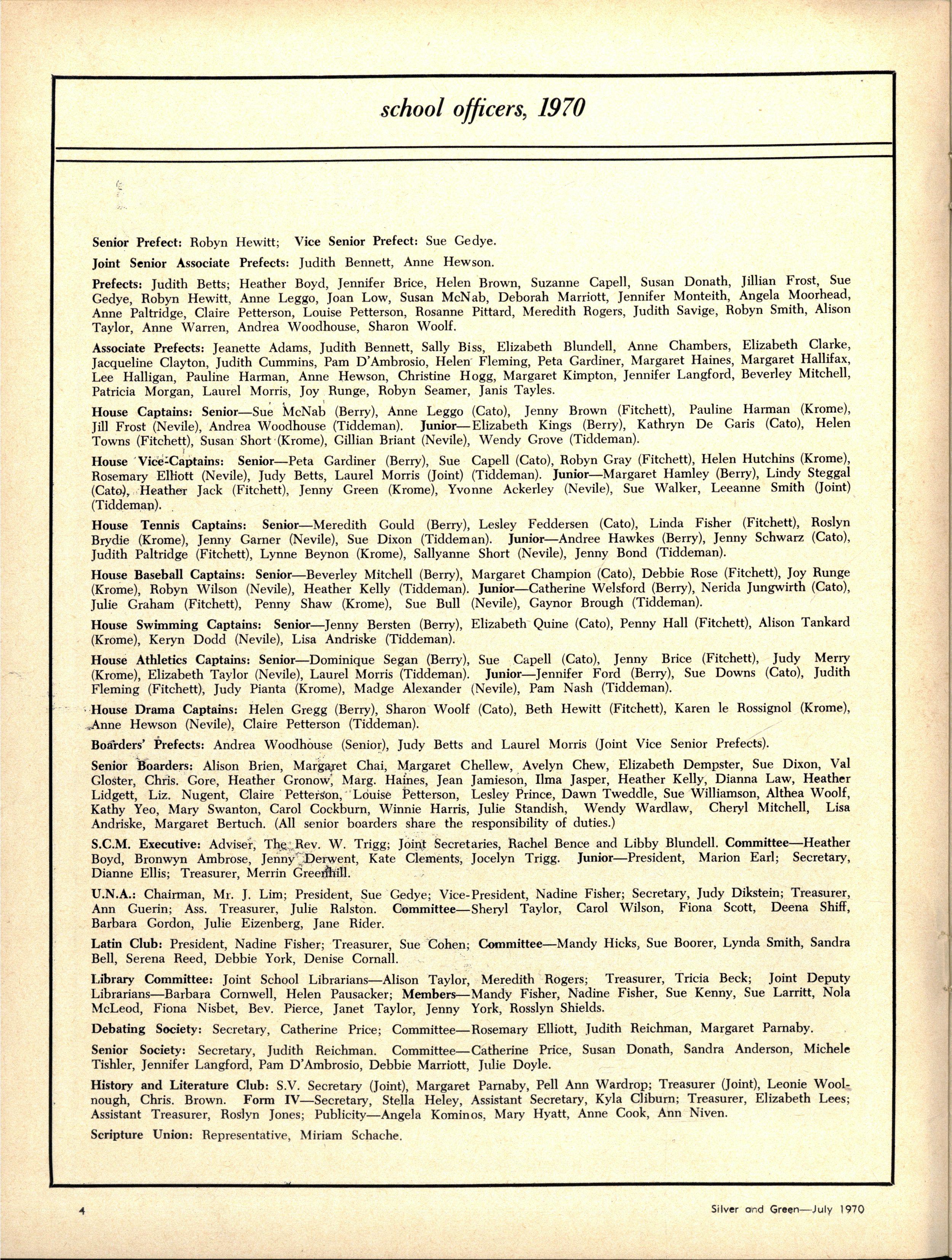 House Captains: Senior—Sue McNab (Berry), Anne Leggo (Cato), Jenny Brown (Fitchett), Pauline Harman (Krome), Jill Frost (Nevile), Andrea Woodhouse (Tiddeman) Junior—Elizabeth Kings (Berry), Kathryn De Garis (Cato), Helen Towns (Fitchett), Susan Short (Krome), Gillian Briant (Nevile), Wendy Grove (Tiddeman)